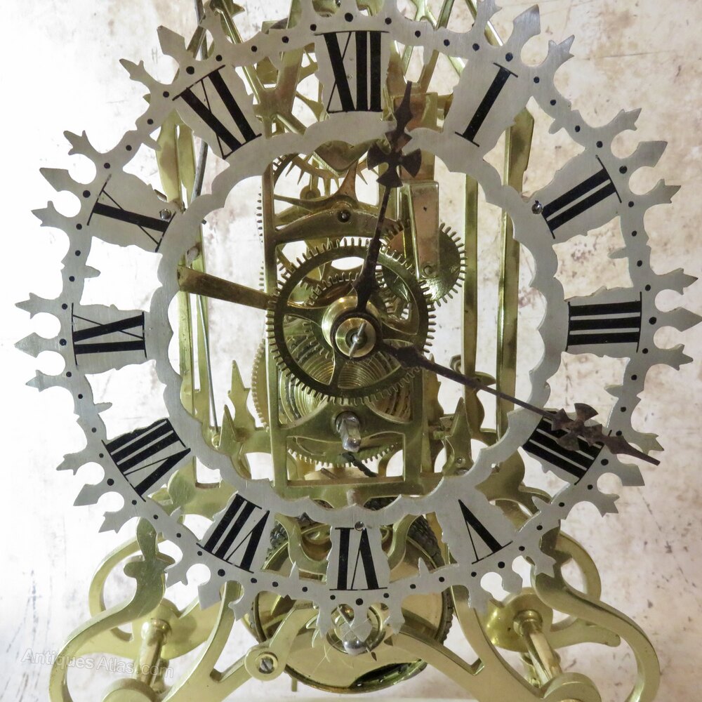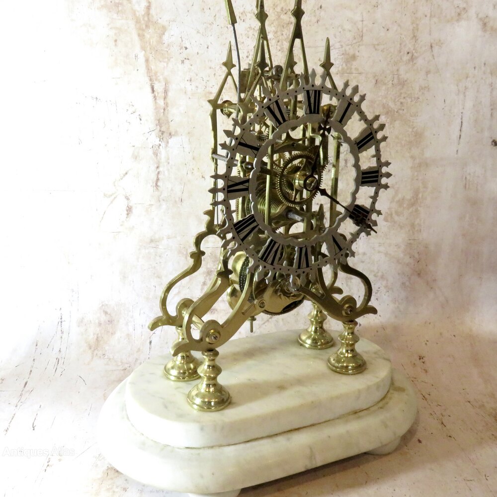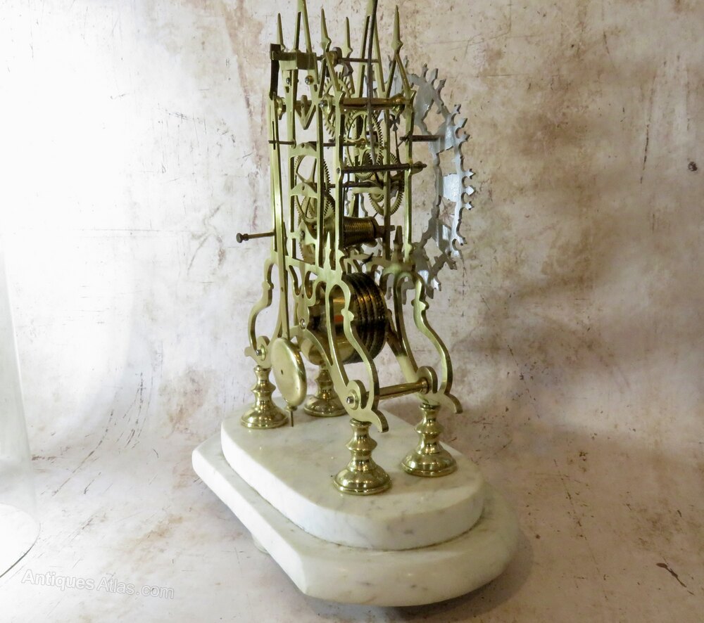 An elegant early 20th-century (or very late 19thC) brass skeleton clock presented in its original glass dome. The finely cut brass frame and exposed movement showcase the intricate workings, and a bell & hammer mechanism strikes once per hour.Raised on its original white marble plinth, this decorative clock reflects the enduring appeal of traditional horology. The origins of the skeleton clock goes back to the days of seven year apprenticeships. As their last piece the apprentice would hand-make every aspect of a skeleton clock, from the frame to the chain and every wheel and cog in between, so that an adjudicator could judge their skills without having to look around, or remove, a case.