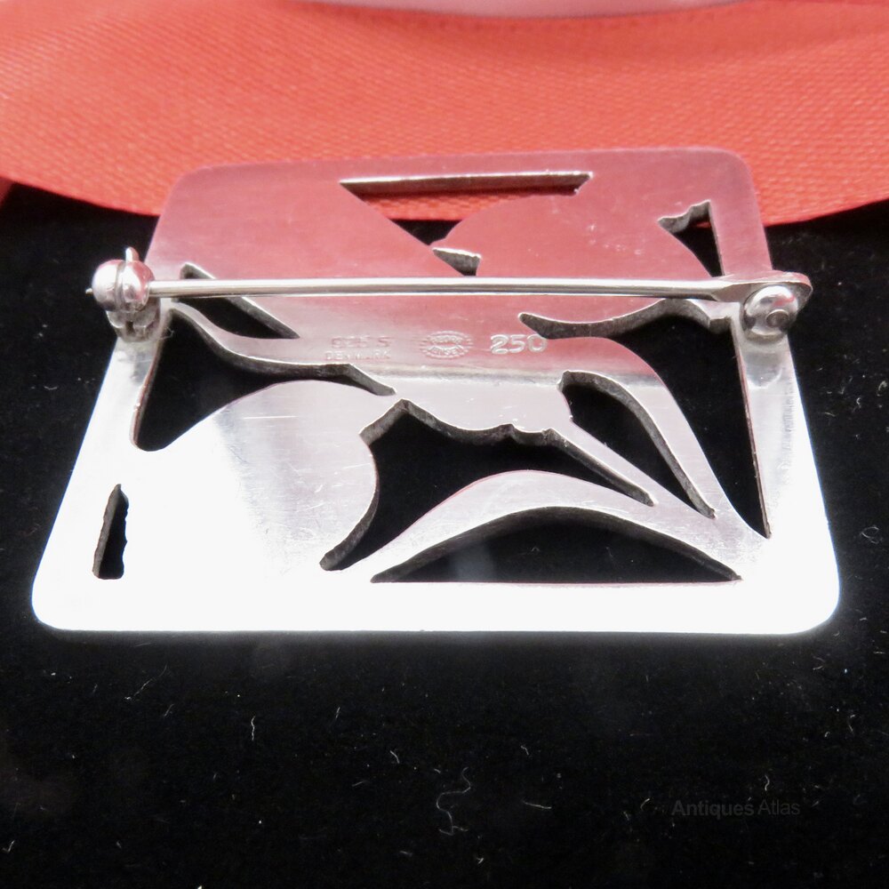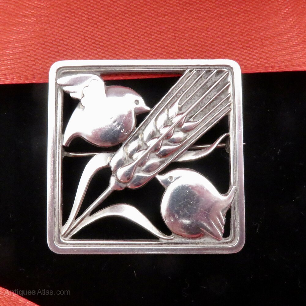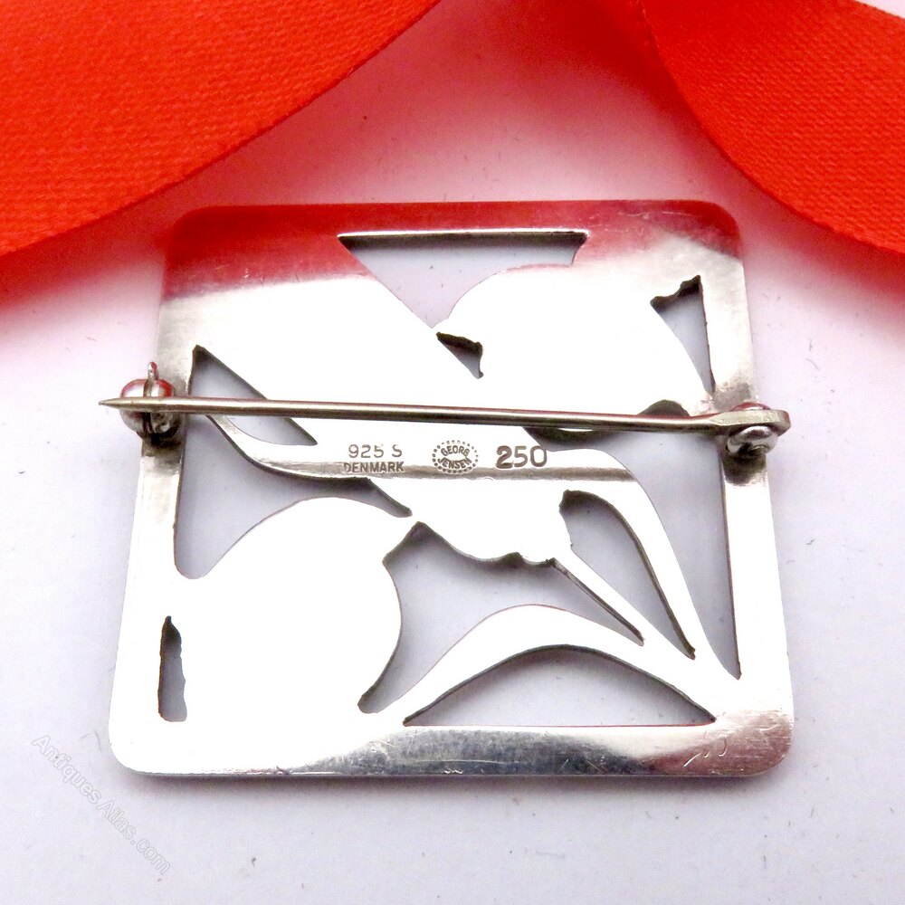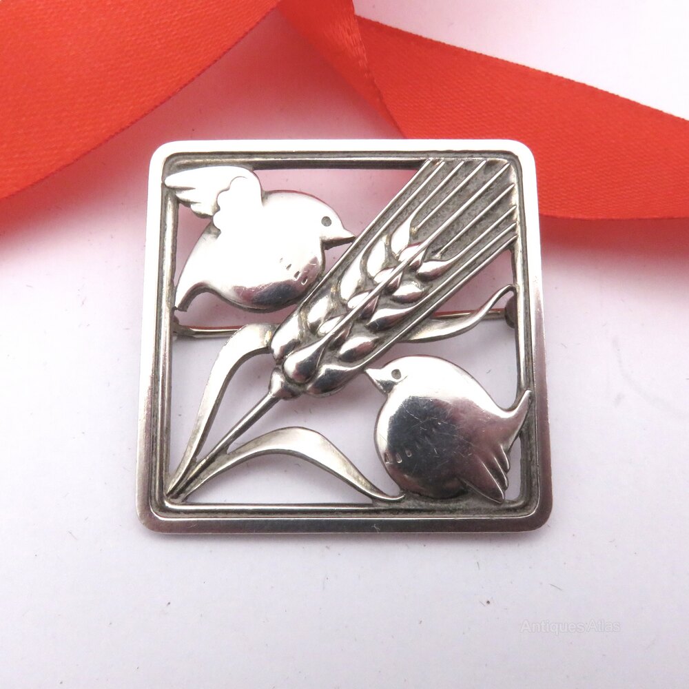A fine Georg Jensen sterling silver brooch, design 250, featuring two stylised birds and wheat ears, beautifully framed in a square Art Deco design. This vintage Scandinavian brooch showcases all of Jensen’s renowned classic Danish design and craftsmanship, as well as a timeless modernist aesthetic. Ideal for collectors of Georg Jensen jewellery or lovers of Nordic silver, it is fully hallmarked with the post 1945 mark. It has no import marks, so may have been purchased in Copenhagen.Condition of this popular brooch is very good indeed, with a strong bar at the back and a rotating catch in FWO. It is absolutely ready to wear and would make a wonderful gift or a fabulous addition to any collection.
