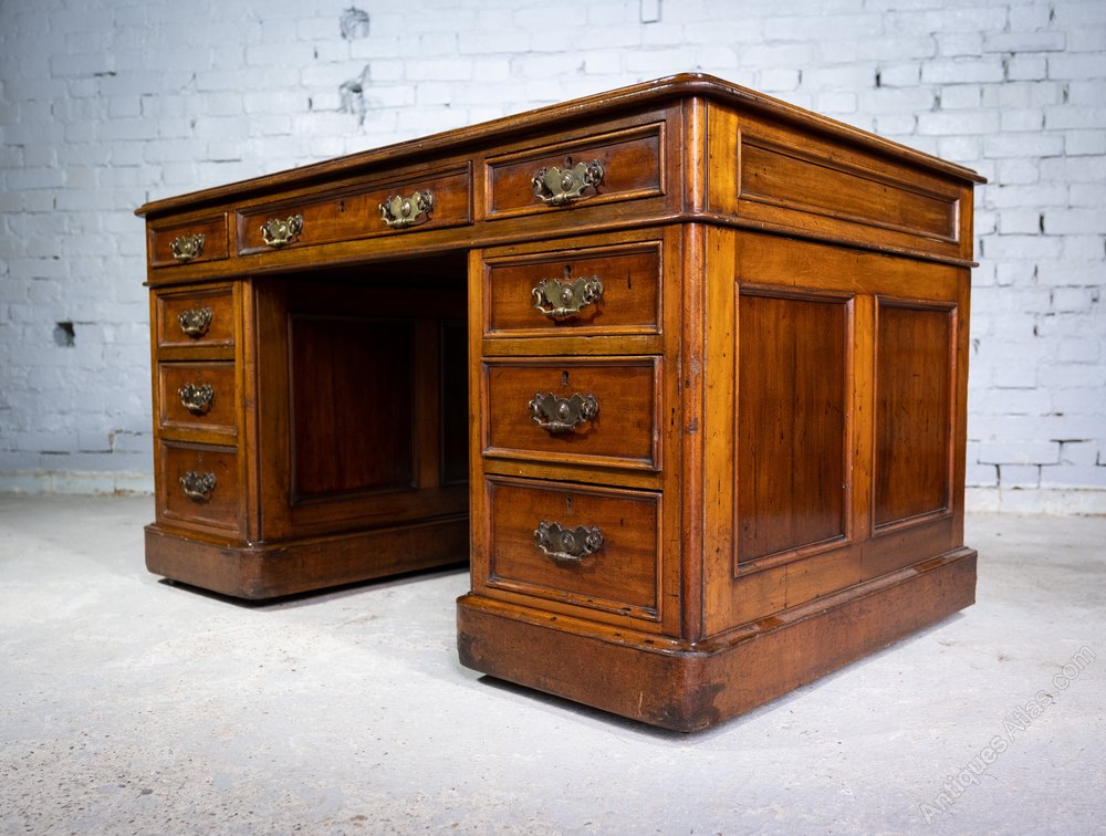 A very attractive 19th century mahogany pedestal desk stamped 'Newson & Co, London' with a Victoria Regina crest to every drawer lock.The black leather inlaid rectangular top sits above two pedestals with original castors to the base of each pedestal. The desk has nine drawers in total, each with the original lock and handle. The rear and sides of the desk are attractively panelled.