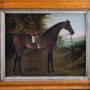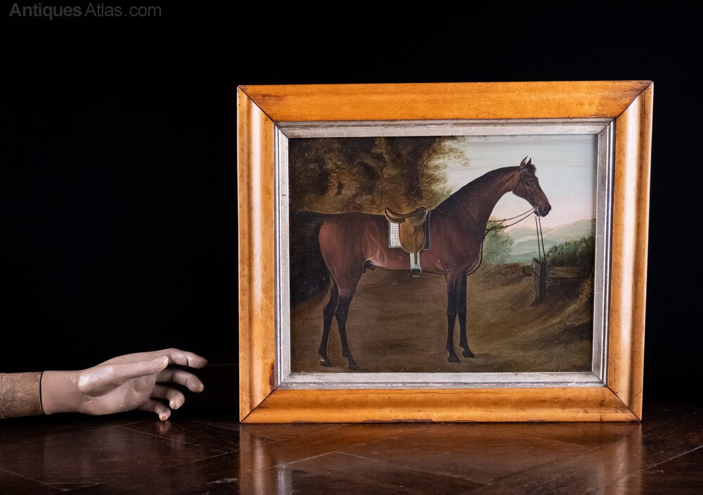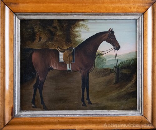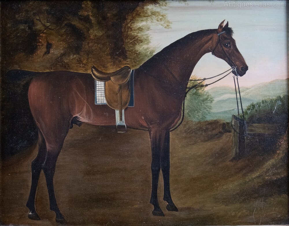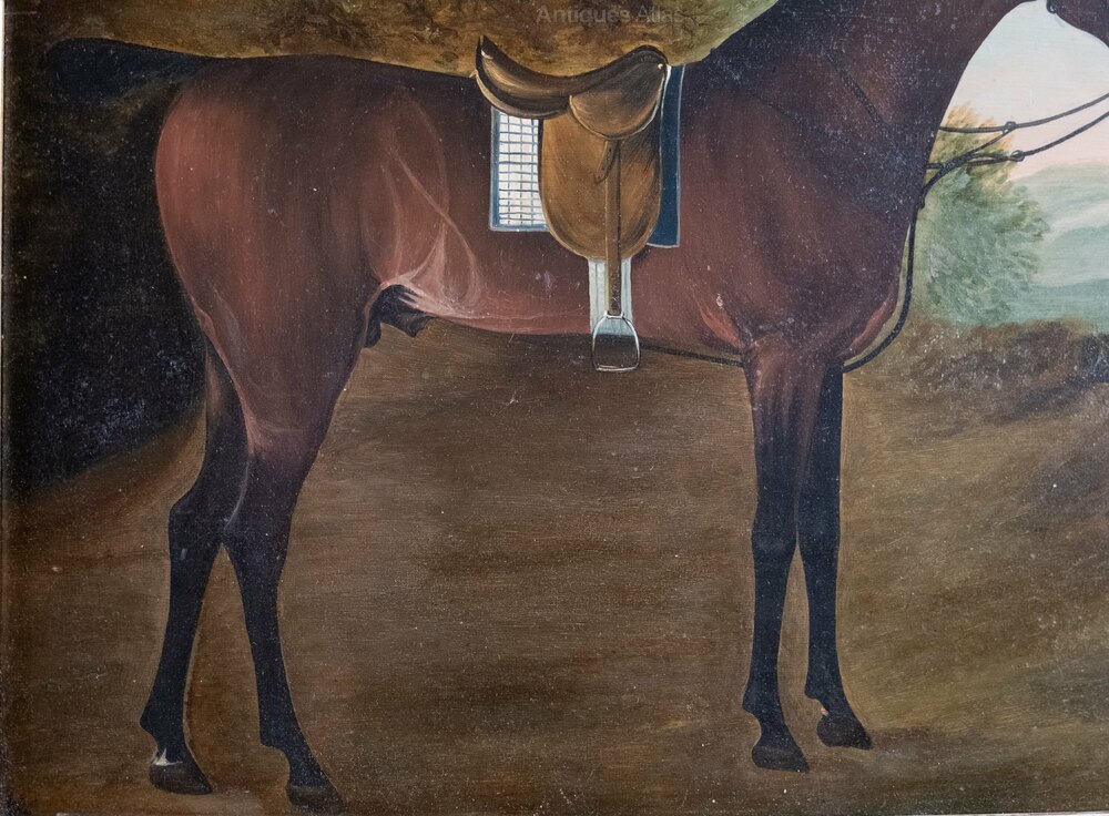 An early 19th century portrait of a bay hunter horse. Oil on panel. Probably English School. Unsigned.The Bay horse is stood in a rural landscape with rolling hills to the background. The horse is in full saddlery and gazing out of the portrait. There is a small area of paint loss to one ear and some very small scratches in places but generally the work displays very well.