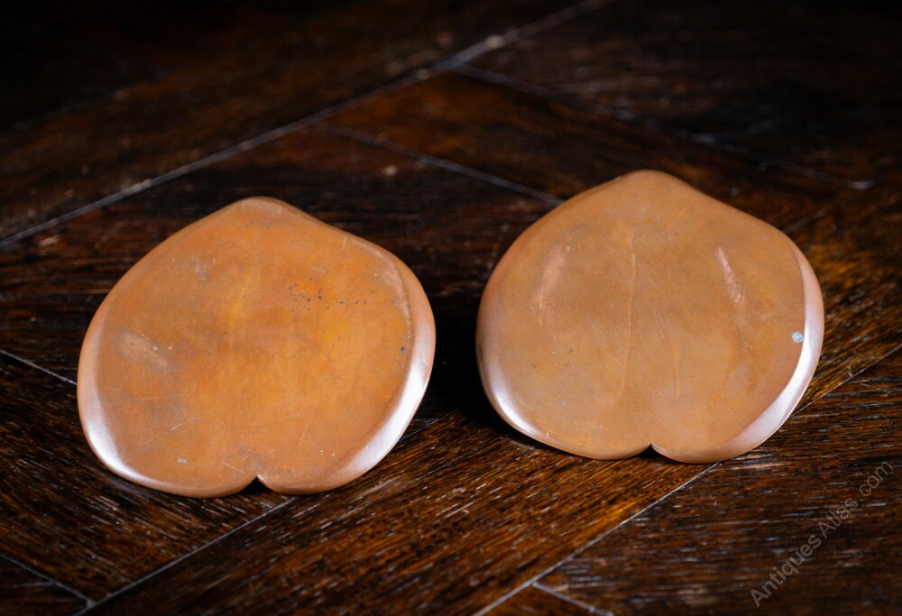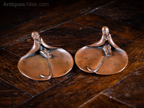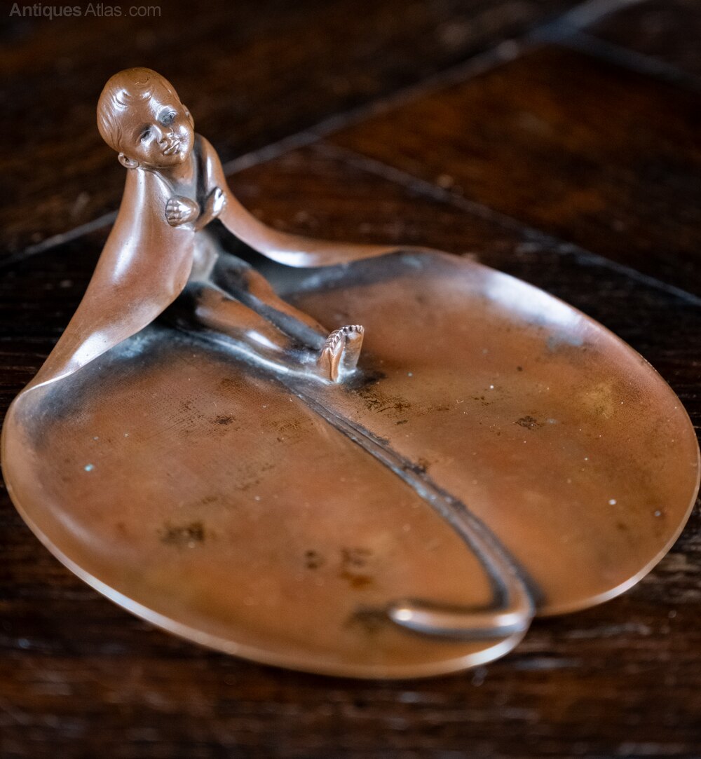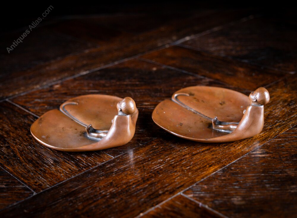A delightful pair of bronze art nouveau dishes, c.1900.Each dish is finely cast in the form of a leaf with an infant wrapping the leaf tip around itself.