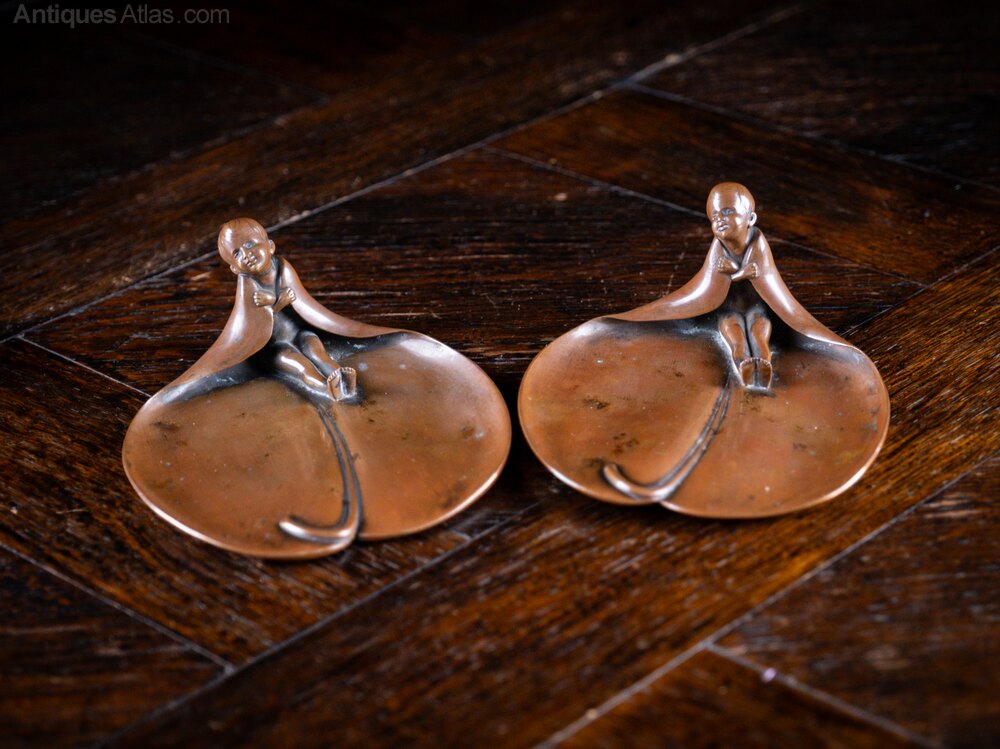 Pair of Art Nouveau Bronze 'Child In Leaf' Dishes
