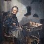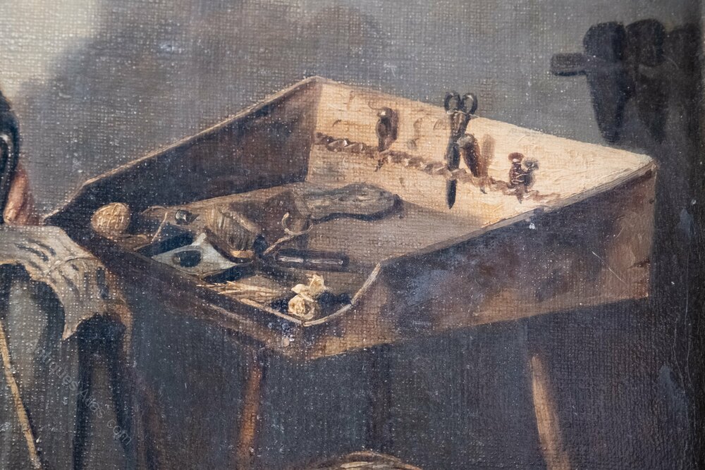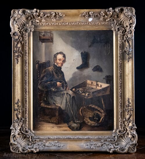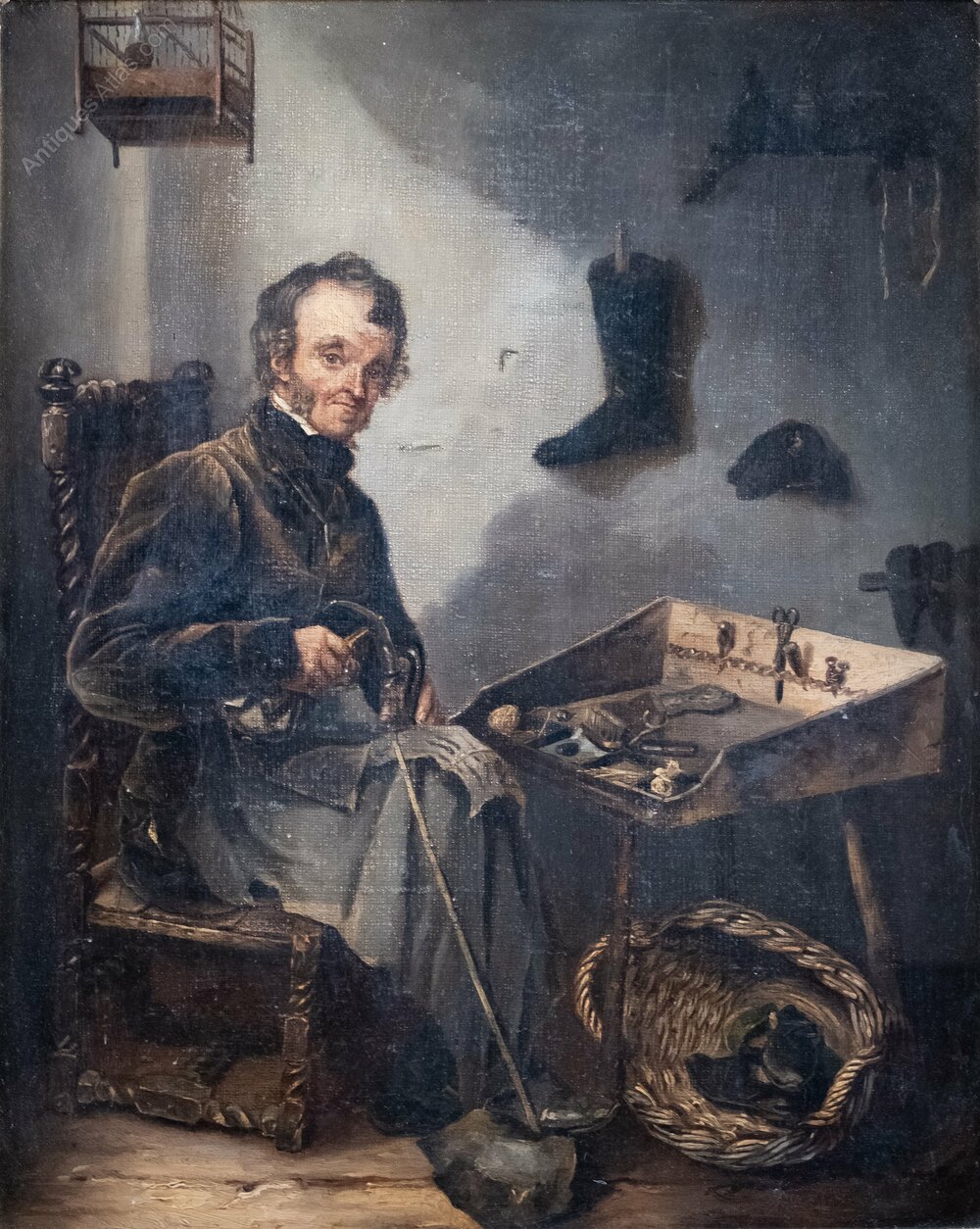 A fantastic 19th century oil on canvas depicting a cobbler.The cobbler is seated at his table with shoe and hammer in hand, a bird cage above, tools upon the table and a basket of shoes beneath it. The attention to detail throughout is exceptional with feature considered and carefully depicted.