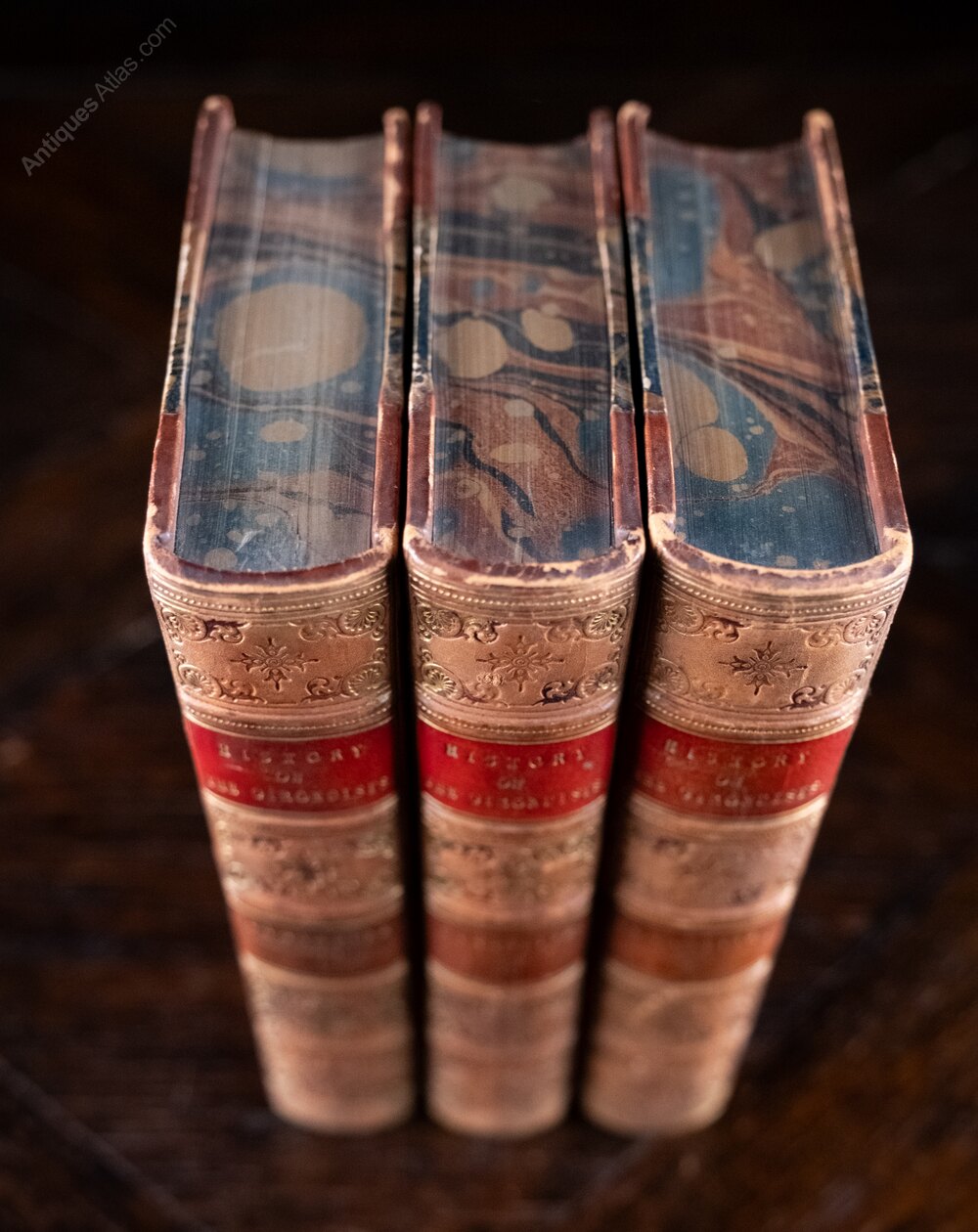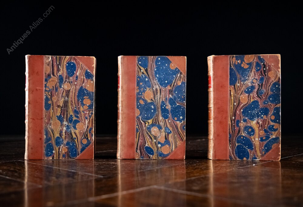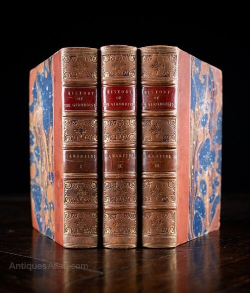'The History Of The Girondists' by Alphonse De Lamartine, published by Henry G. Bohn, London in 1856. Complete in three volumes.Three quarter bound tan leather with five raised bands and red leather title and volume panels. Marbled boards. There is some light shelf wear to the extremities in some areas but generally all volumes display well.