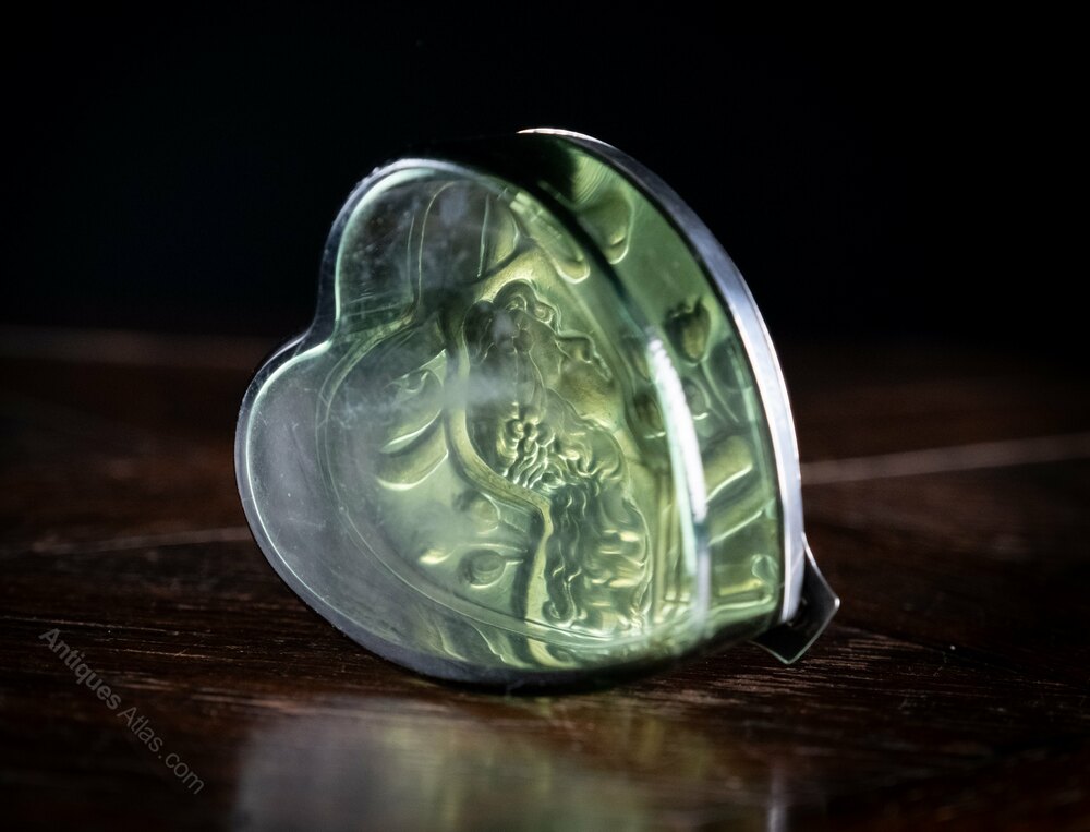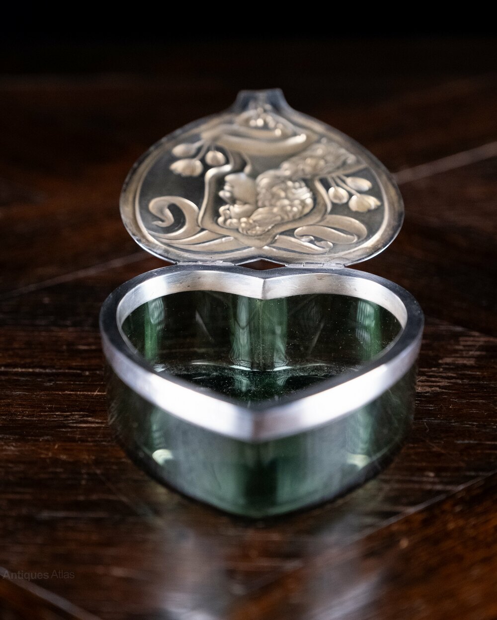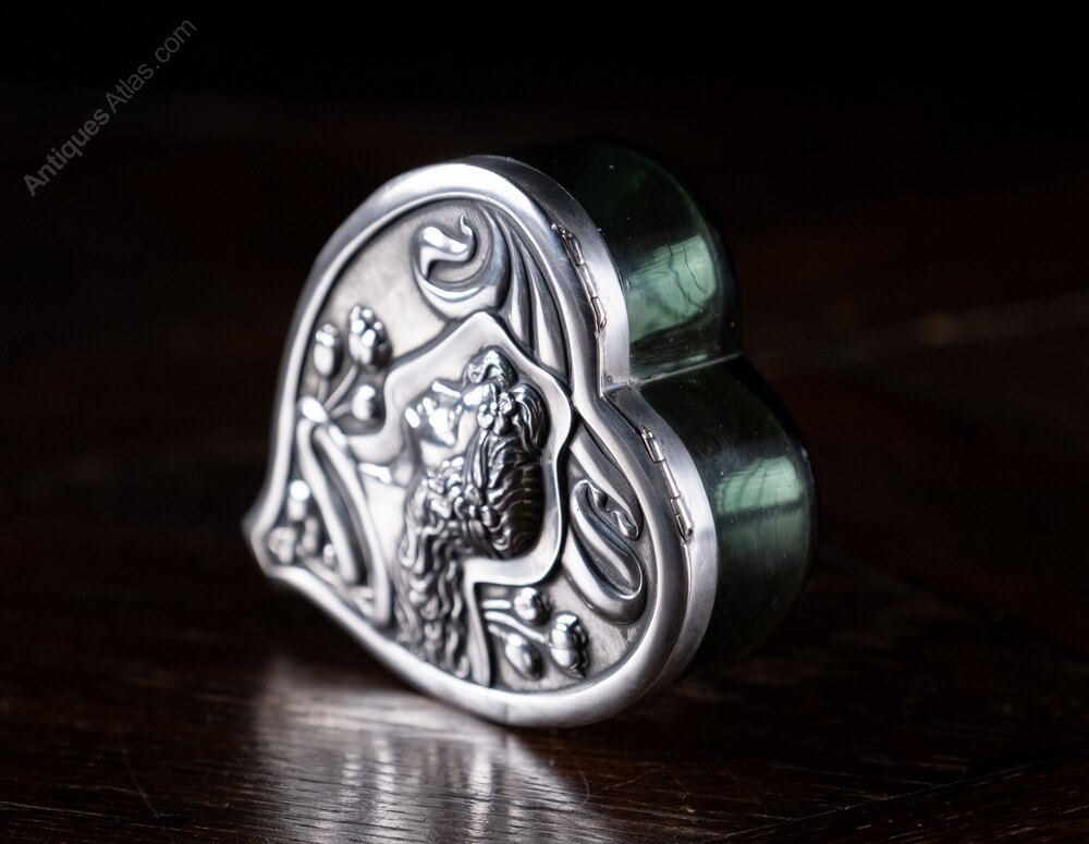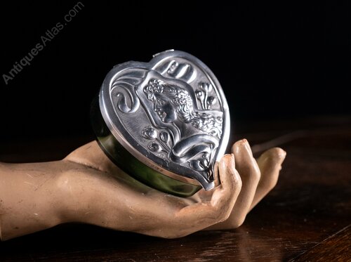 A stunning art nouveau silver and glass dressing table box of large proportions in the form of a heart. Hallmarked for Levi & Salaman, Birmingham, 1901.The embossed hinged lid is finely decorated with an art nouveau figure surrounded by ribbons and flowers. The lid lifts to reveal a green glass box in heart form.