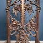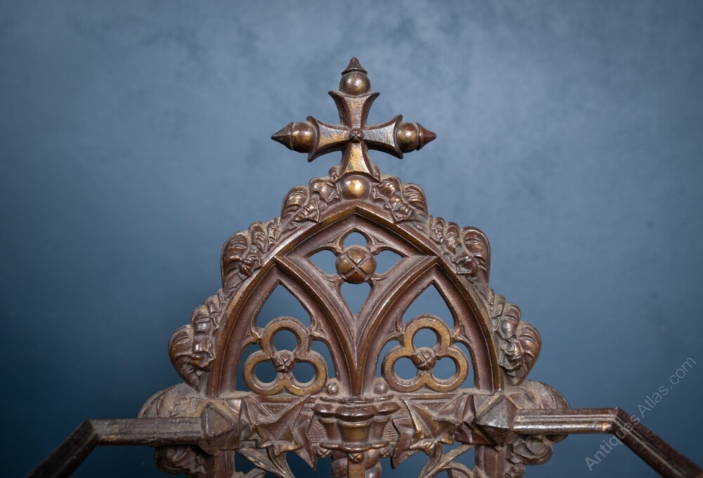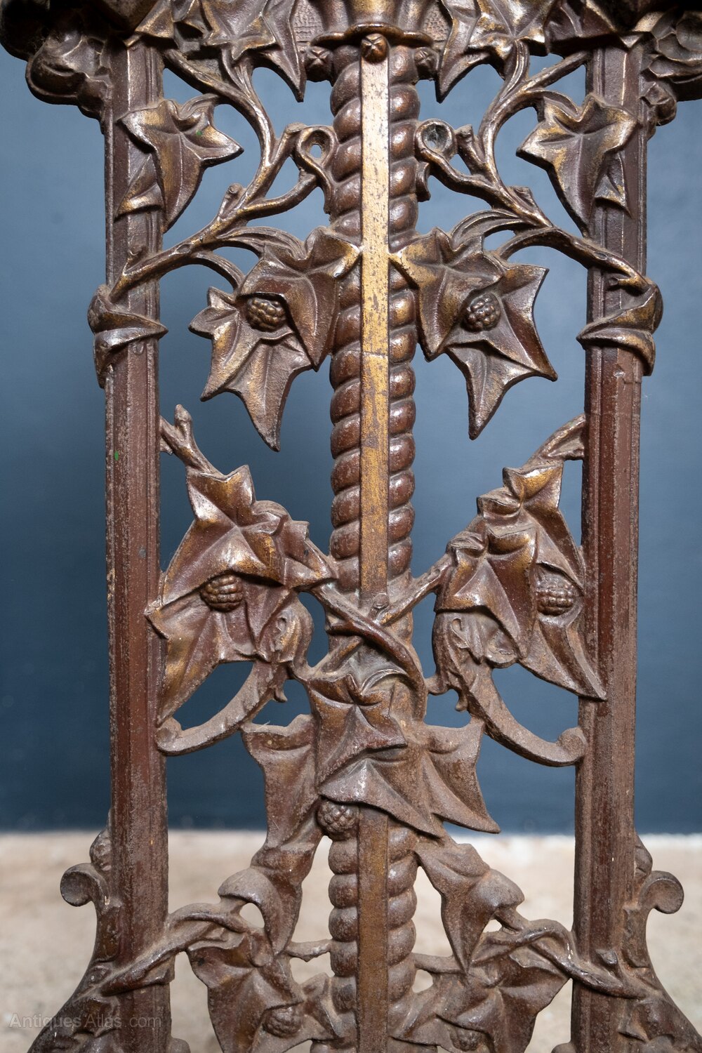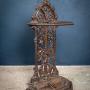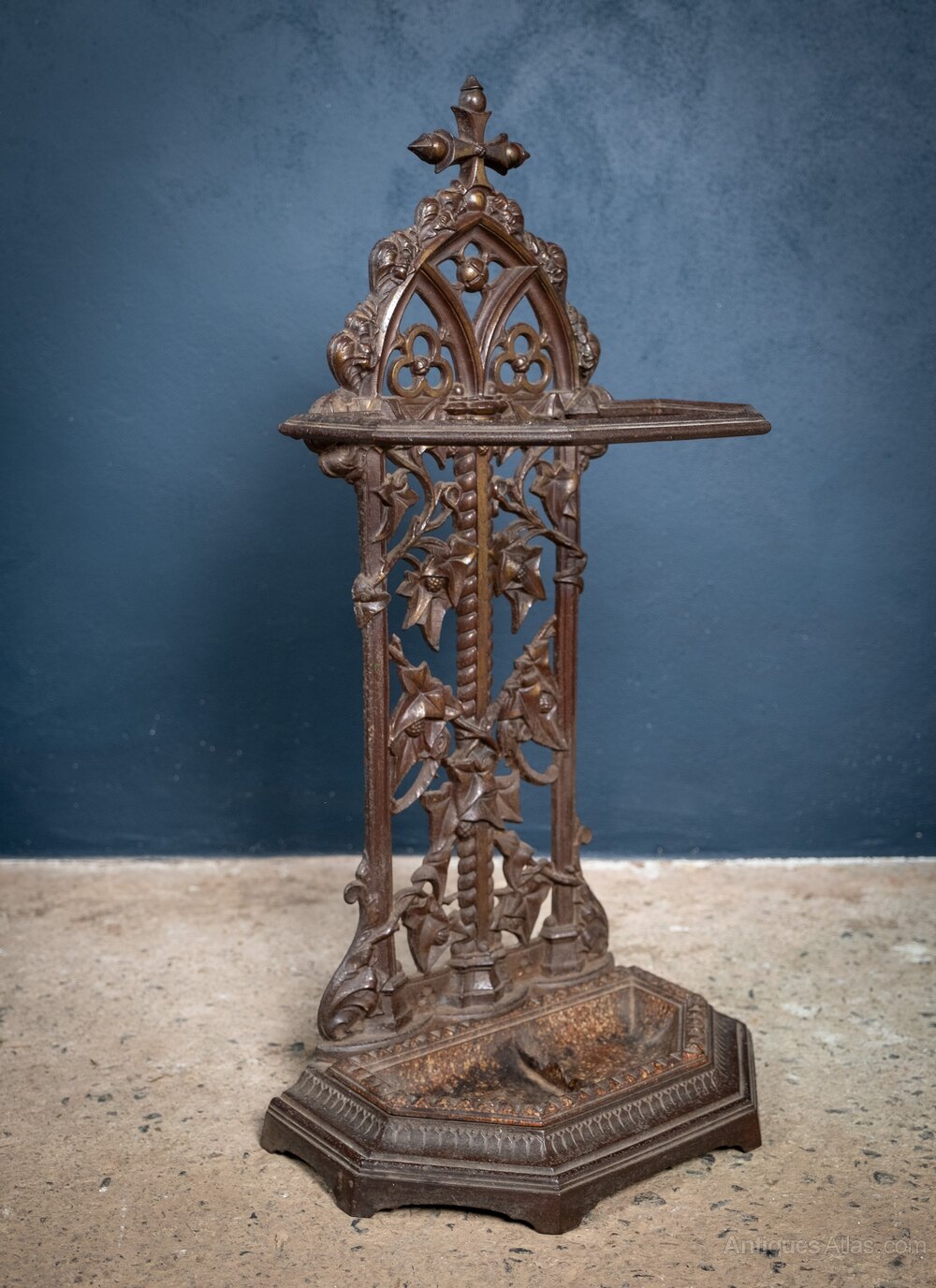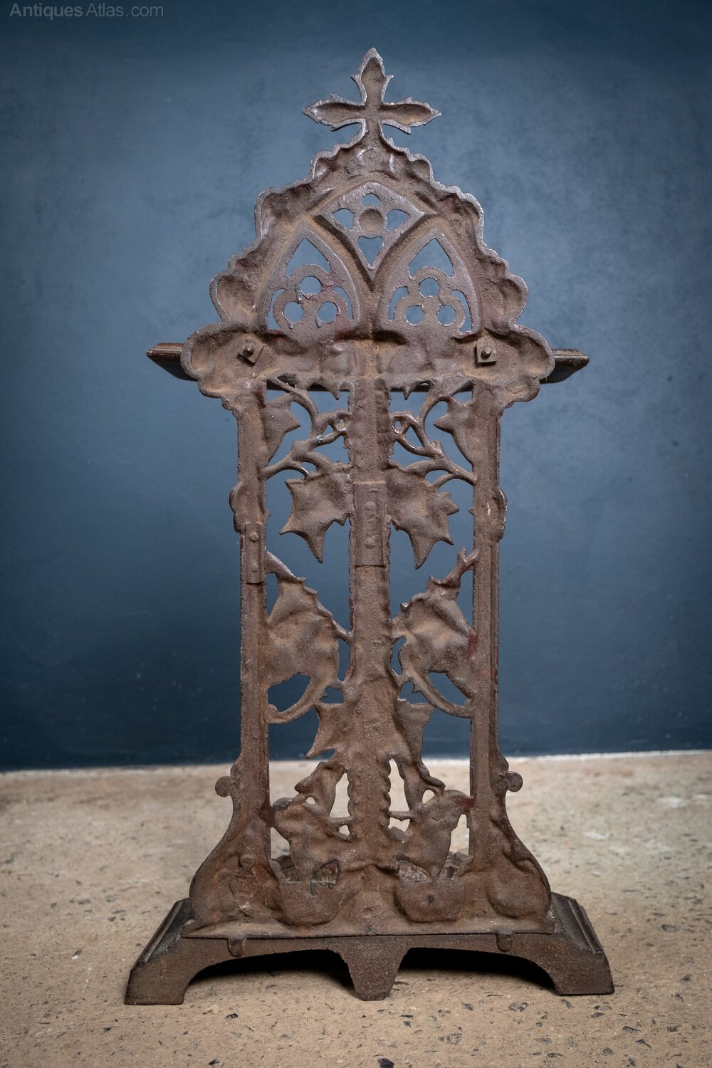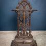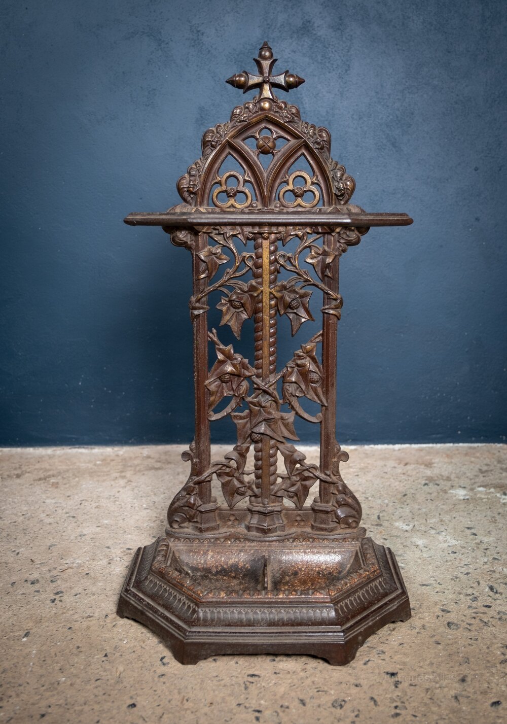 A substantial 19th century gothic revival cast iron stick stand.The stick stand has a cross finial above a gothic arch, the whole above intertwining vines and fruits. Traces of original gilt paint remain throughout. Registration mark and a carved symbol/monogram can be found to the underside of the stick band and underside of the drip tray.