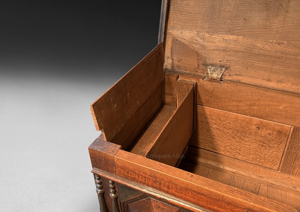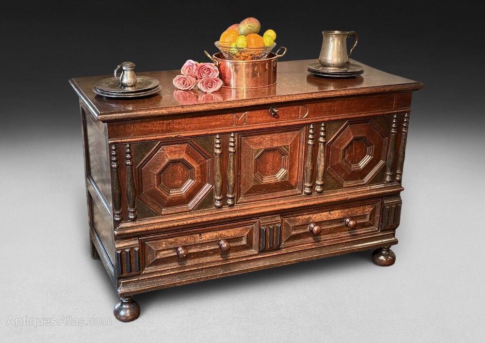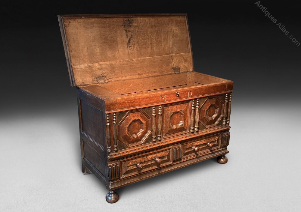 No:11236A very good early 18th century Oak Mule Chest, the plank top retaining the original butterfly hinges and opening to reveal a candle box and hidden secret drawers all above a frieze with the carved initials M D and the original lock with a key, the front and two drawers all with geometric panels and split bobbin turnings, the sides with fielded panels and the whole raised on bun feet. This piece has a wonderful, deep colour and patina.