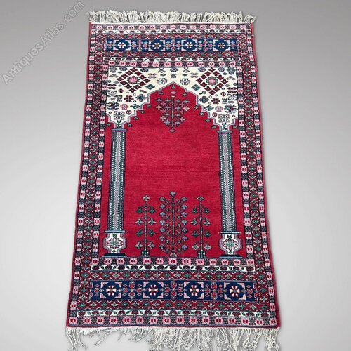 A good quality hand knotted wool prayer rug with vibrant red mihrab field and intricate floral and geometric borders. This rug has been in one ownership since being imported in the early 1960's and has been in storage for many years, hence the remarkable condition. There is very little wear and the colours are clear, strong and bright. An excellent opportunity to add traditional design and impact to any room.c.1960