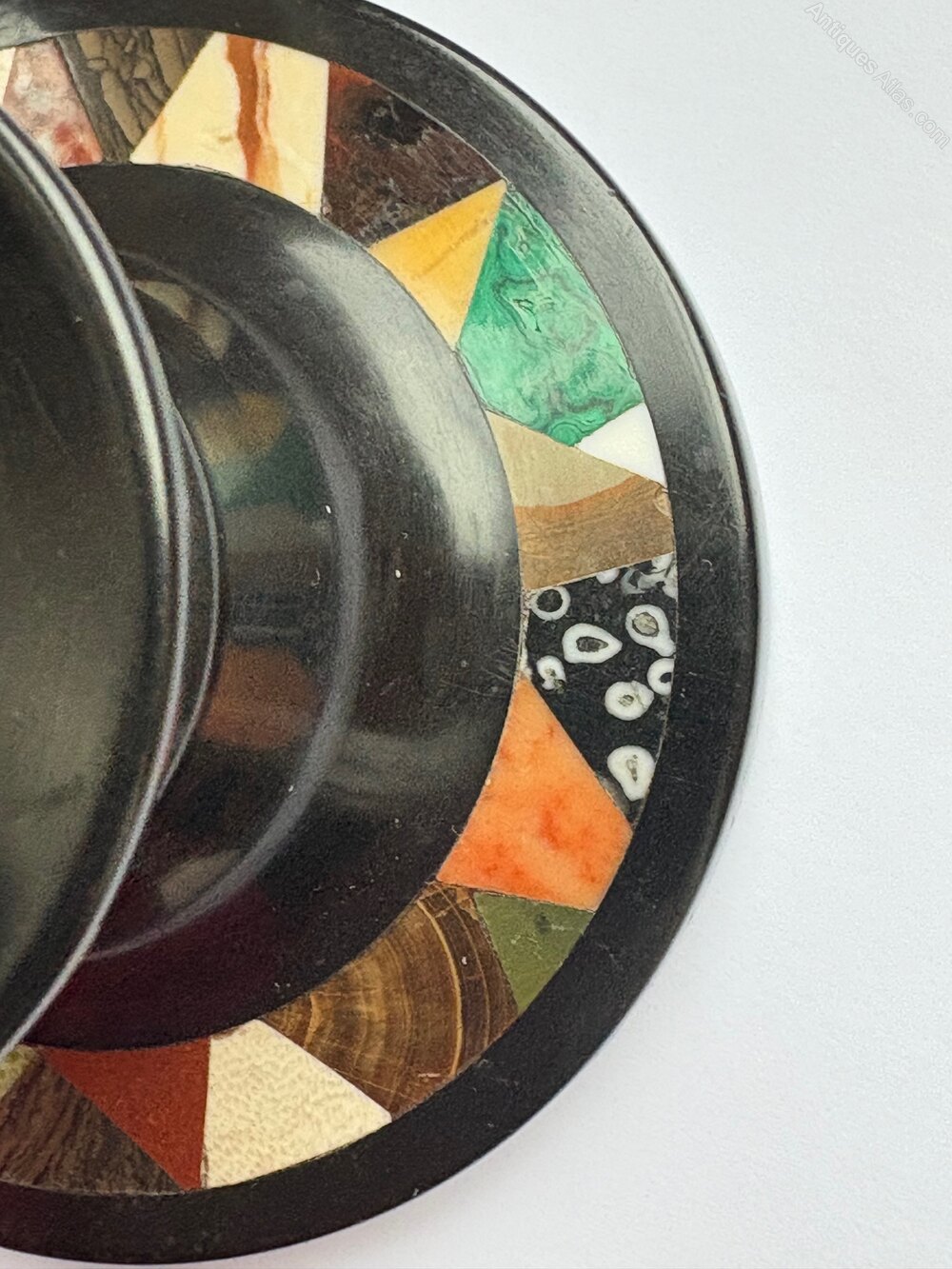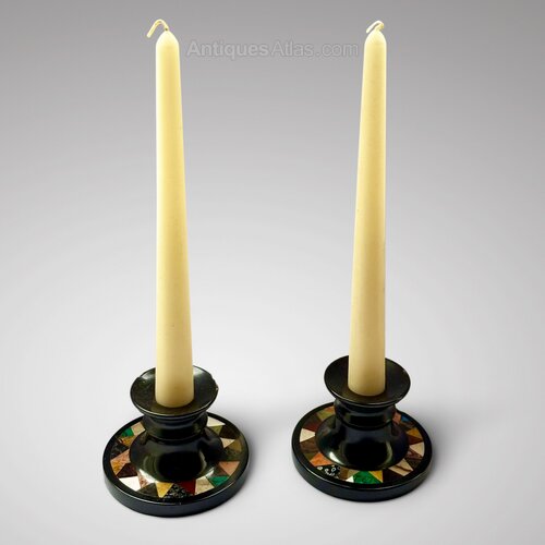 A charming pair of 19th century Ashford Marble candlesticks. These candlesticks are a lovely example of this traditional local craft. The wide variety of colourful stone set around the base contrasts beautifully with the black polished marble.The condition of the candlesticks is compatible with age, there are a few very minor nibbles, these do not detract from the appeal.