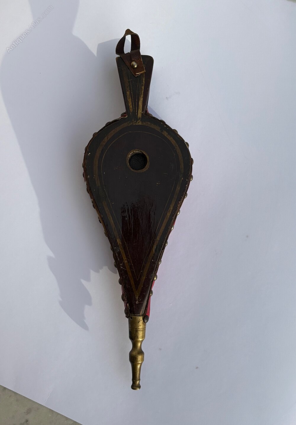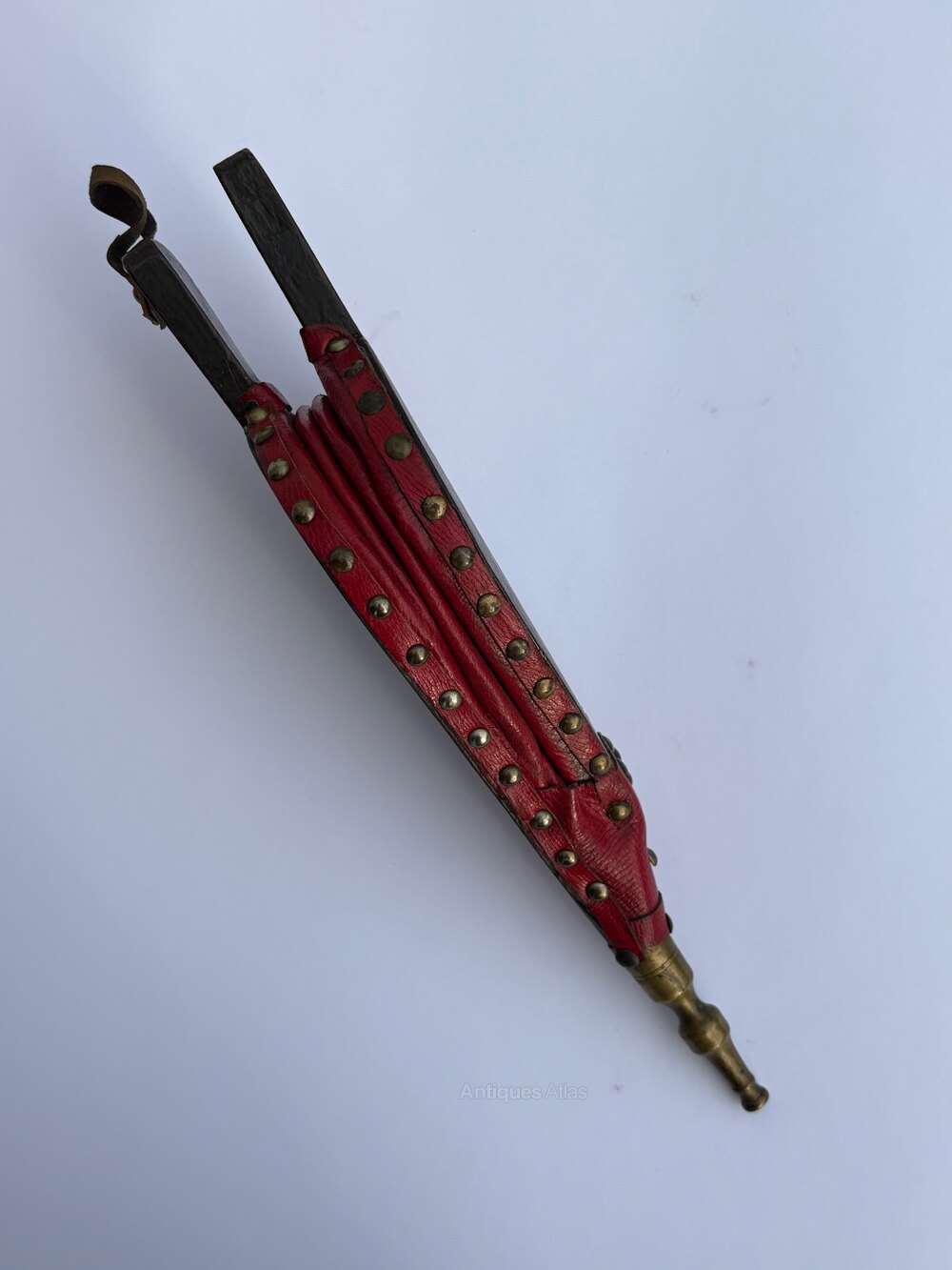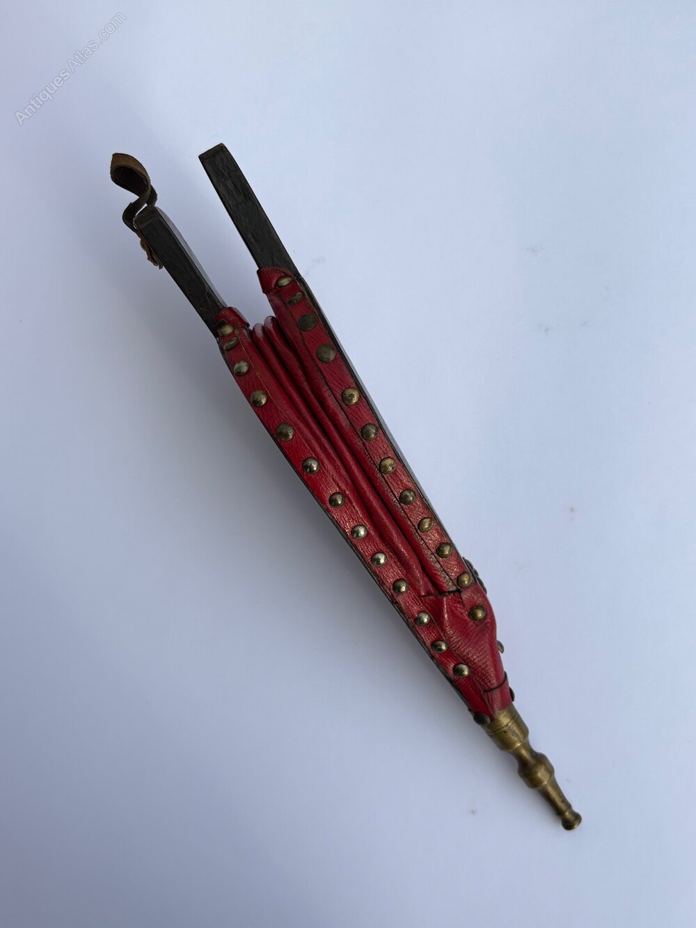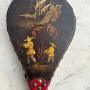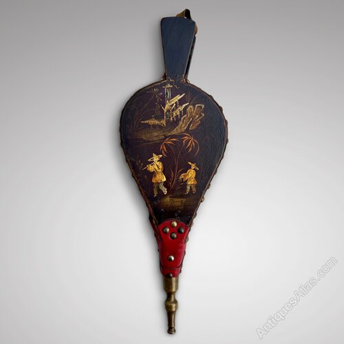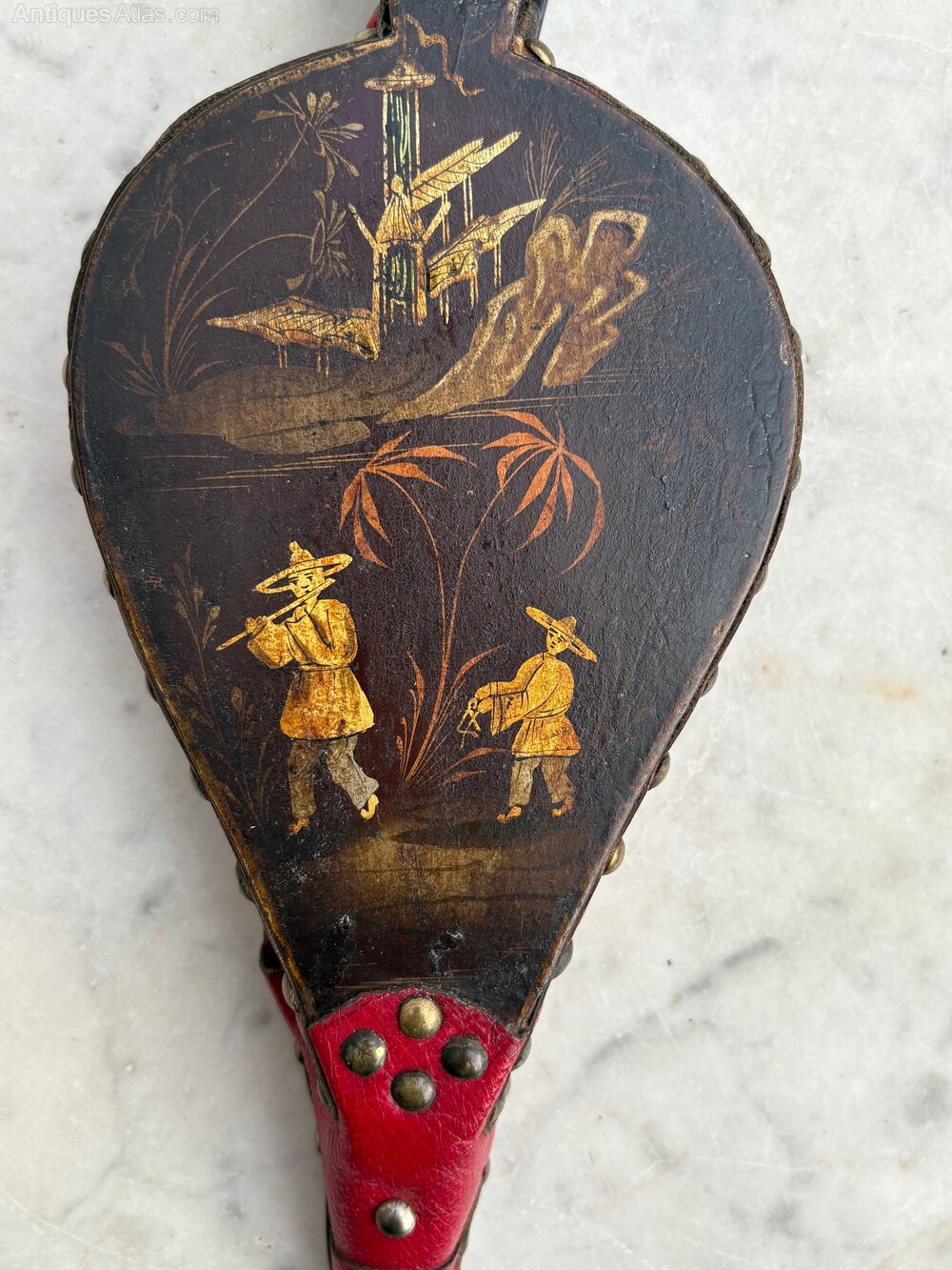 A very decorative pair of French bellows with original red leather and brass stud work. These fireside bellows are decorated to the front with a delightful Chinoiserie scene of musicians playing in a traditional garden landscape. The reverse has a simple gold line on a black ground. The bellows are in good working order.The very small size, charming decoration and distinctive red leather make these French bellows particularly attractive. A great item to enhance the fireside or display as an unusual feature.