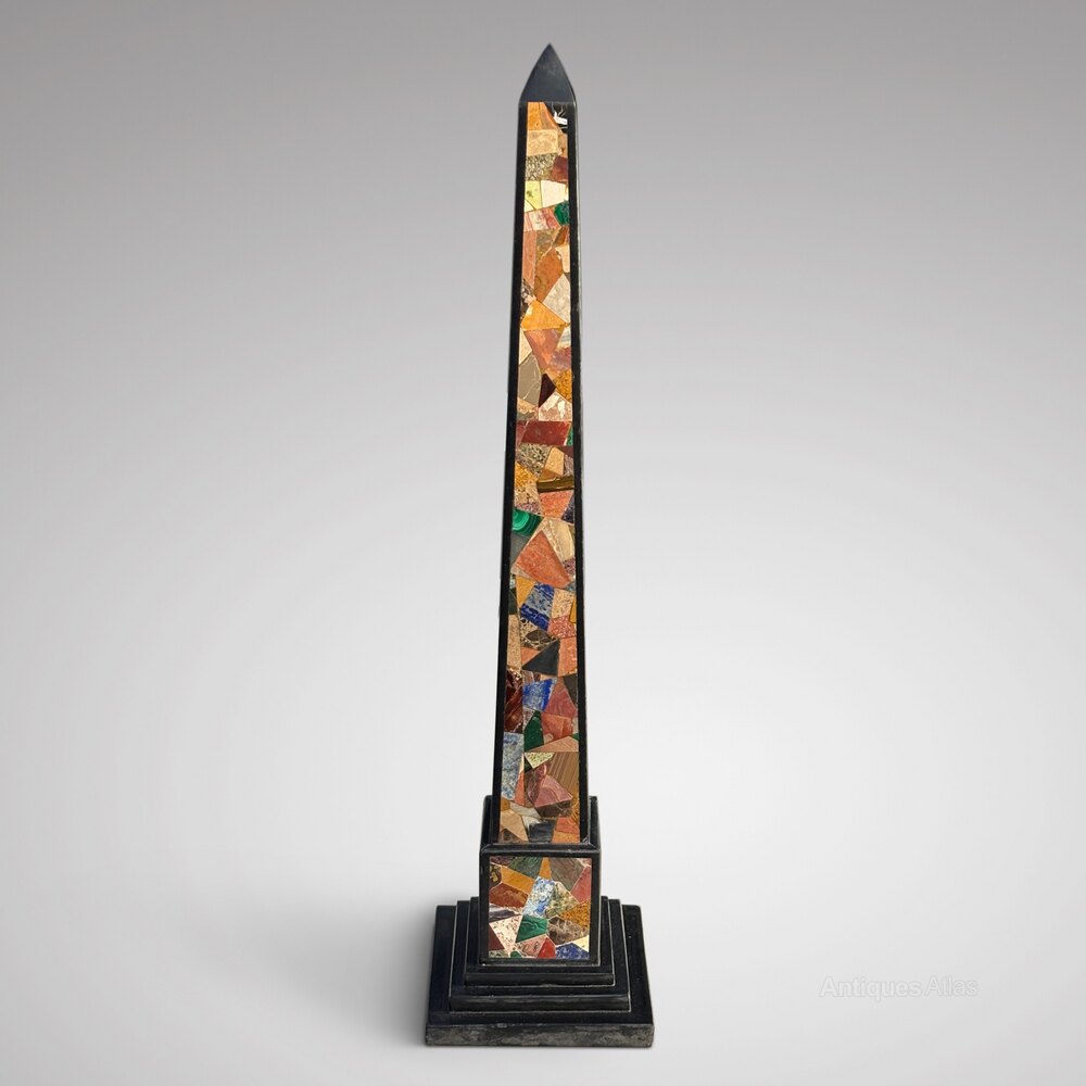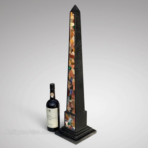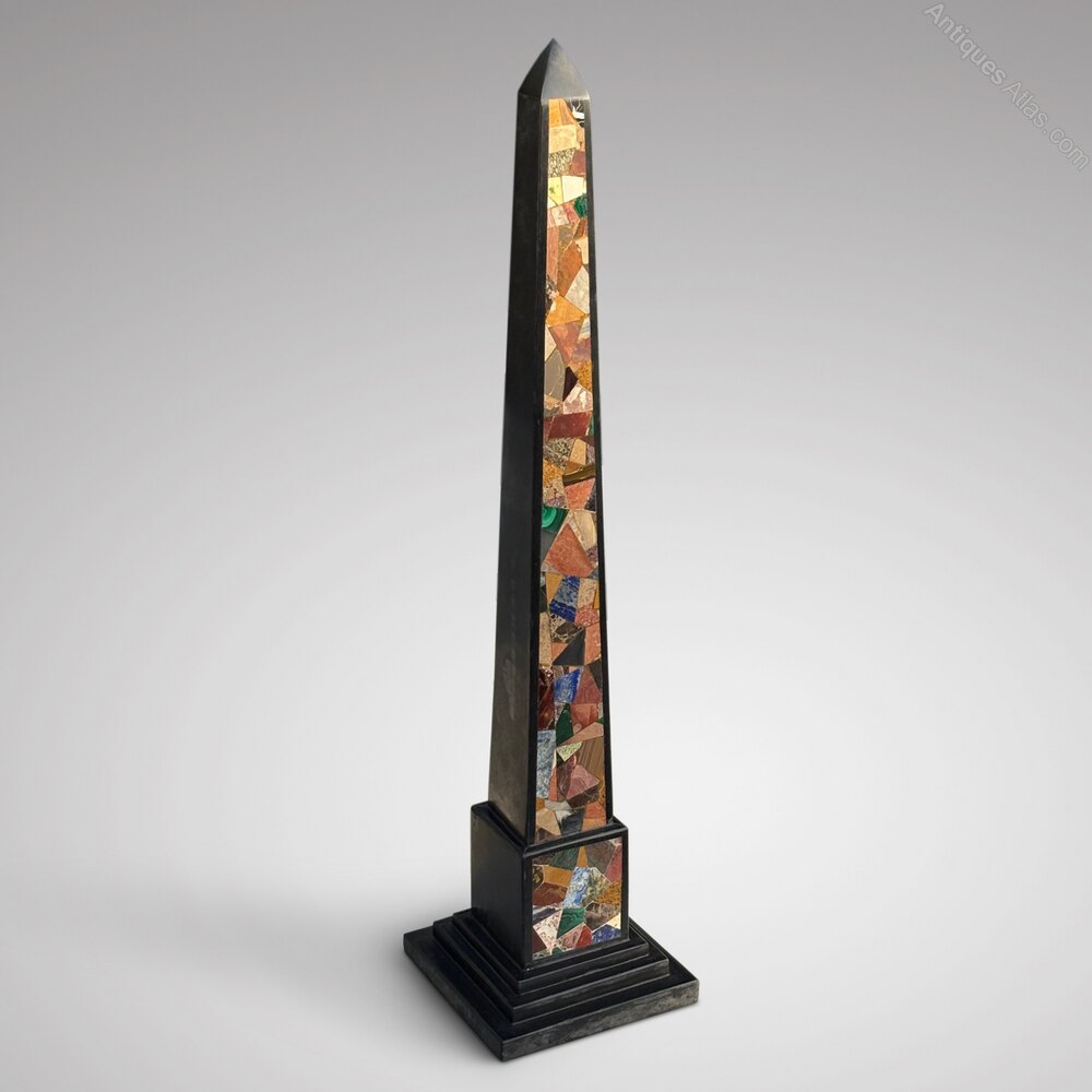 A very handsome pietra dura obelisk of large scale. This Ashford black marble obelisk is inlaid with a wide variety of specimen stone including malachite, lapis lazuli and agate. Obelisks of this kind were very popular in the 19th century and followed the form of tapering columns in ancient civilizations seen on the Grand Tour.This monumental antique obelisk, which stands at 76 cm, is in excellent condition and is raised on a stepped square black marble base.