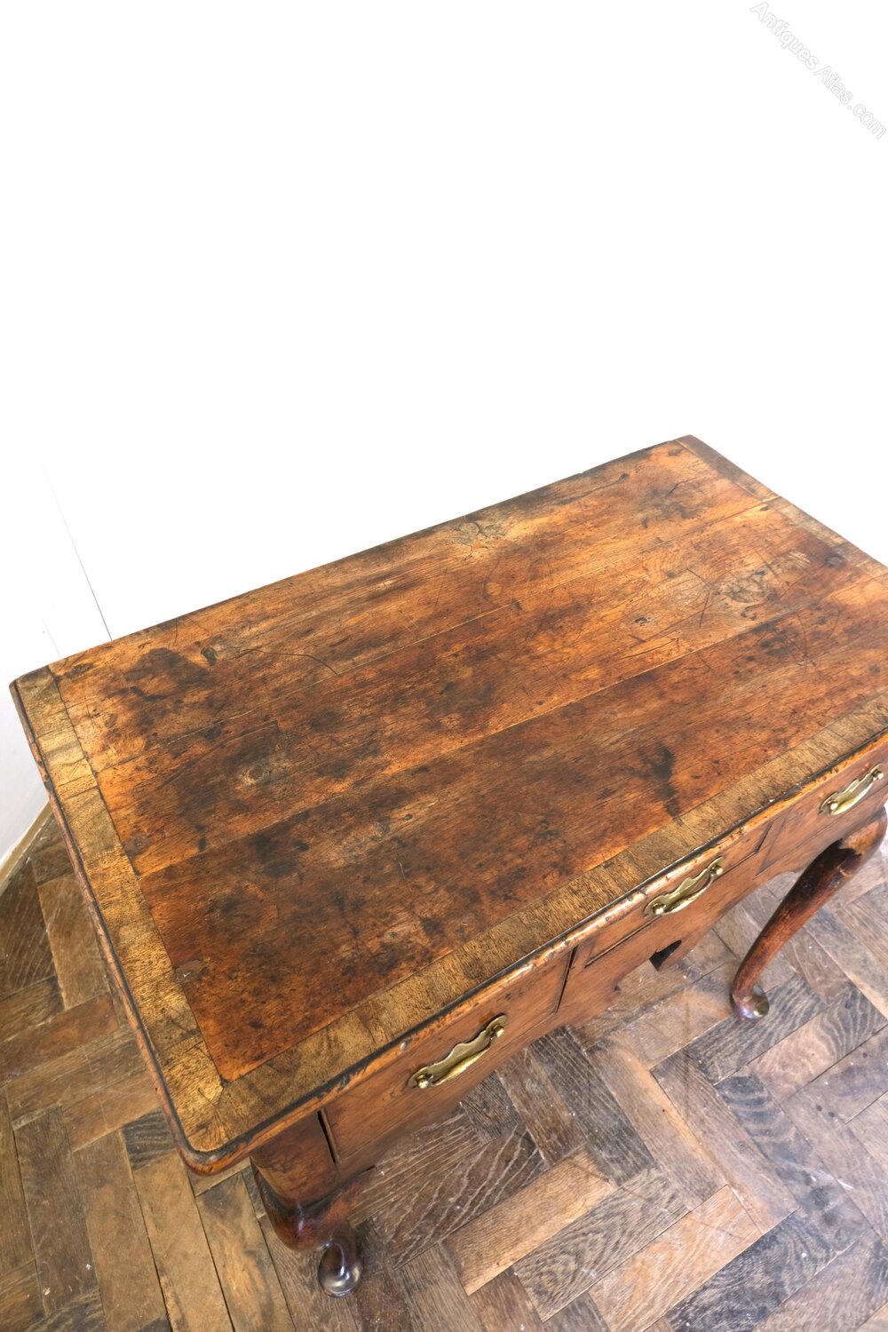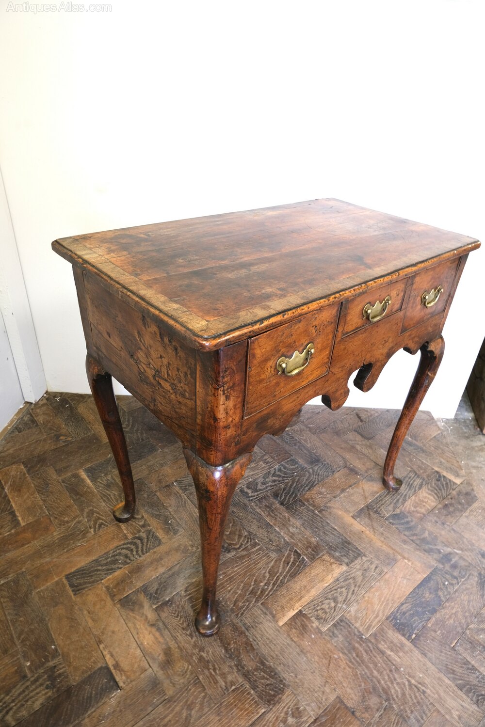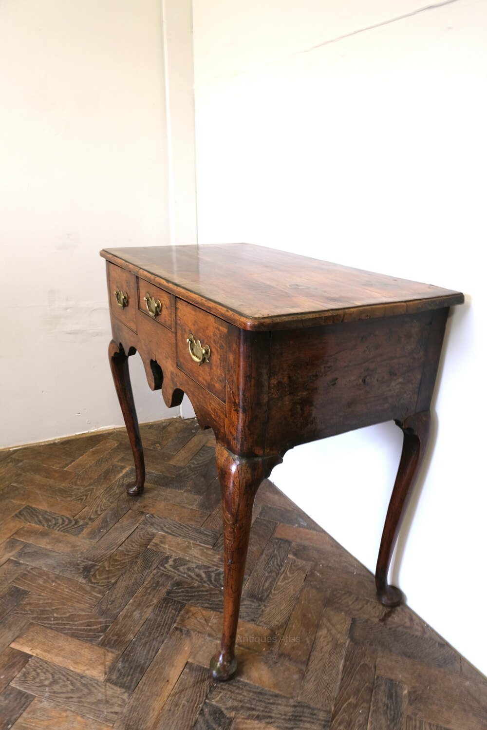 Hutton-Clarke Antiques is pleased to offer this Georgian lowboy, exceptionally rare to find in solid yew wood. Standing gracefully on cabriole legs terminating in pad feet, it displays a beautifully shaped apron and a lovely honey-coloured, silky patina developed over centuries. The top is crossbanded, and the drawers retain their original linings with old replacement brass “kidney” handles. A fine and very original early 18th-century piece with excellent colour, figure and charm throughout.Height 78 cm, width 74 cm, depth 43 cm