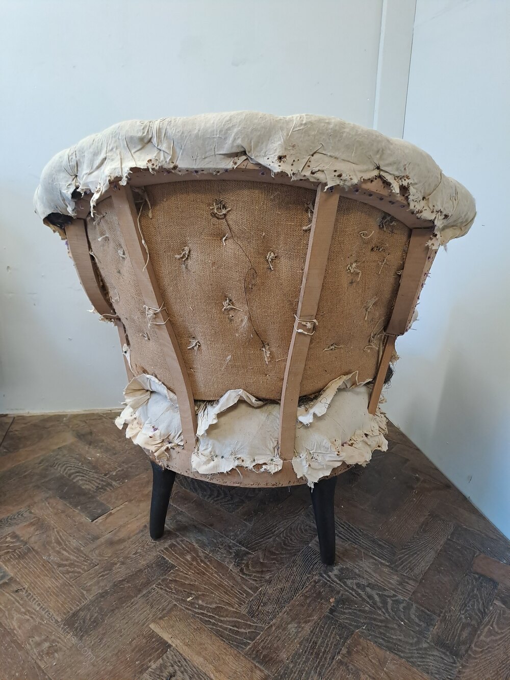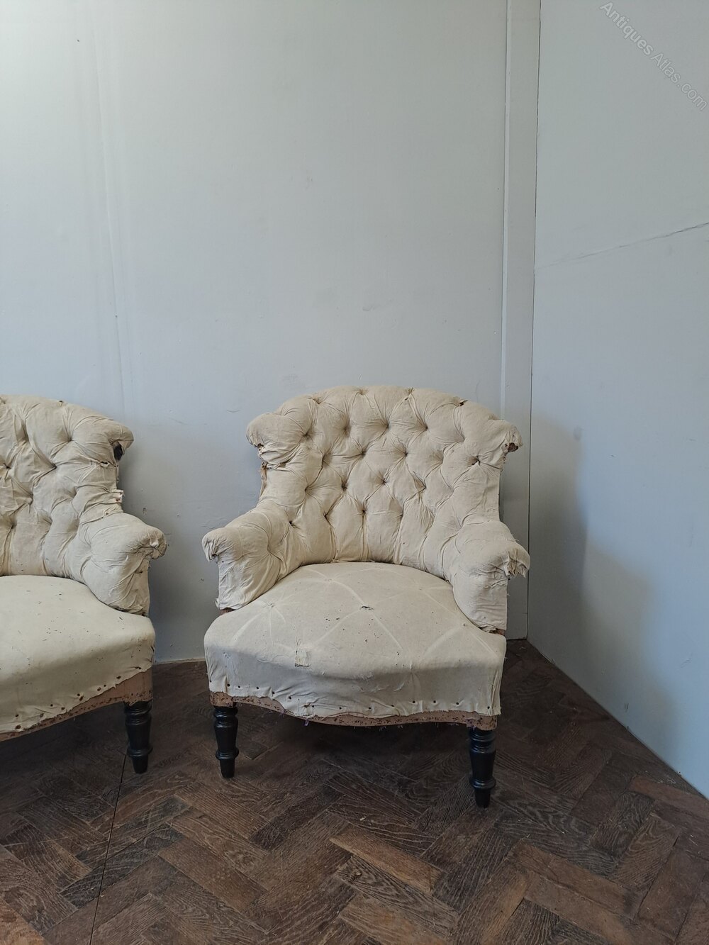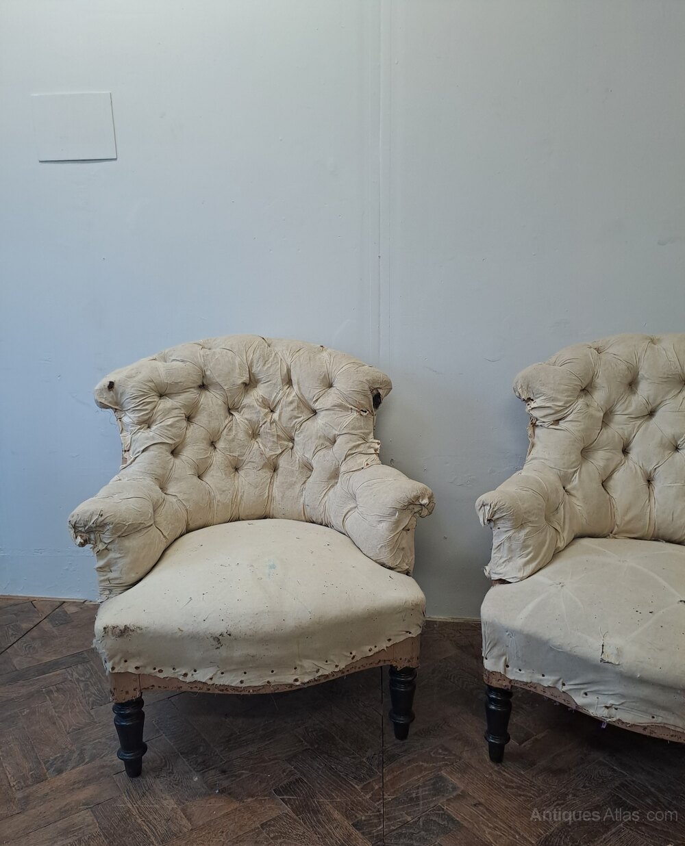 Pair of Napoleon III Upholstered Armchairs – Deconstructed for Re-Upholstery For sale by Hutton-Clarke AntiquesA characterful pair of Napoleon III armchairs, deconstructed back to their original ticking and ready for fresh upholstery. They display all the hallmarks of the period, including deep-buttoned backs, scrolled arms, and generous seats. The turned ebonised front legs with castors complete their elegant 19th-century silhouette.