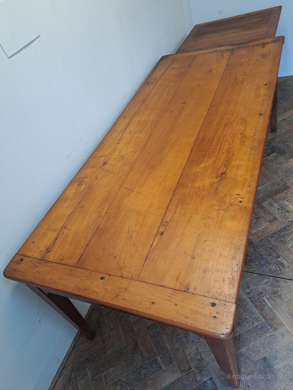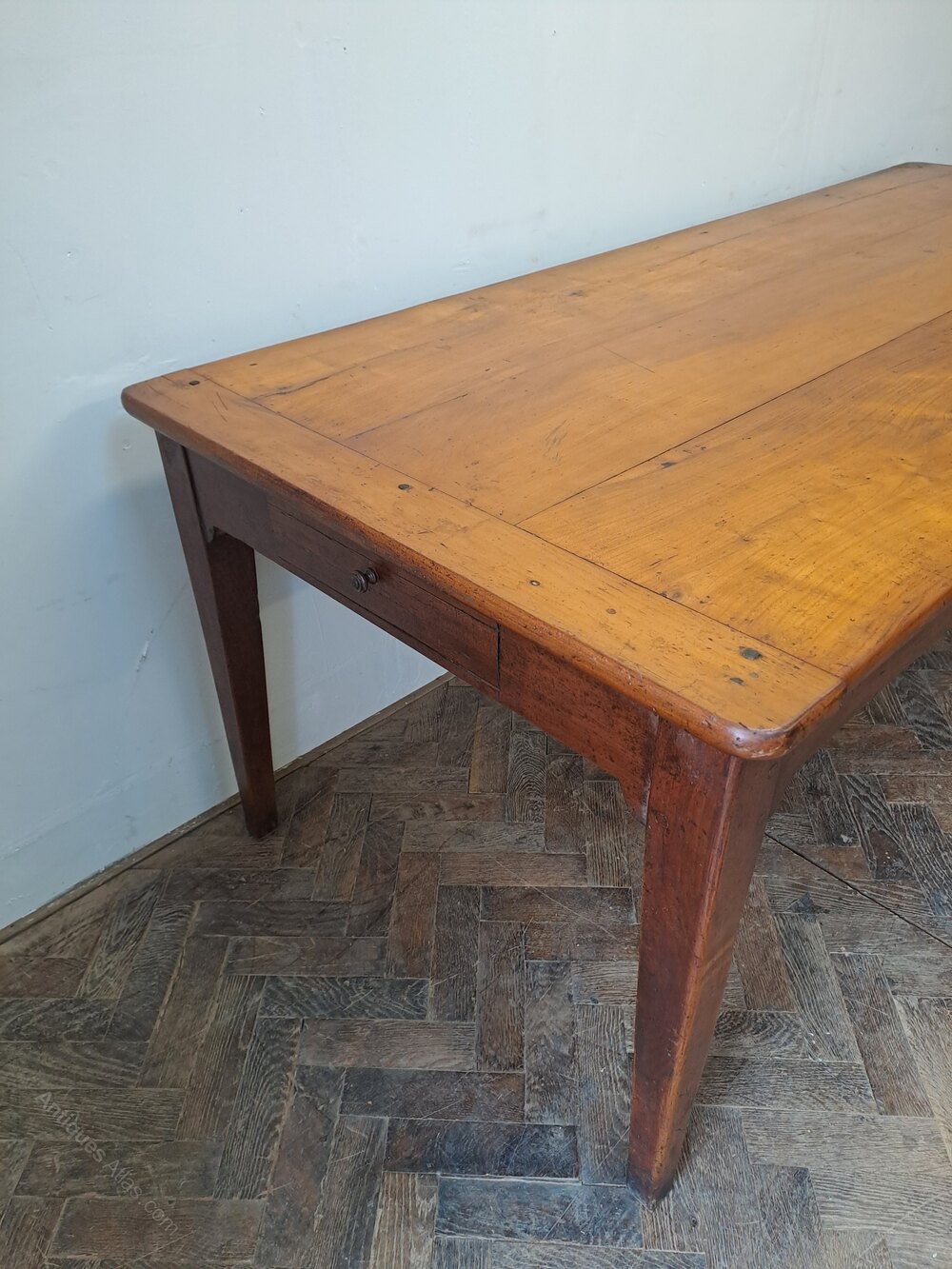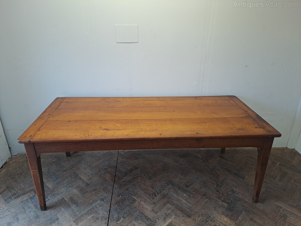 A fine mid-19th century French cherrywood farmhouse kitchen table of particularly good form and proportions. The top is constructed from wide, well-figured cherrywood boards with cleated ends, offering strength, stability and an attractive surface with warm, well-developed colour.The table stands on elegant tapered legs and retains a useful pull-out additional slide at one end, complete with a fold-down supporting leg, allowing for extra seating while remaining stable in use. At the opposite end is a false drawer, the result of the leg height having been discreetly increased to make the table more practical for modern kitchen and dining use.