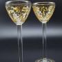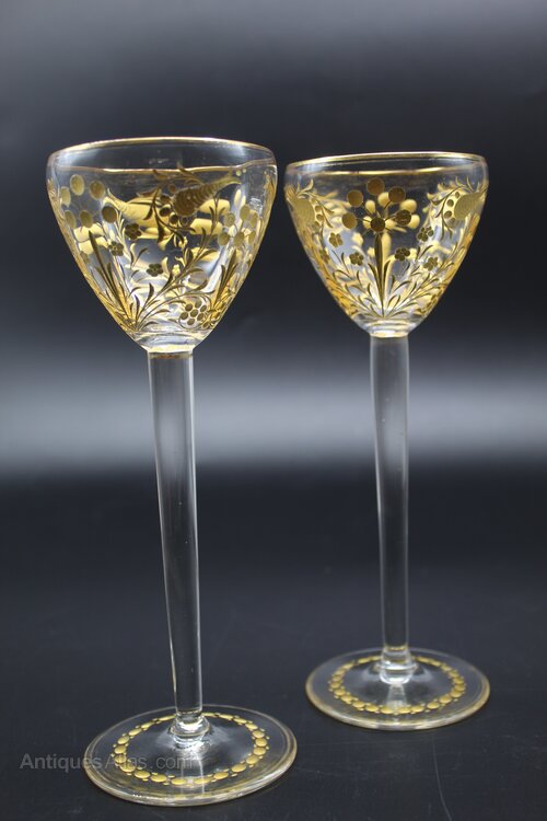 Beautiful pair of crystal wine glasses. Intaglio gold decorated. 20cm high, 7cm diameter bowl, 7cm diameter base. Fine quality. In the style of Moser, late 19th century. Some very minor loss to gold decoration on bowl and around base.Shipping information