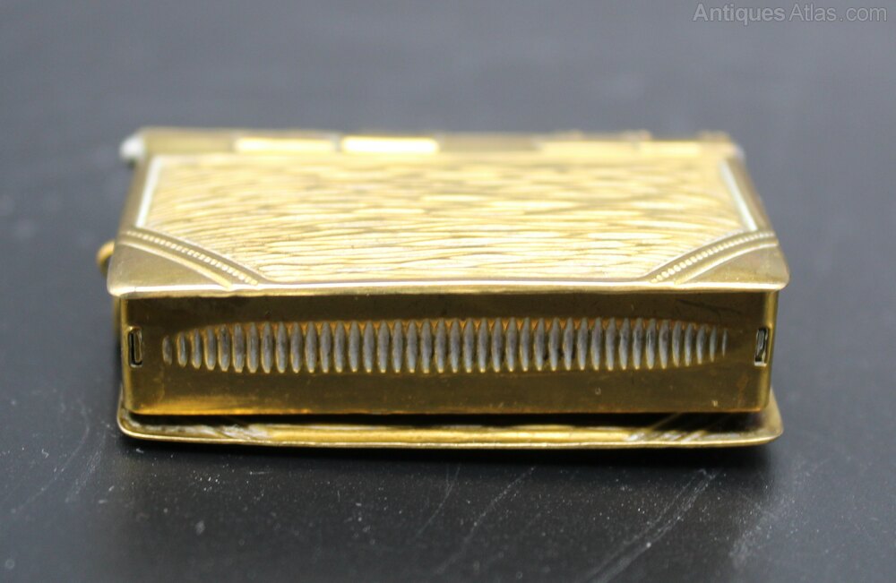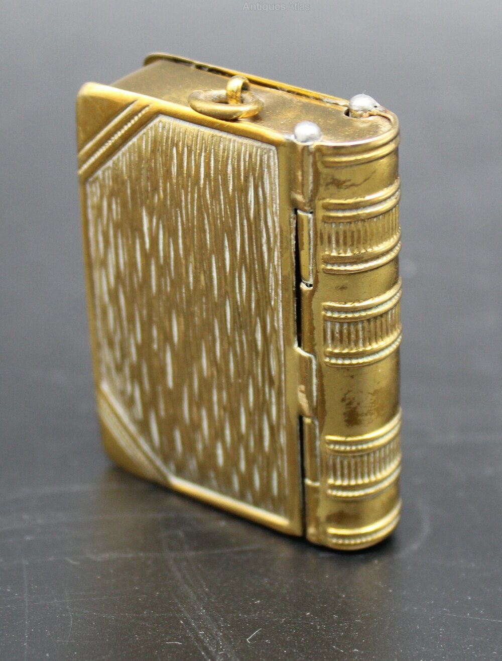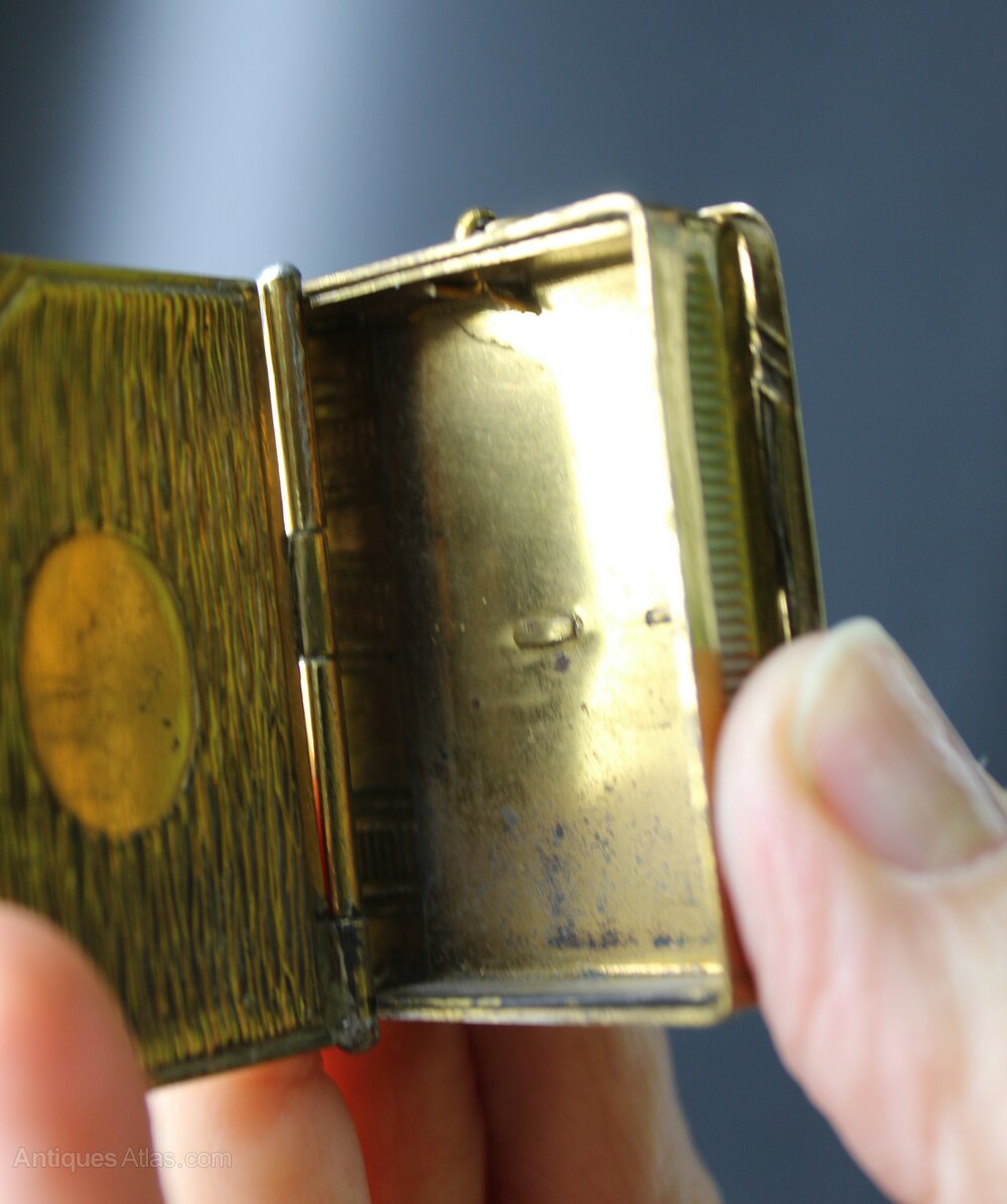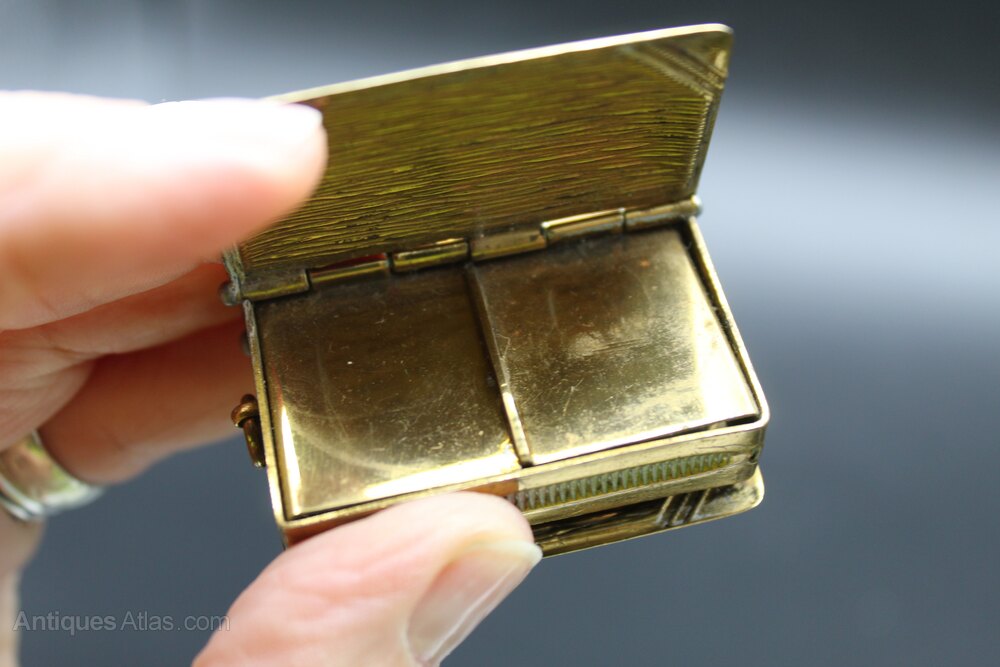 Lovely brass vesta, with stamp and match compartments and ring for attaching to pocket chain. Sprung opening to both the stamp and match compartment - springs are strong. 4.8cm high by 3.6cm wide, and 1.2cm deep. C1920Shipping information