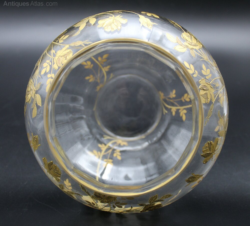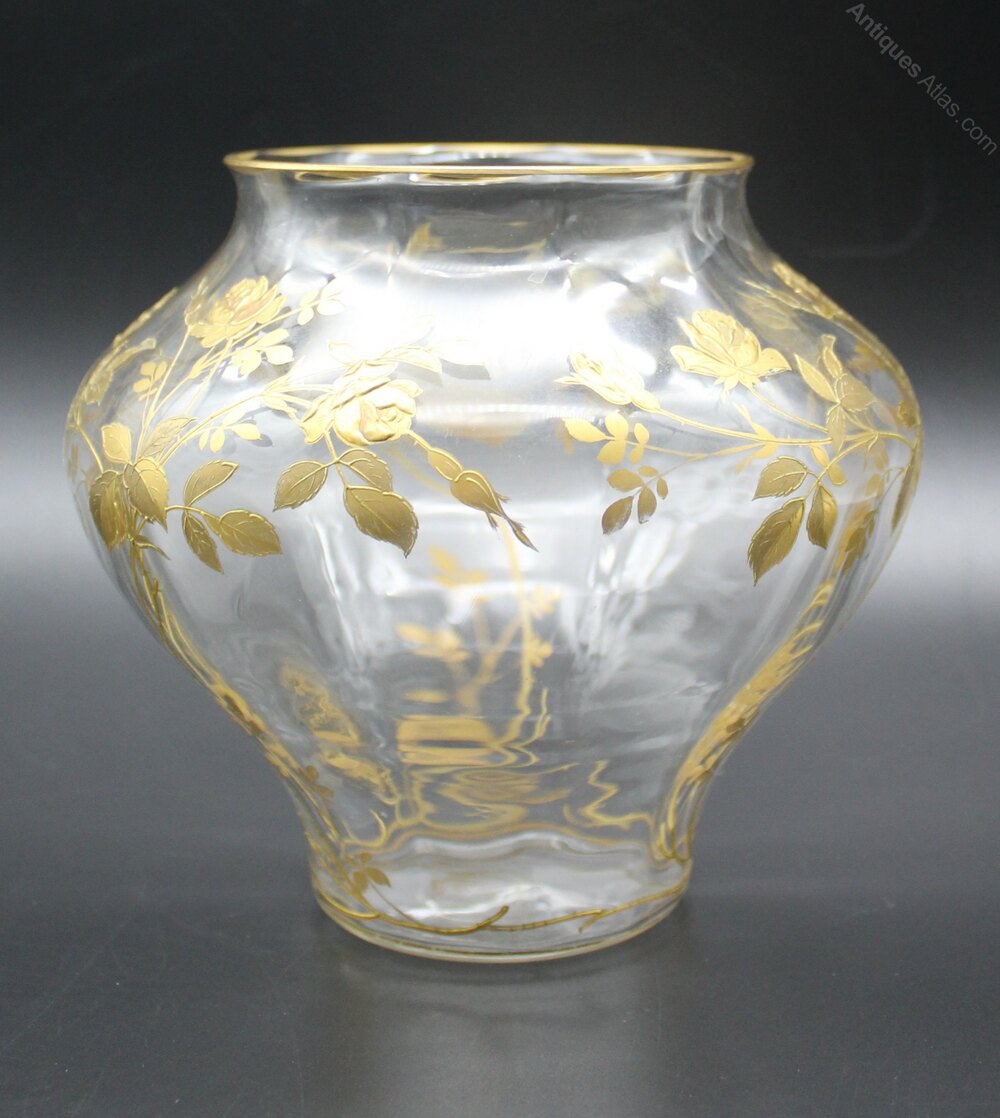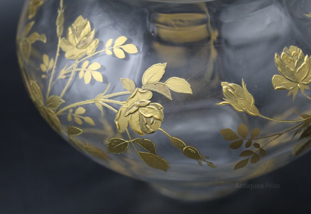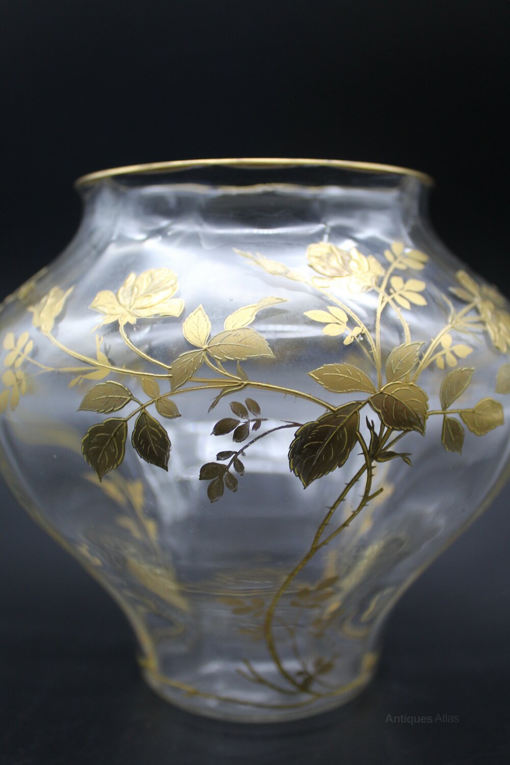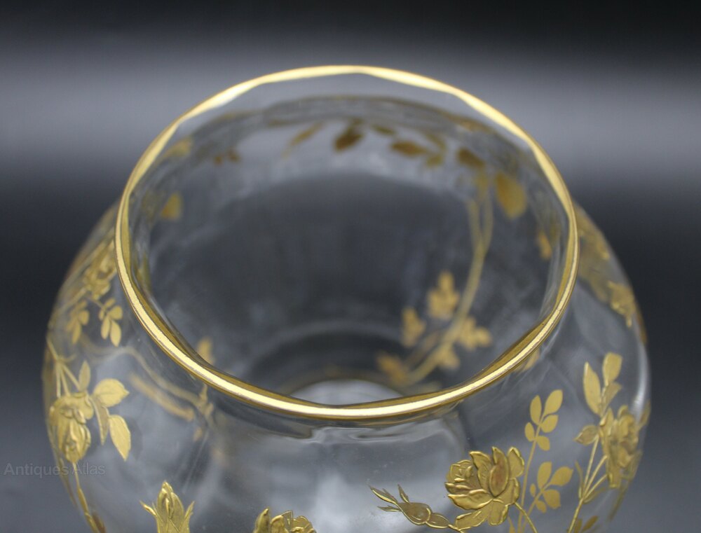 Beautifully decorated vase. 19th Century, C1880. Excellent quality. Probably French by a fine maker. Heavily gilded with roses. No chips to glass, gilding in very good order. Scratches to base in line with age. 15cm high, 10cm top diameter, 7.5cm base diameter.Shipping information