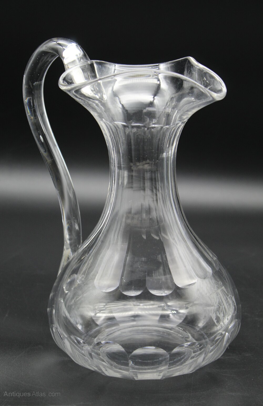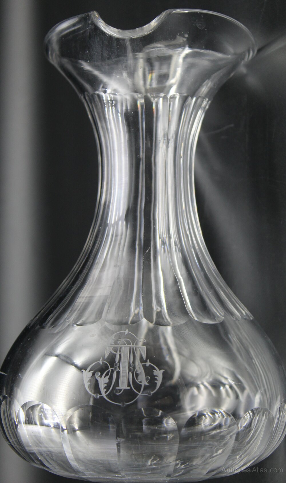 Beautiful quality French glass jug. Pitcher style. Louis Philippe Period, early 19th century. Slice cut. Lovely monogrammed detail. Scratches to base in line with age. 25cm to top of handle, 17cm handle to lip, and 14cm widest diameter.Shipping information