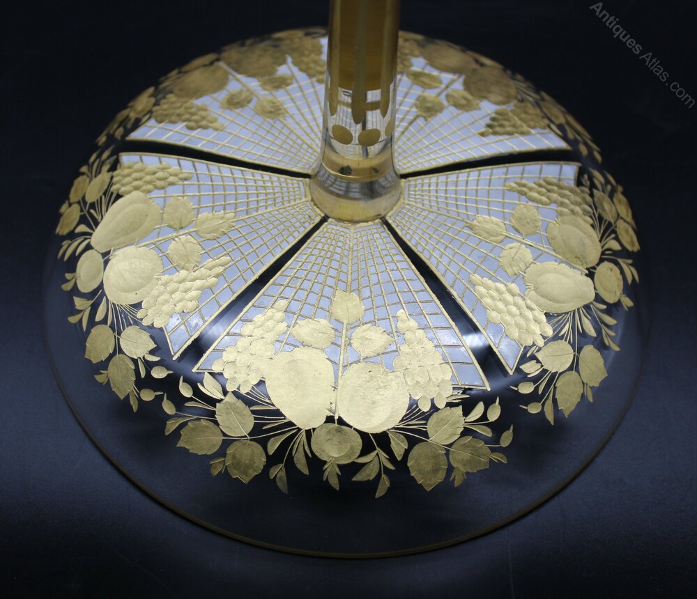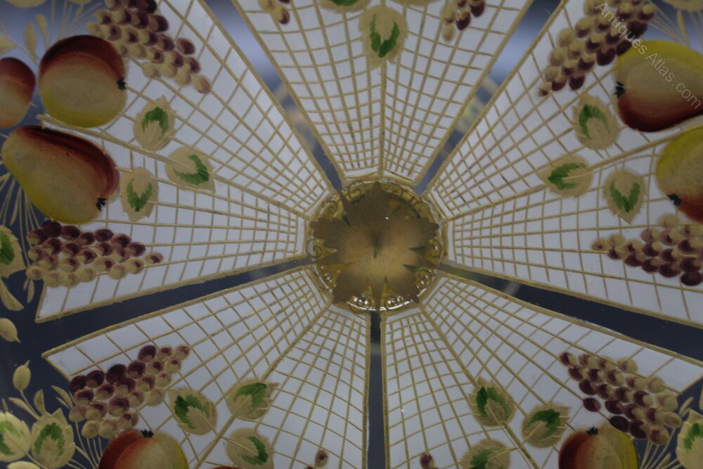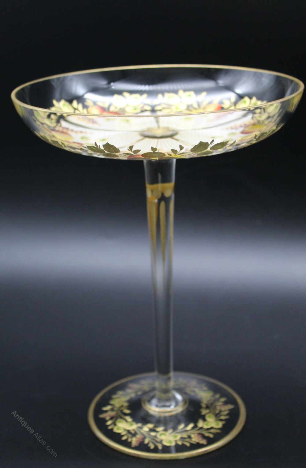 Beautiful quality - very unusual. Moser tazza. C1880. Hand painted and gilded intaglio decoration - apples, pears, grapes. Decoration in excellent condition. Scratches to base in line with age. 25cm tall. 19cm diameter top, 11cm diameter base.Shipping information