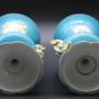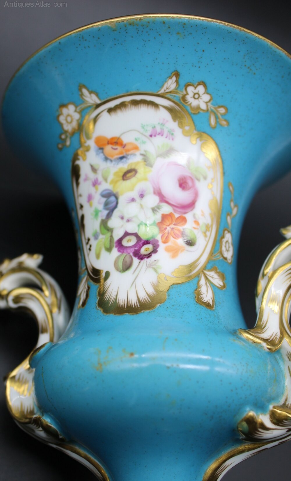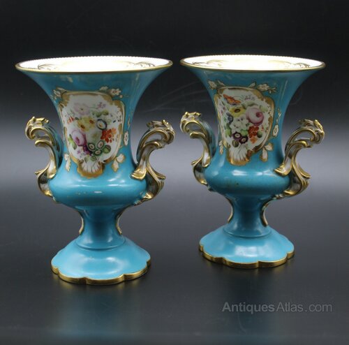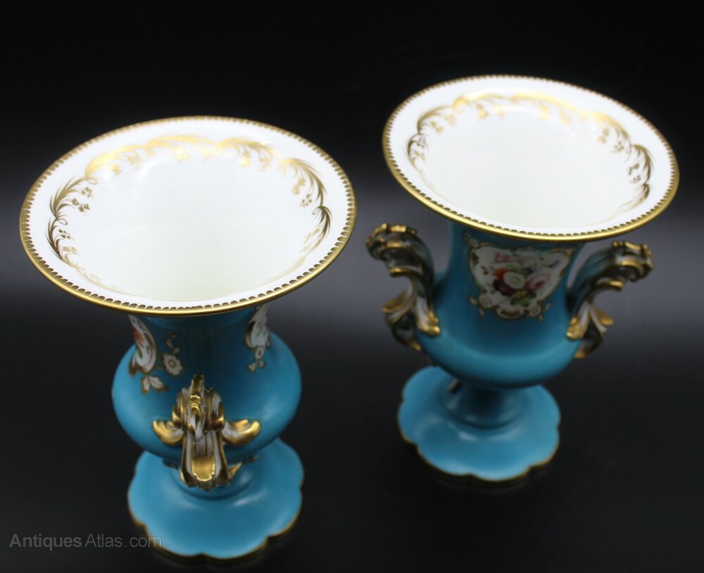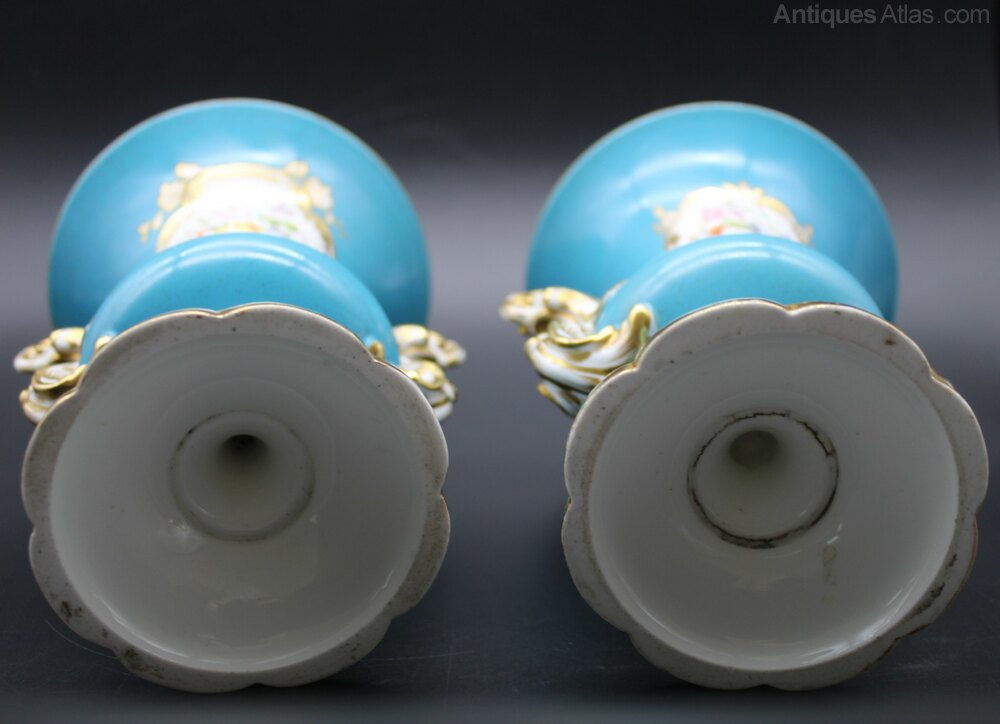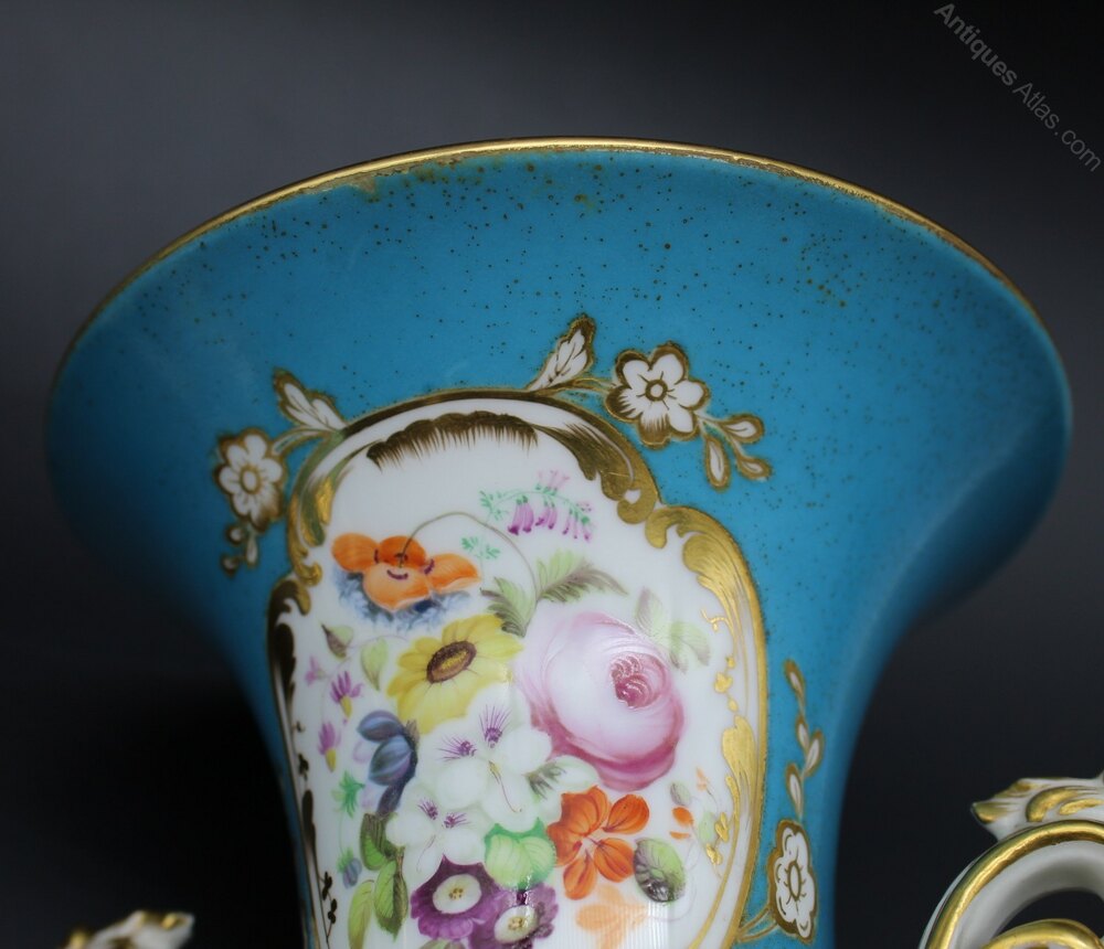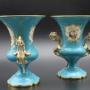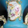 Beautifully decorated pair of Sevres style, Paris porcelain, turquoise, bleu celeste urns. Heavily gilded with hand painted floral panels on both sides. Some speckling to glaze and some marks on glaze but otherwise no chips or cracks. Gilding in excellent condition. 19th century C1890. More photographs available on request. 18cm high, 13cm top diameter, 9cm diameter base.Shipping information