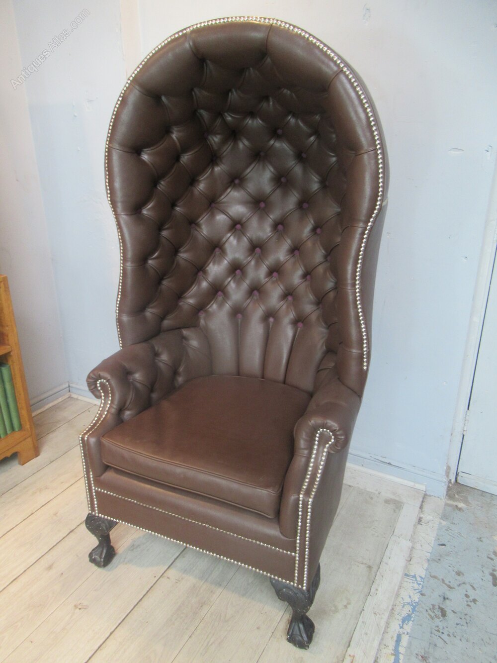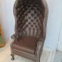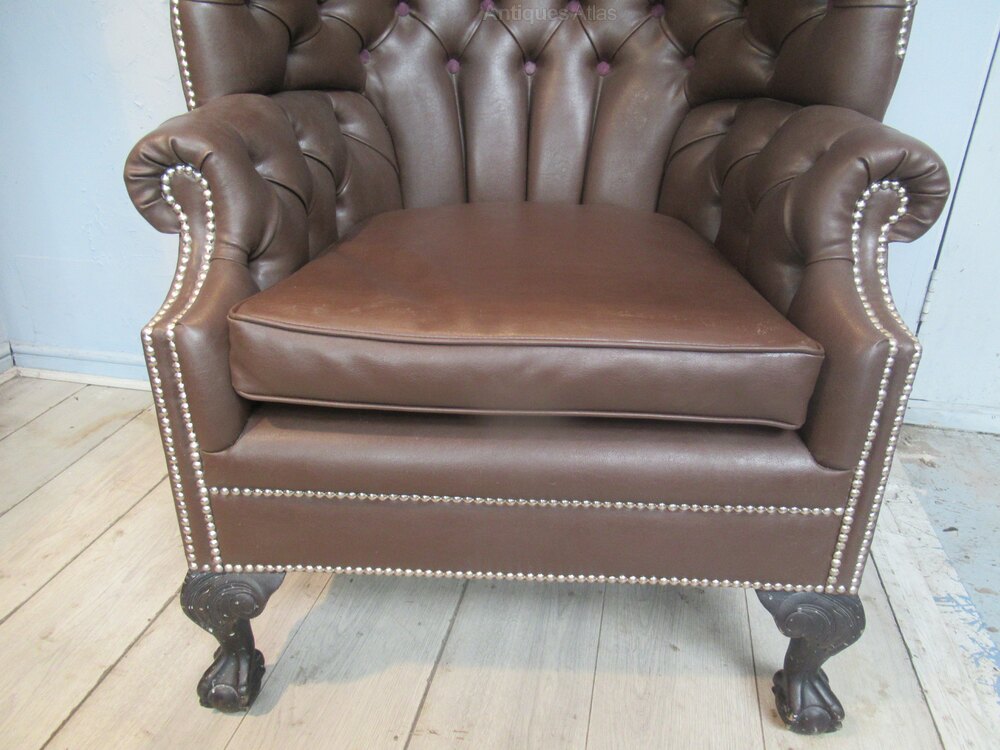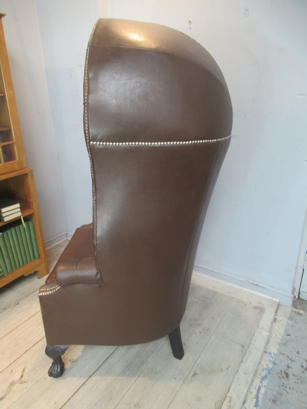 Hall Porters arm chair in brown faux leather with dome metal studs. The chair has a hooded top and is deep buttoned . Standing on front claw and ball type legs with a loose inset cushion.Date1970s :