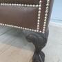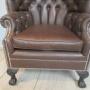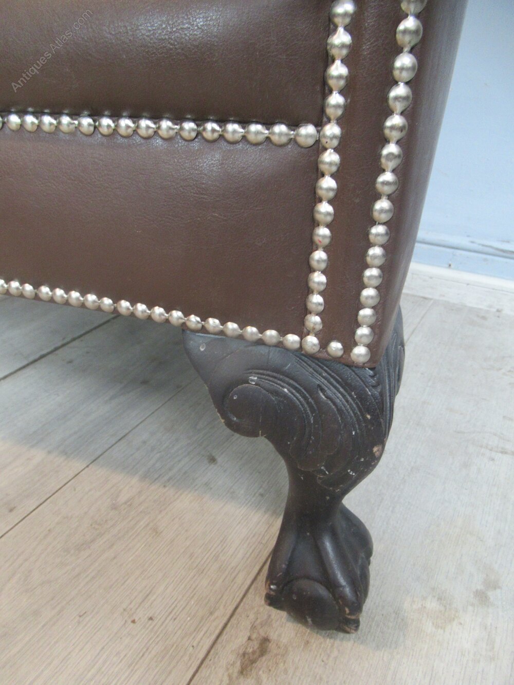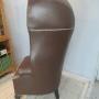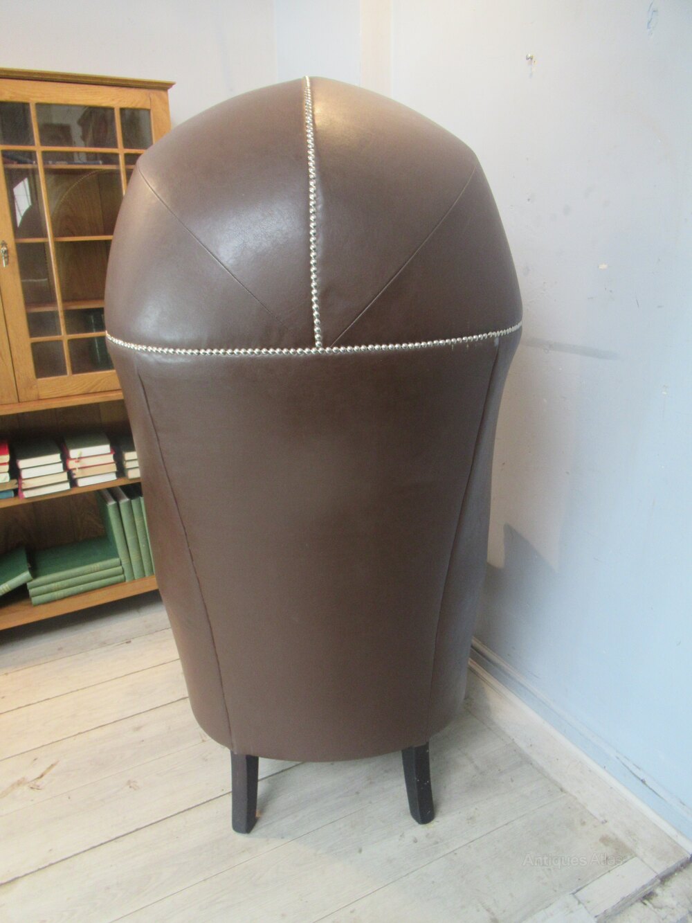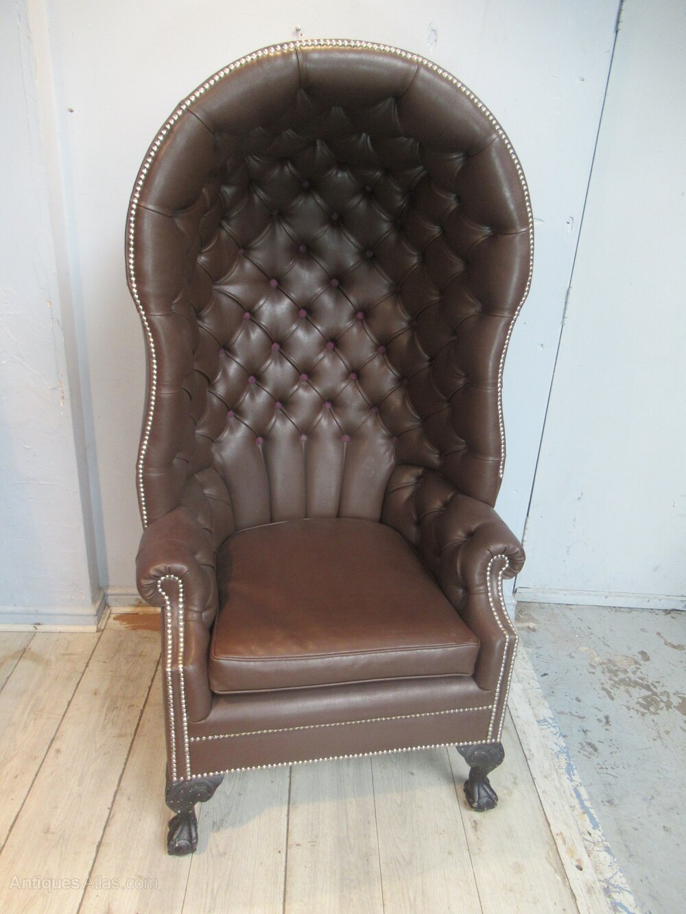Hall Porters arm chair in brown faux leather with dome metal studs. The chair has a hooded top and is deep buttoned . Standing on front claw and ball type legs with a loose inset cushion.Date1970s :