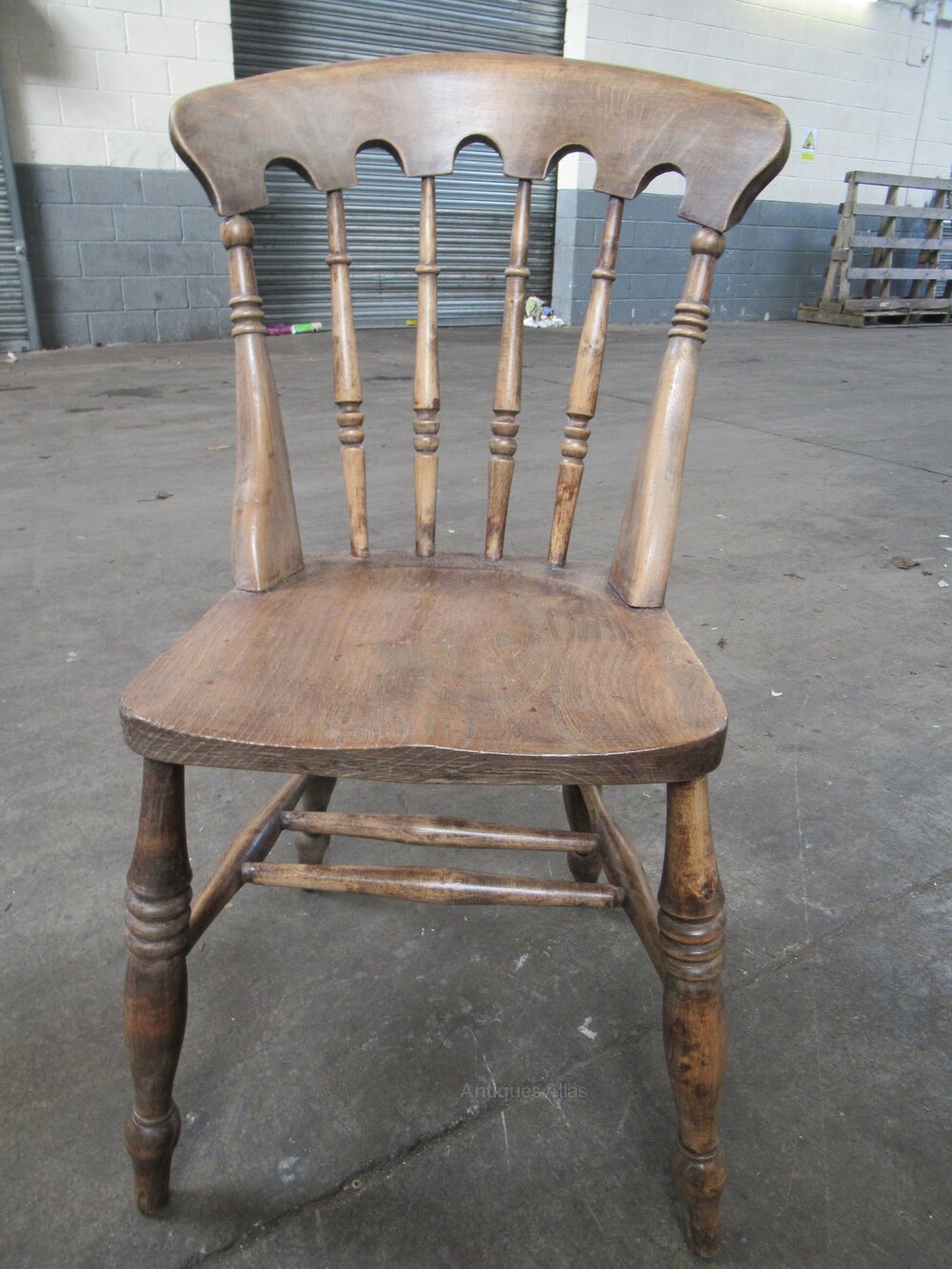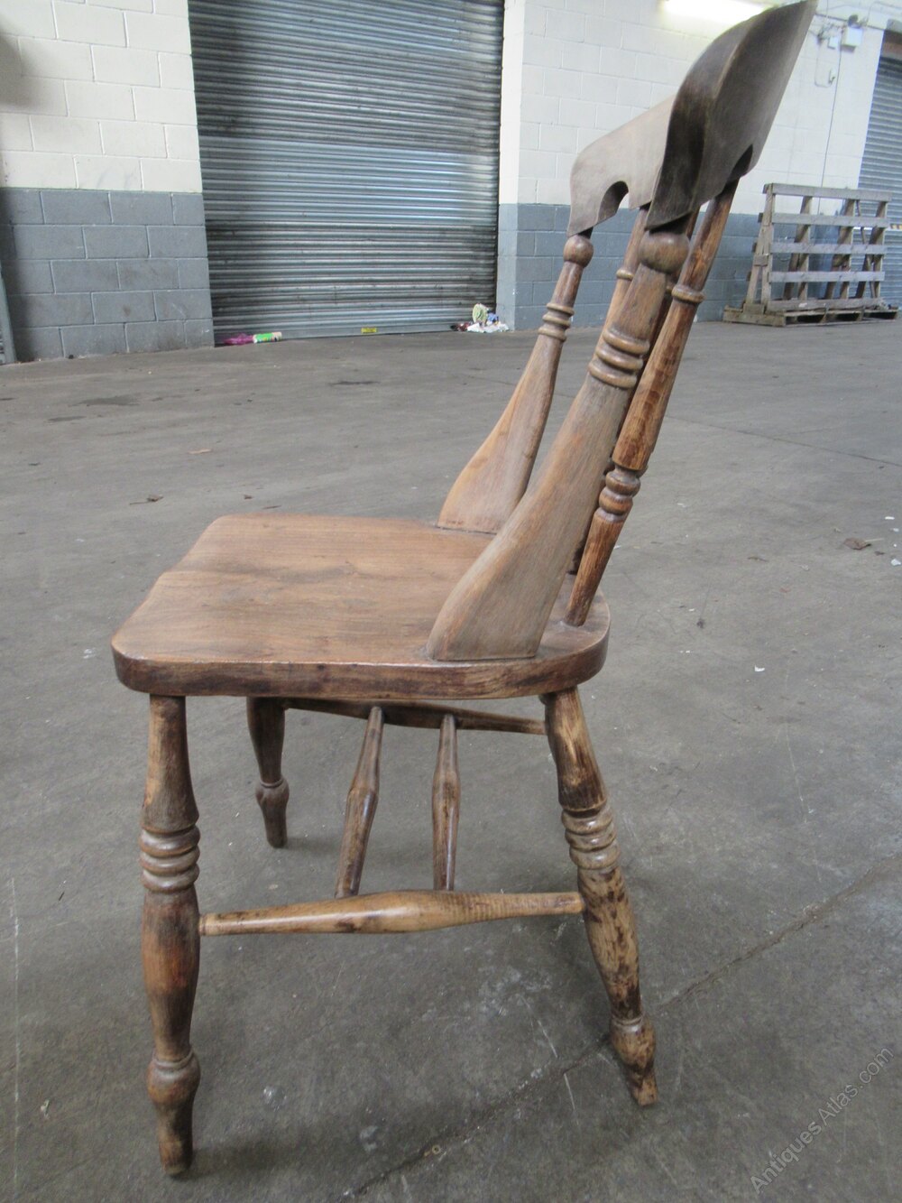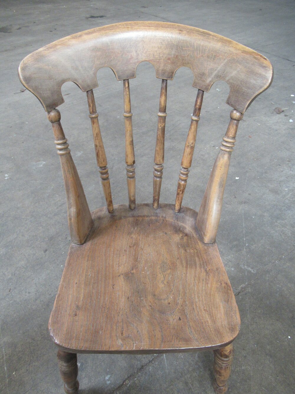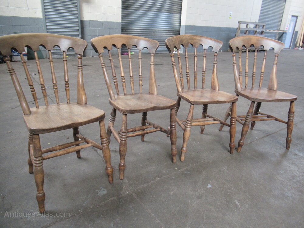 Set of four Victorian ash and elm kitchen dining chairs 1890s. The chairs have a shaped top and arched back with turned spindles. A shaped seat on four turned legs, with double cross stretchers.DateLate Victorian :