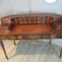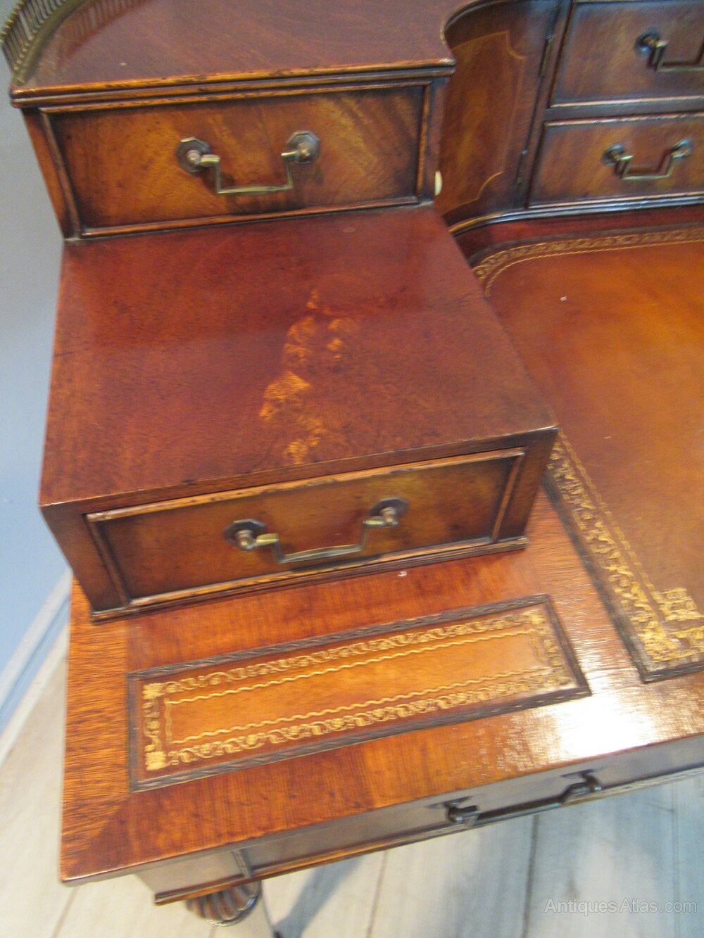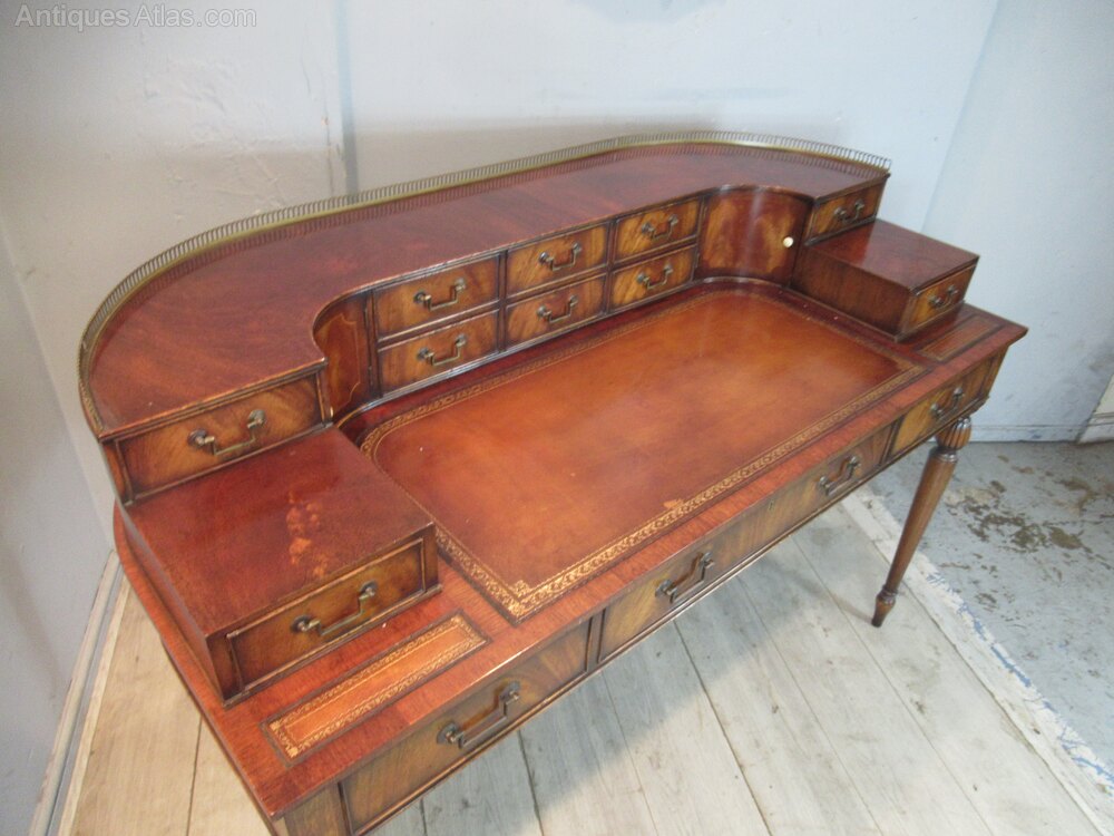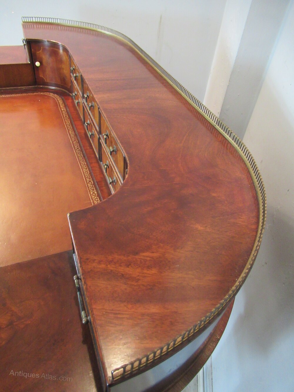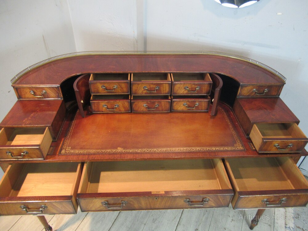 A mahogany Carlton house desk in the Georgian style , The desk stands on four fluted and carved legs . with three drawers to the top , with brass handles locks and key . The top surface has a tan leather liner with tooled gilt. The rounded back with stepped drawer to each side , so with eight small drawers in all and a convex cupboard to each corner.Date1990s