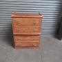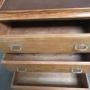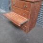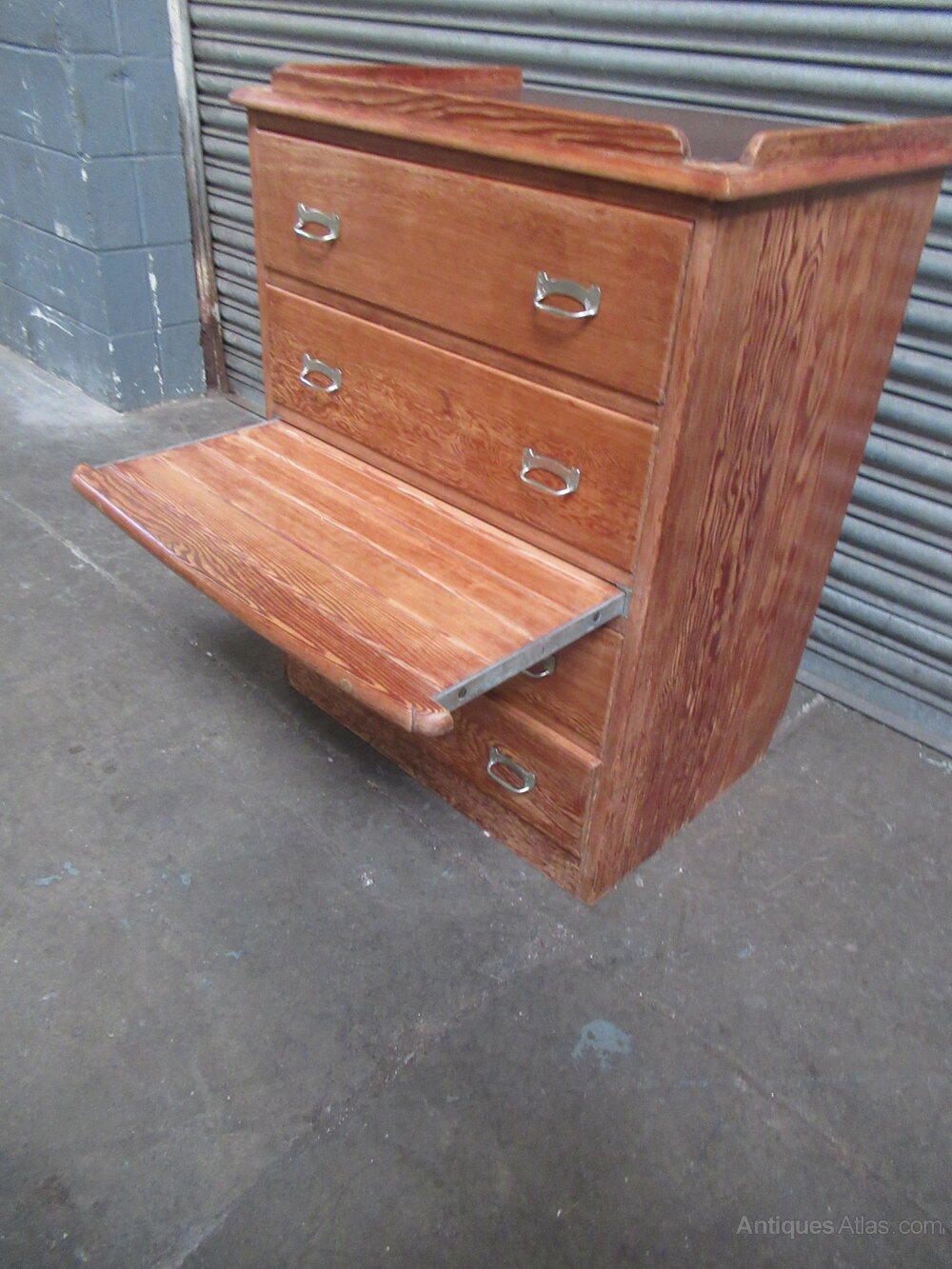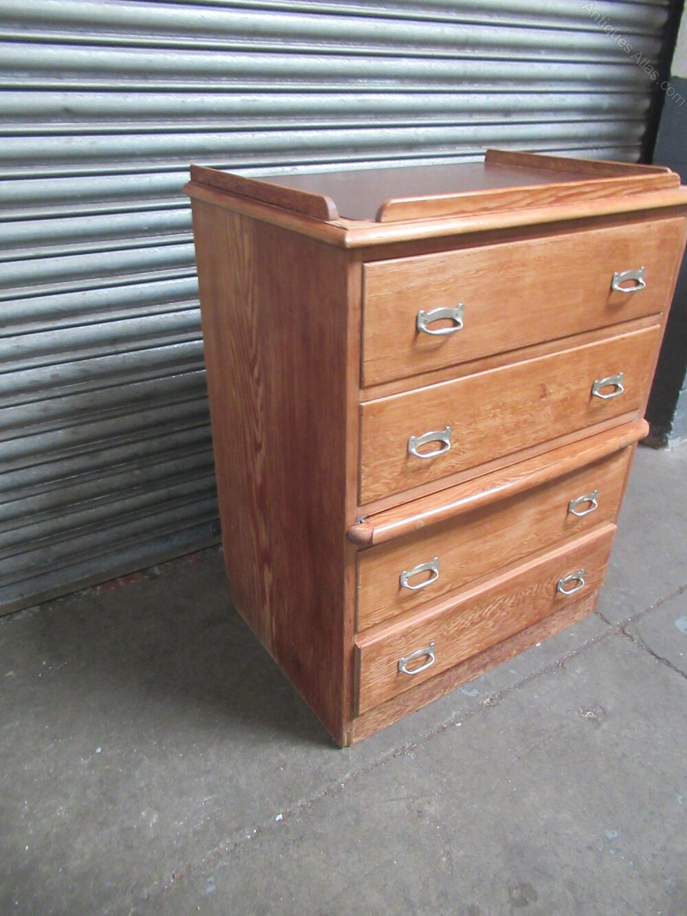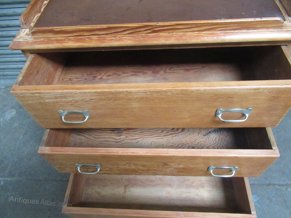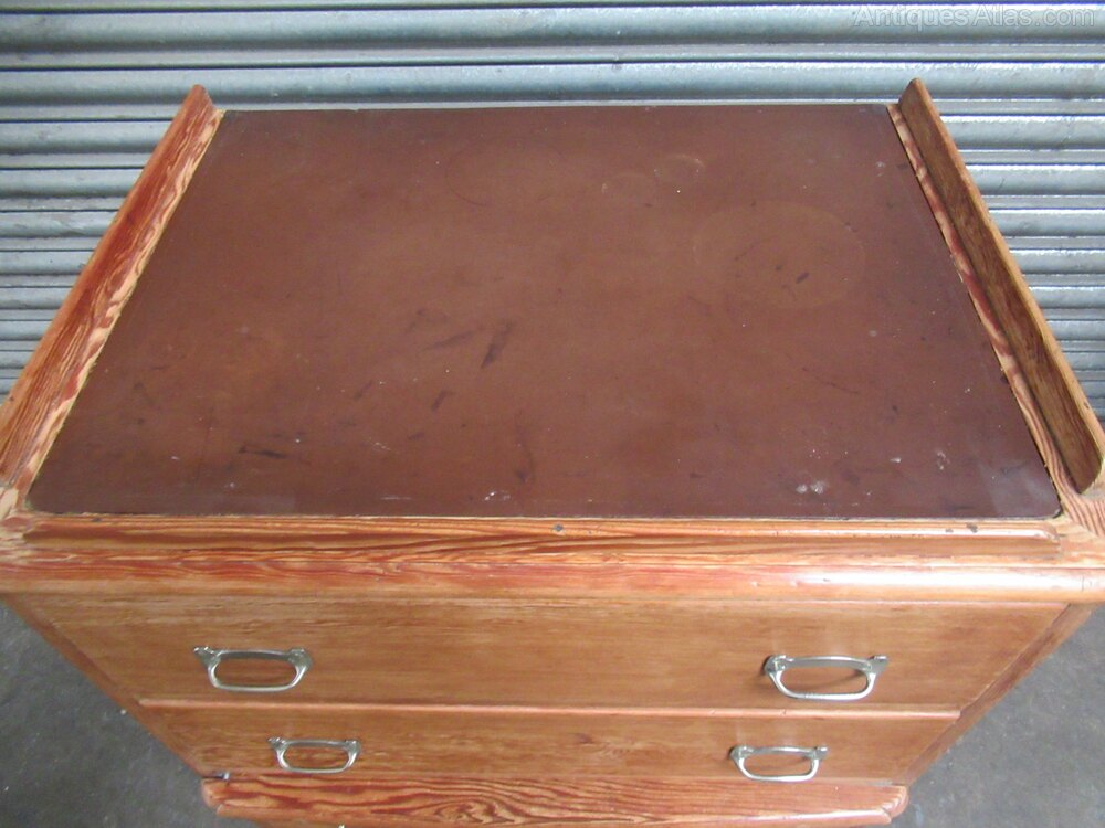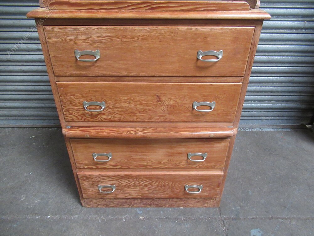 pitch pine ships chest of drawers , from SS Orontes 1929, built by Vickers Armstrong, Barrow in Furness.The chest has four drawers with Nickle metal handles . There is a pull out slide shelf / seat, the top of the chest has a gallery all round with a brown lino insert.