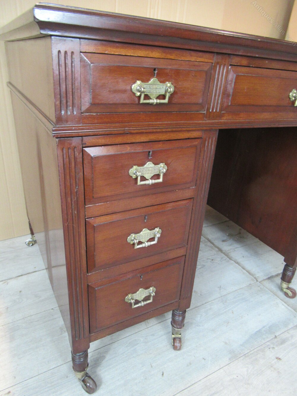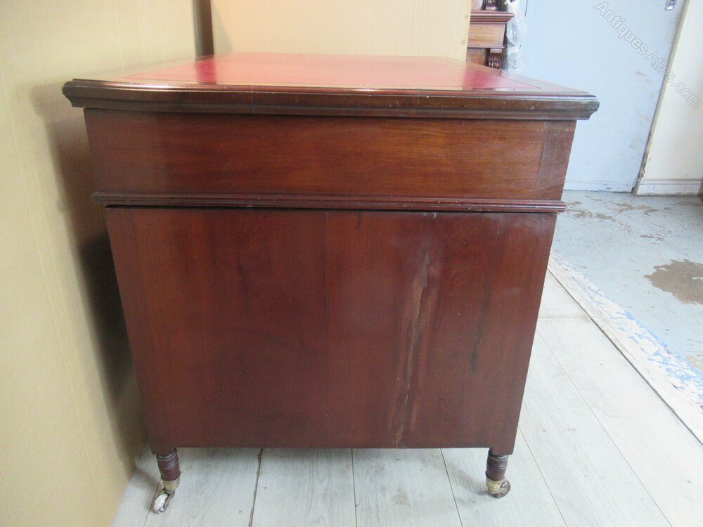 Late Victorian mahogany knee hole desk , which will split into three sections . The desk has nine drawers all with brass handles , standing on turned legs with brass cup casters .The top has a red leather liner with gilt tooled edging .DateLate Victorian :