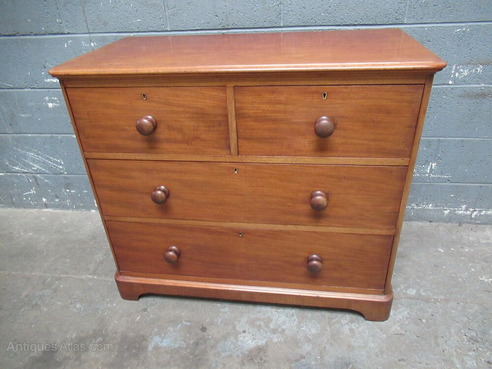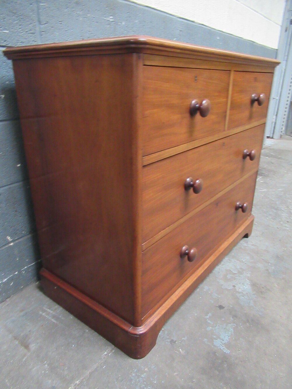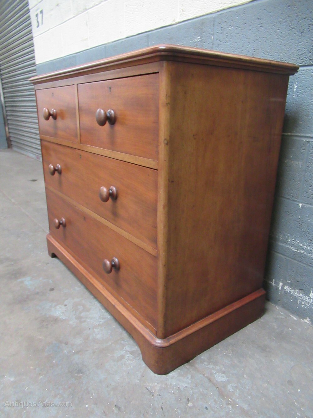 Victorian period mahogany chest of drawers dating to around 1880. The chest has two short and two long drawers , with mushroom shaped handles . With rounded corners and skirt base .DateLate Victorian :
