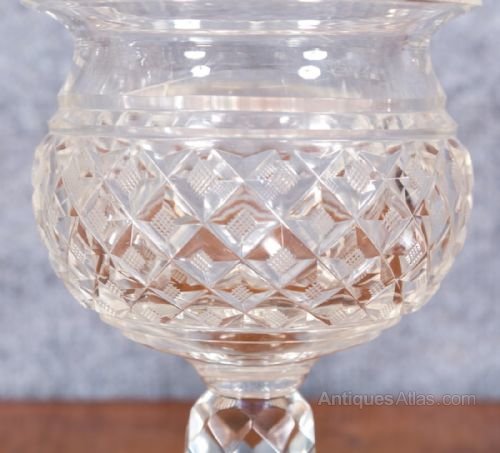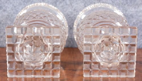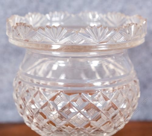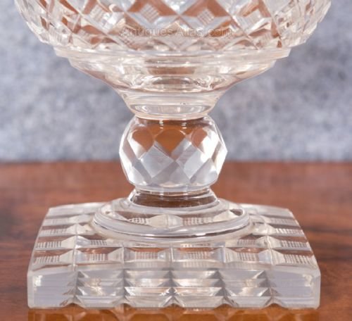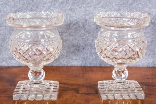 A good pair of heavy quality deep cut glass pedestal bowls / sweet meat dishes. The fan shaped cut glass tops with bulbous hob nail cut bowls, facet cut stems and deep cut square bases. Good condition, no breaks, chips or repairs. Size:- Height...7''/ 18cm. Diameter...4.75''/ 12cm. Free U.K. delivery.ALL TRADE ENQUIRIES WELCOME.