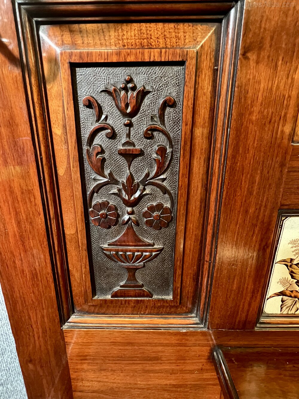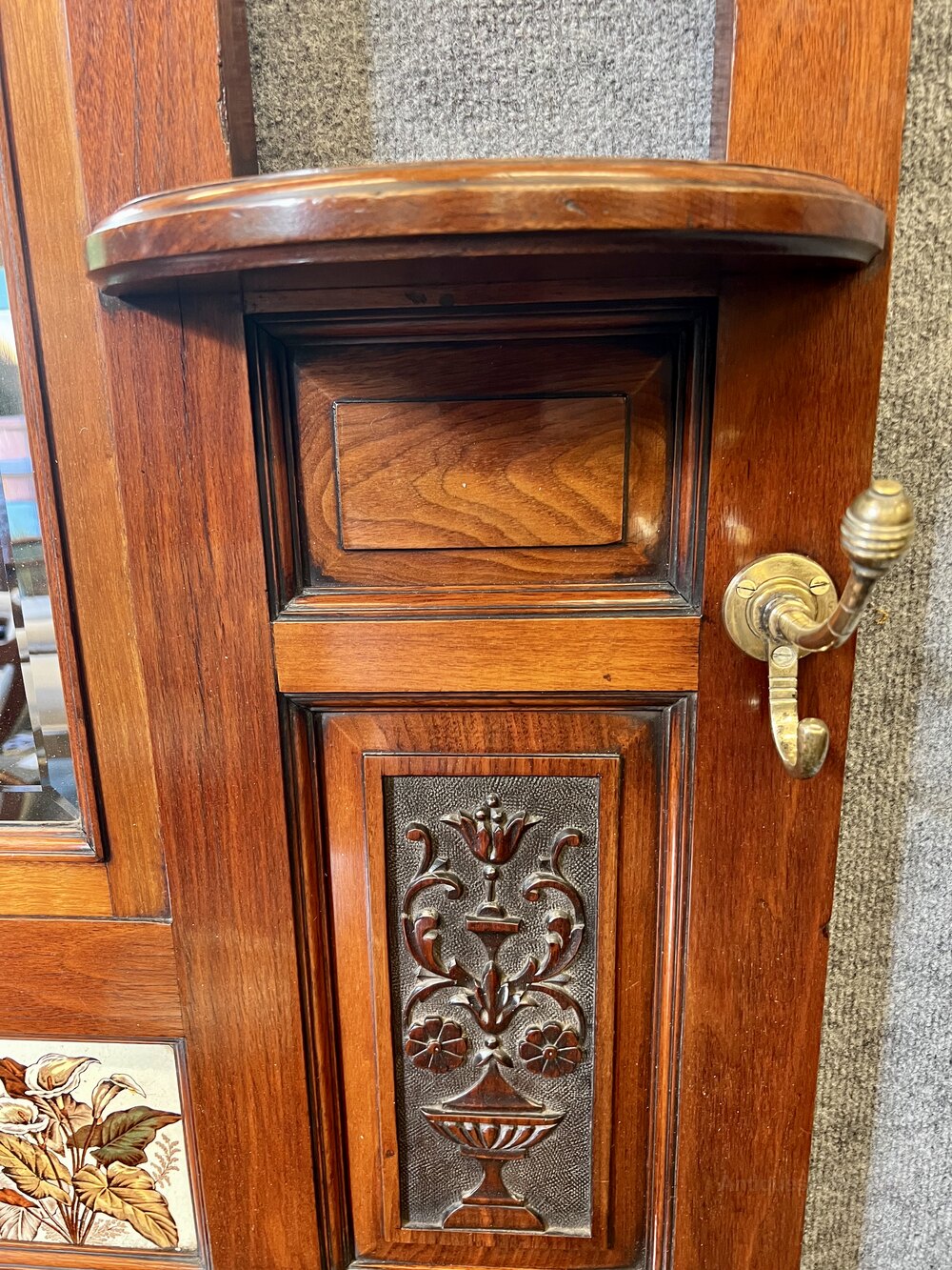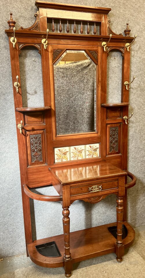 A good quality and very attractive Victorian walnut hall stand. The shaped top having a moulded edge above a turned spindle gallery and flanked by turned finials. The quality brass coat hooks are all original and hand polished. The centre having a bevel edged mirror flanked by demi lune shelves above fielded and decoratively carved panels centred by 3 ceramic tiles decorated with lilies and leaves.The lower section having a polished top with a useful drawer below which retains the brass handle. To each side are umbrella or stick stands with drip trays below. Condition- Very good and original, fully burnished in our own workshop. The tiles with reg. numbers to the back No 35. Rg. des. 67048 (possibly Minton).Dimensions:- Height…85.5’’/ 217cm. Width…42’’/ 107cm. Depth…16’’/ 40.5cm. Delivery to most of U.K. mainland £75.ALL TRADE ENQUIRIES WELCOME.