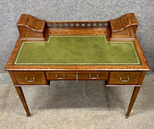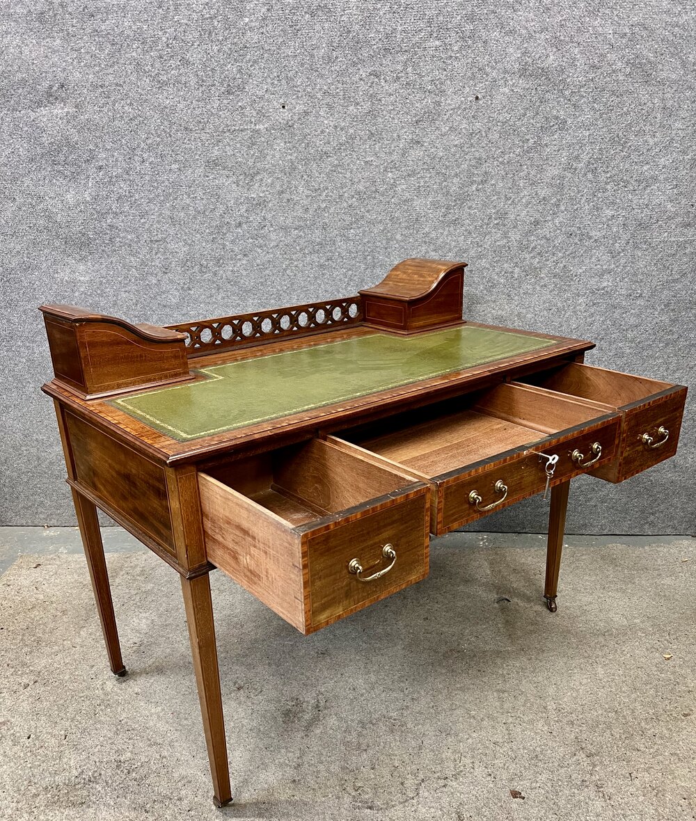 An Edwardian inlaid Sheraton revival ladies writing table or desk. The top having a superstructure with serpentine shaped falls both with stationary compartments with a pen tray to one side and paper clip holder to the other. The writing surface with a re-placed hand dyed green leather which has traditional blind and gold tooling set within inlaid satinwood cross banded border. Below is a shallow drawer with working lock & keys which is flanked by 2 deeper drawers and all having mahogany linings, original brass handles and satinwood banding. Standing on square tapering legs with boxwood stinging and brass and porcelain casters. The whole inlaid throughout with satinwood cross banding between boxwood and ebony lines and further boxwood outline stringing. Condition- Fine. Dimensions:- Max.Height…34.25''/ 87cm. Writing Height…28.75’’/ 73cm. Width…42''/ 107cm. Depth...22''/ 56cm. Delivery to most of U.K. mainland £50.ALL TRADE ENQUIRIES WELCOME.