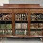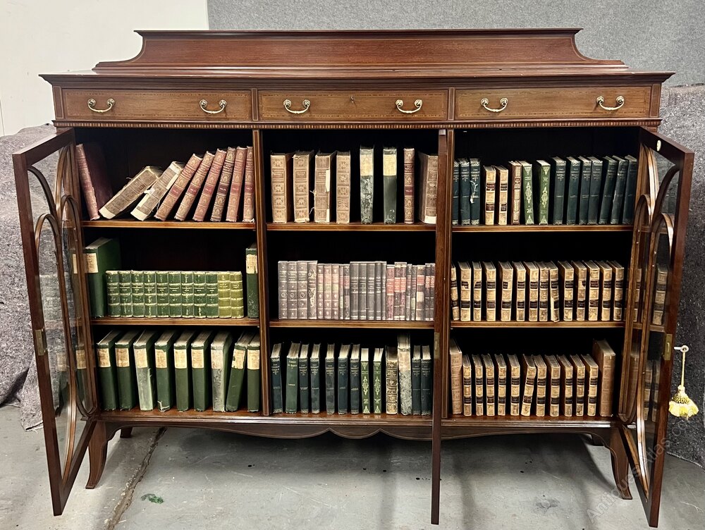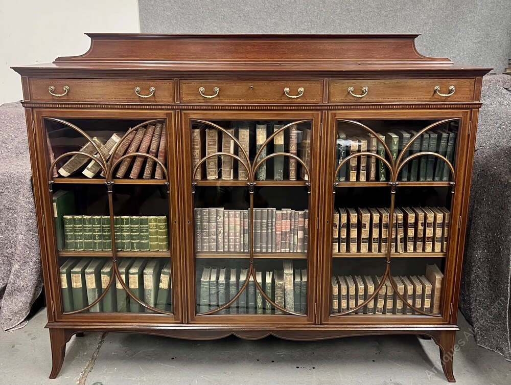 A superb quality Maple & Co of London Edwardian mahogany and inlaid substantial bookcase. The rectangular top having a shaped and inlaid up-stand with moulded top. Below are 3 useful drawers all having satinwood banding between boxwood and ebony lines and retaining the original brass handles. The frieze with alternate mahogany and satinwood inlay and leading to the 3 doors all having conforming inlay and wonderful astragal glazing bars. The interiors all have 3 adjustable mahogany shelves with 2 lines of boxwood stringing (only 2 shelves used in picts). The whole raised on an outline inlaid frieze with spayed bracket feet.Condition- Very good. Dimensions:- Max.Height inc Up-stand…59’’/ 150cm. Width…72’’/ 183cm. Depth...15.75''/ 40cm. Interior Shelf Depth…12.5’’/ 32cm. Up-stand inc….5’’/ 13cm.