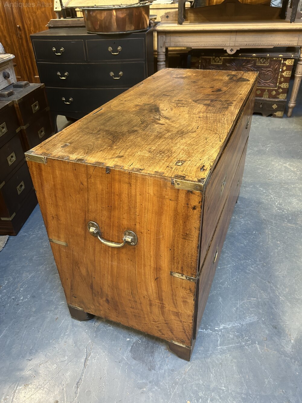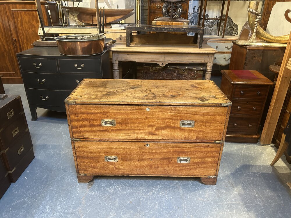 Of good colour and well figured this camphorwood chest ( bottom section of original 2 part , probably Colonially made) has brass bindings throughout, the 2 drawers ( Bramah locks) with sunken brass handles and carrying handles to each side, raised on block feet.(unusually the chest is solid camphor throughout )