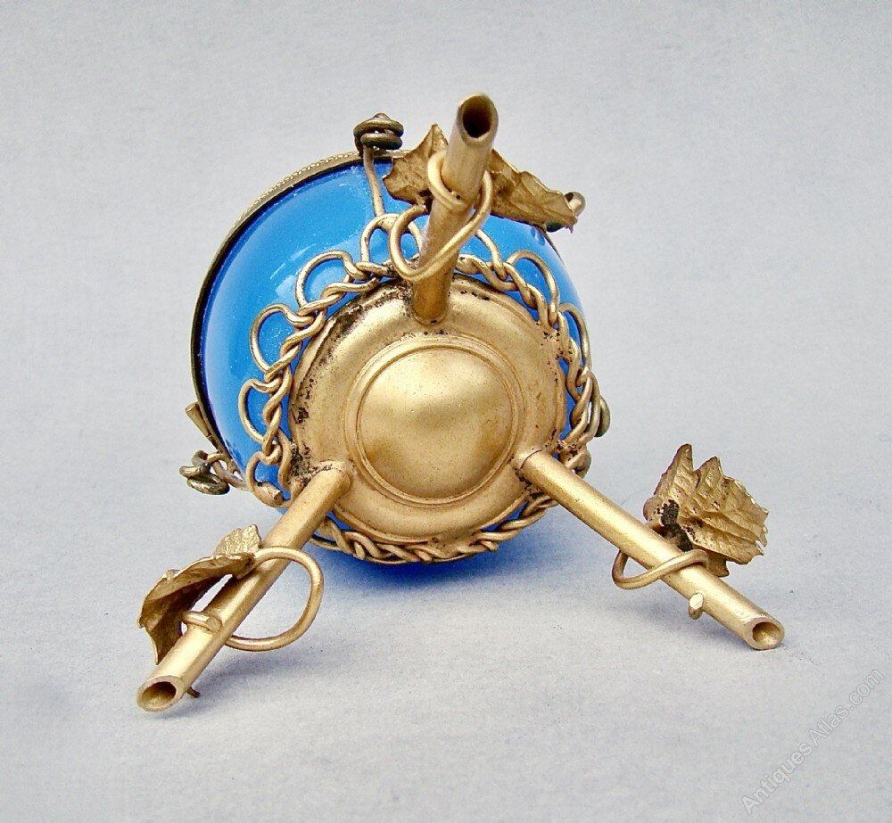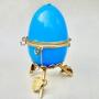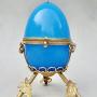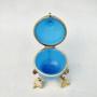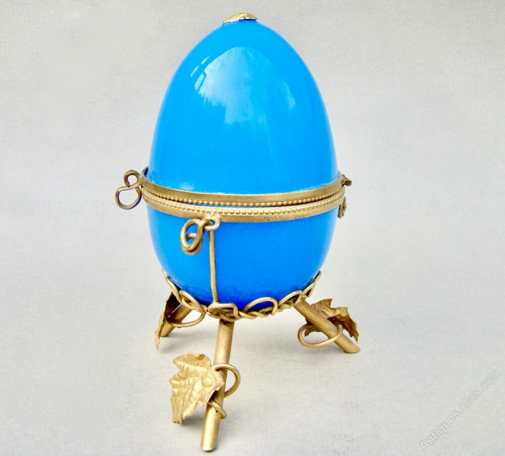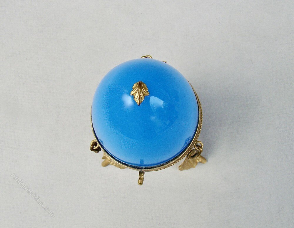 This stunning and rather rare 19th C. French Palais Royal blue opaline glass casket dates circa 1870. The rich blue opaline glass egg with a central ormulu hinge. The top embellished by a gilt leaf. The egg mounted a beautiful bronze dore tripod satnd applied with leaves.Palais Royal is a term used to describe, not a single manufacturer, but to a name given to a small area around the Royal Palace that specialised in producing small elaborate works of art and gifts in the 18th and 19th centuries.