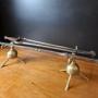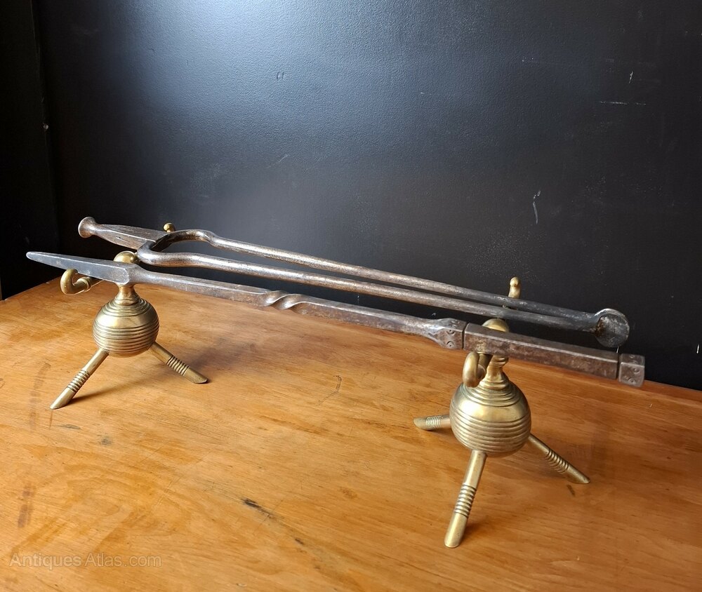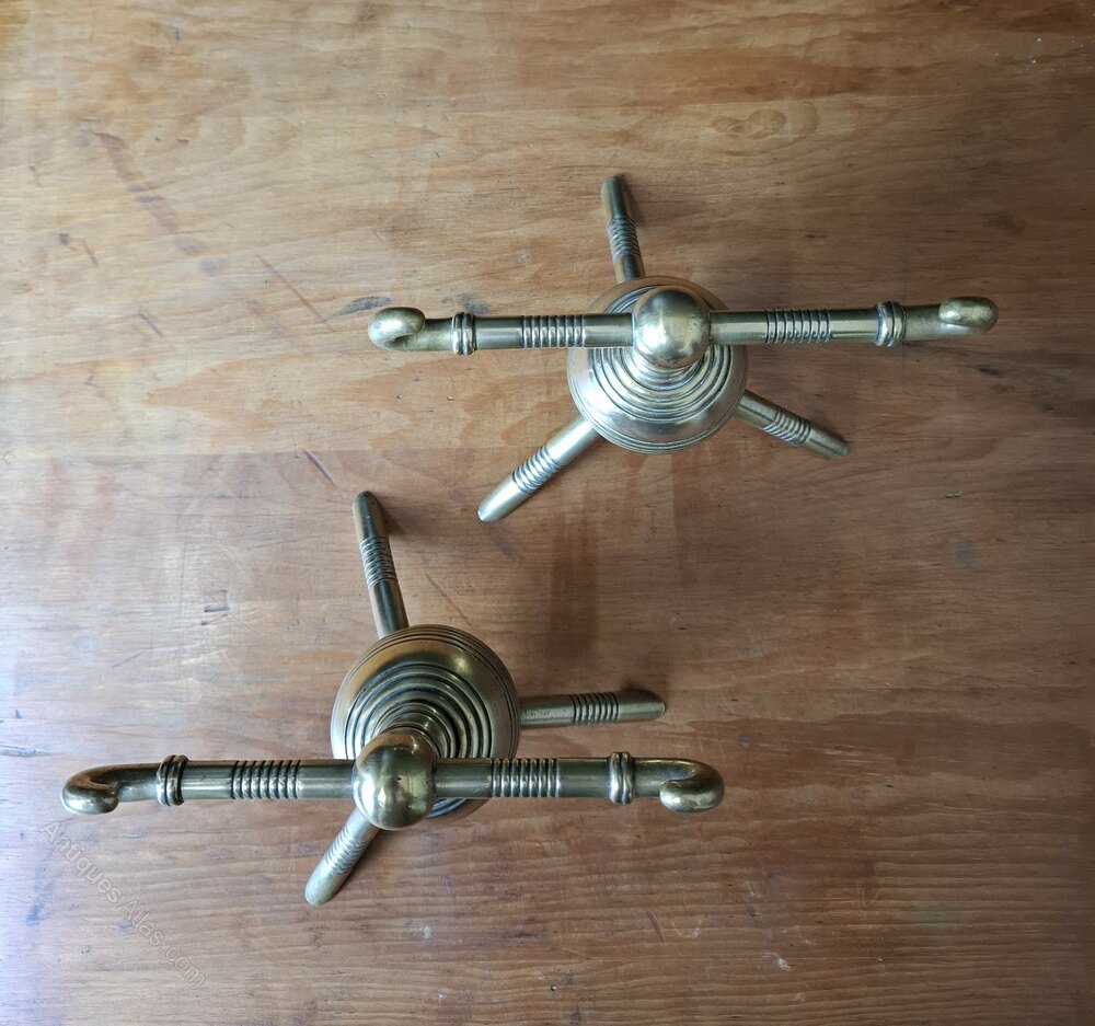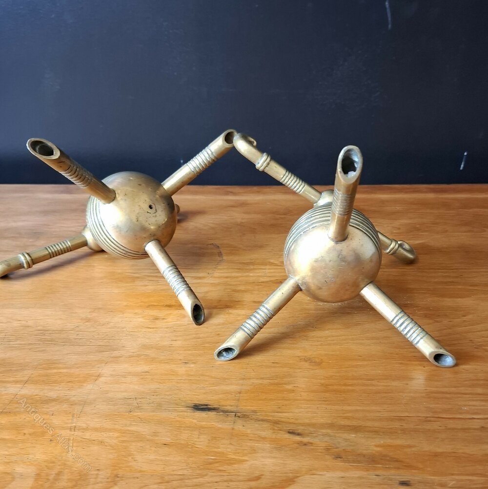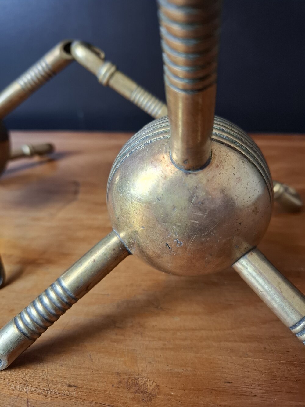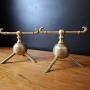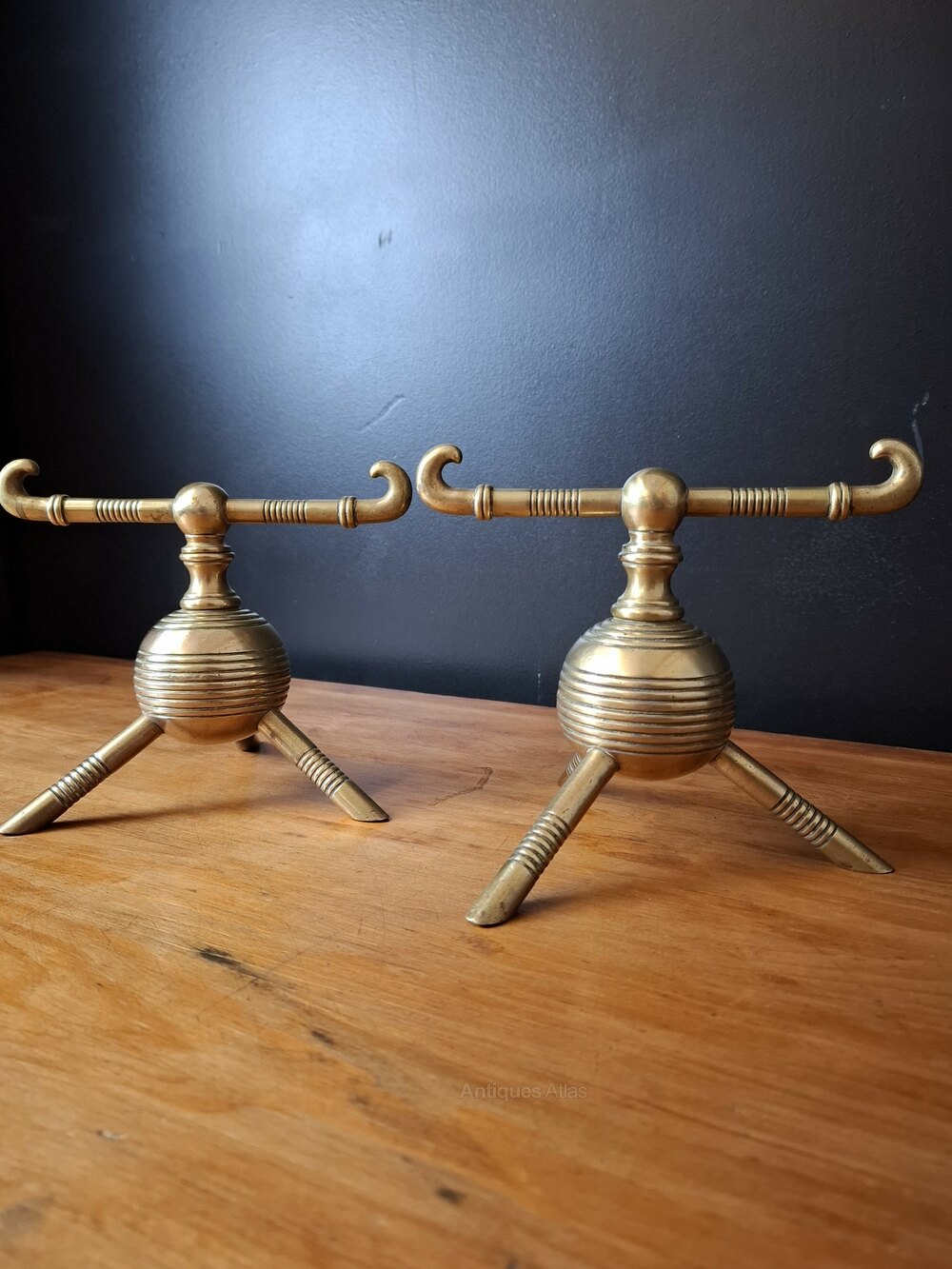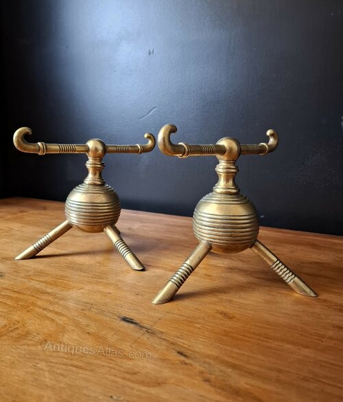 Neat pair of Victorian fire dogs designed by Dr Christopher Dresser in the Aesthetic taste circa 1880. Made in brass, showing some age and wear and not over cleaned. The feet are firm with no movement.One has impressed '13' underside. Possibly made by the Birmingham firm of Benham & Froud.