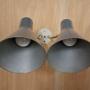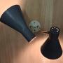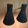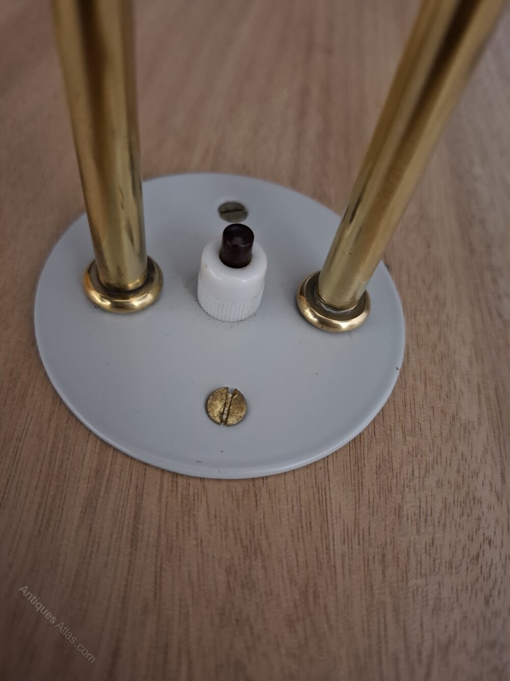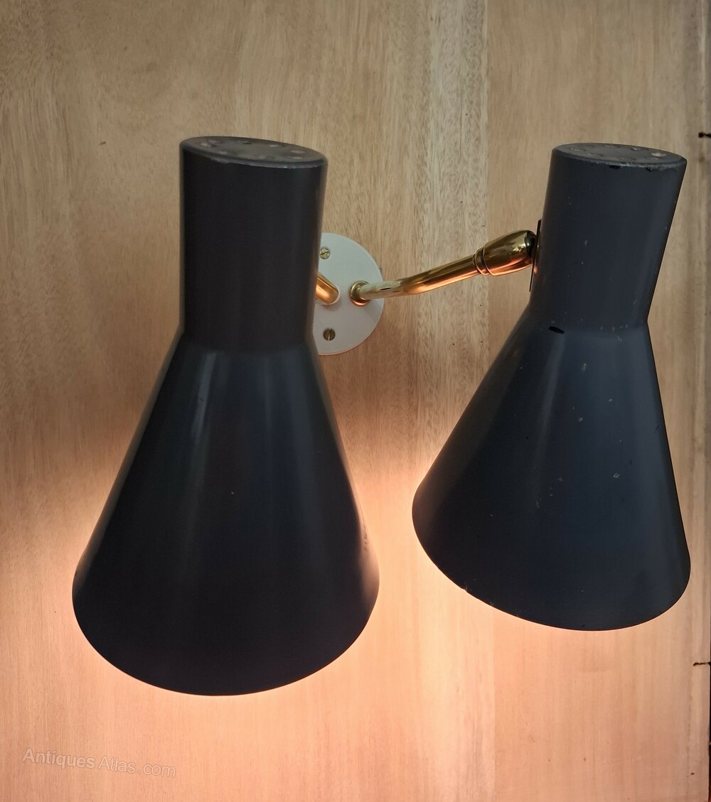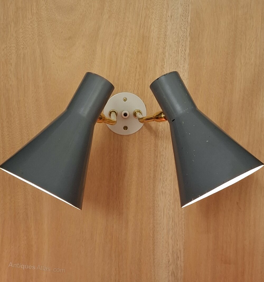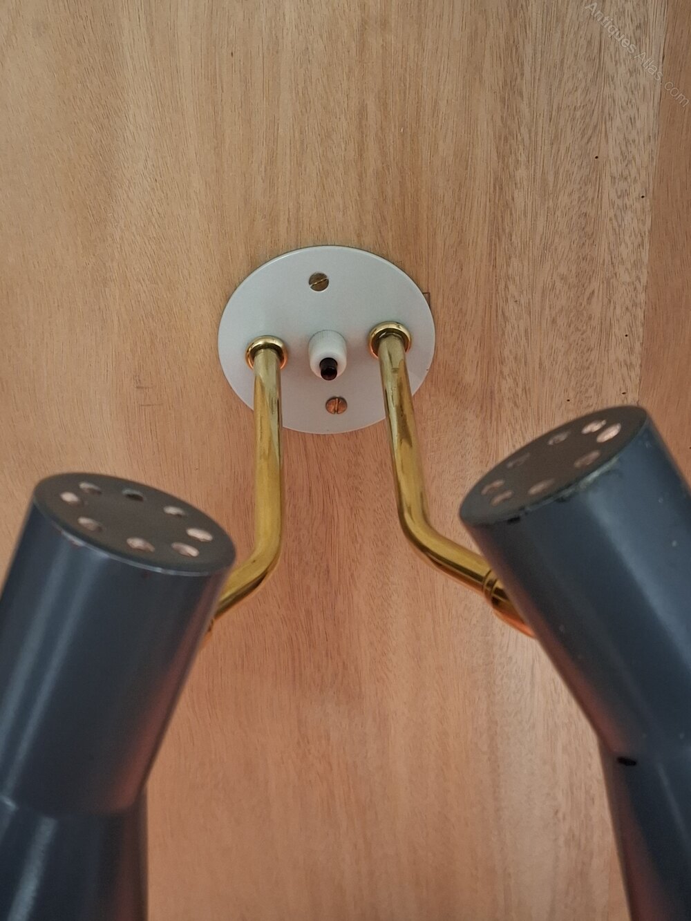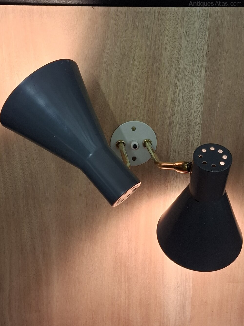 Stylish twin light set in the Italian style. Made c1960 in factory painted alloy shades and solid brass stems with smooth working multi-position fittings. The steel light grey base plate is original and has been re-powder coated. The switch is working well.Re-wired and PAT tested .Bulb fitment is B22 ,Bayonet. Note that the switch module will have to be concealed in your wall (see the last image ).