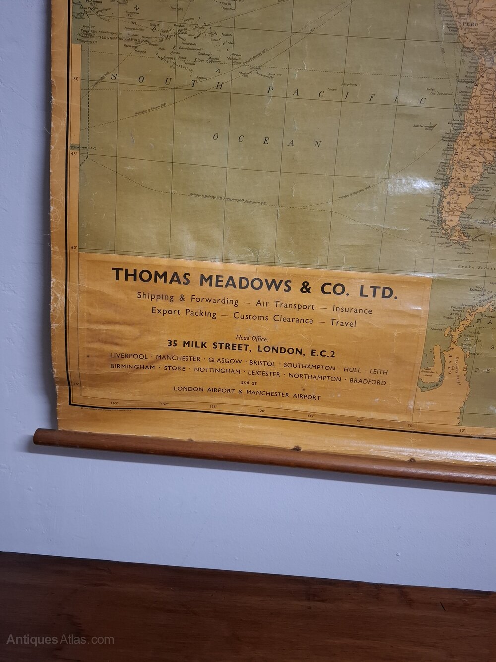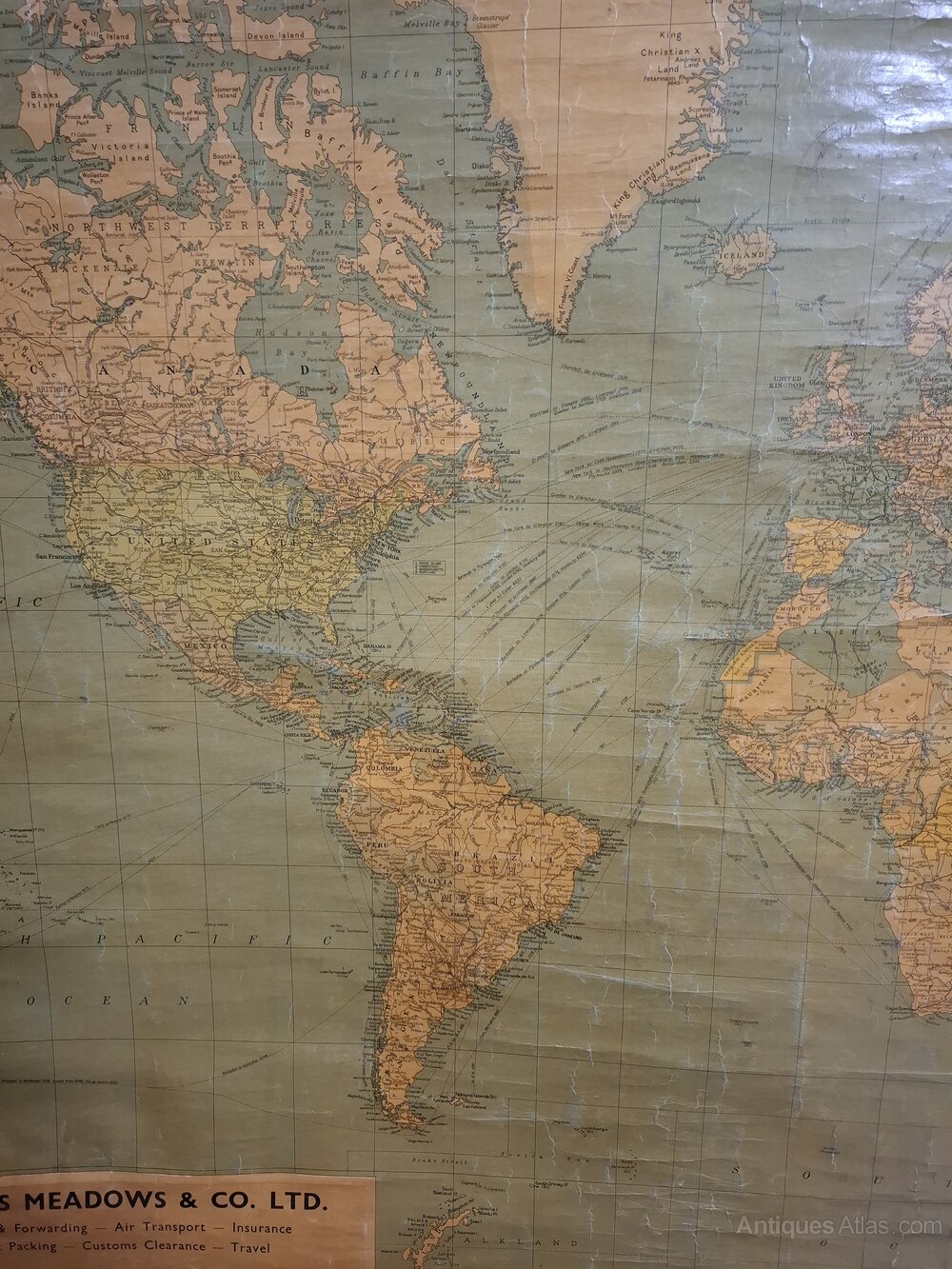 Vintage map backed with linen in original used condition. Possibly used in a transport office in 1950s. The paper has taken on a smoked stain reflecting the chain smoking employees typical of the time.Size 122cm by 91cm.