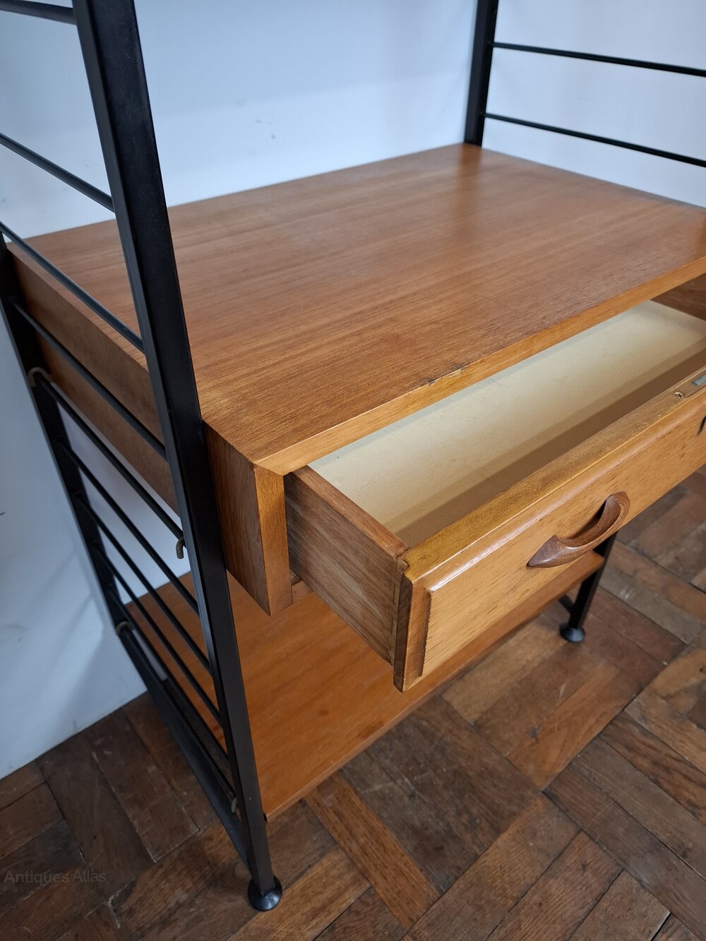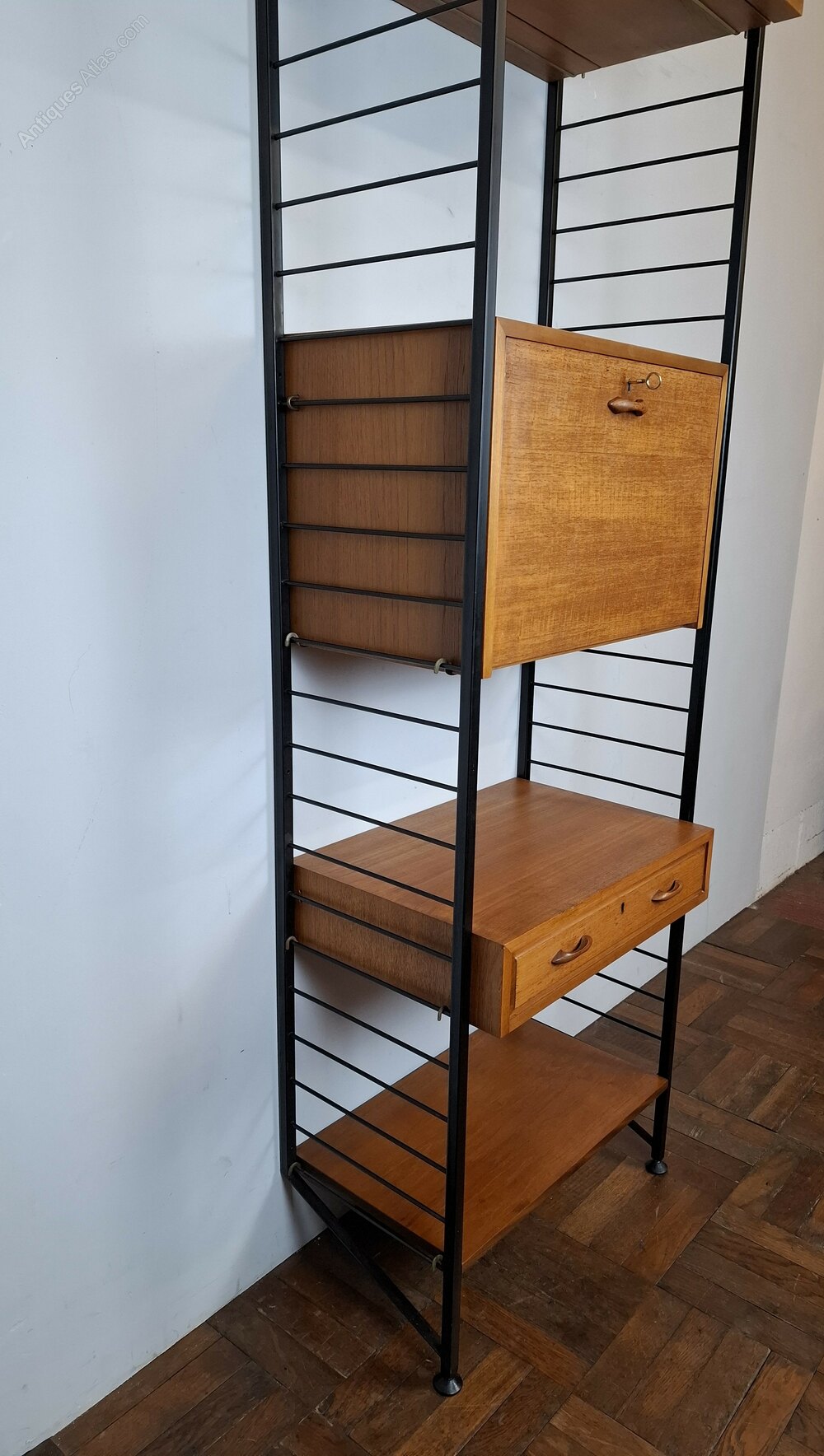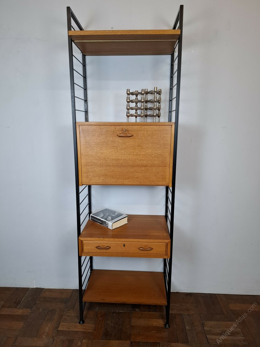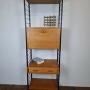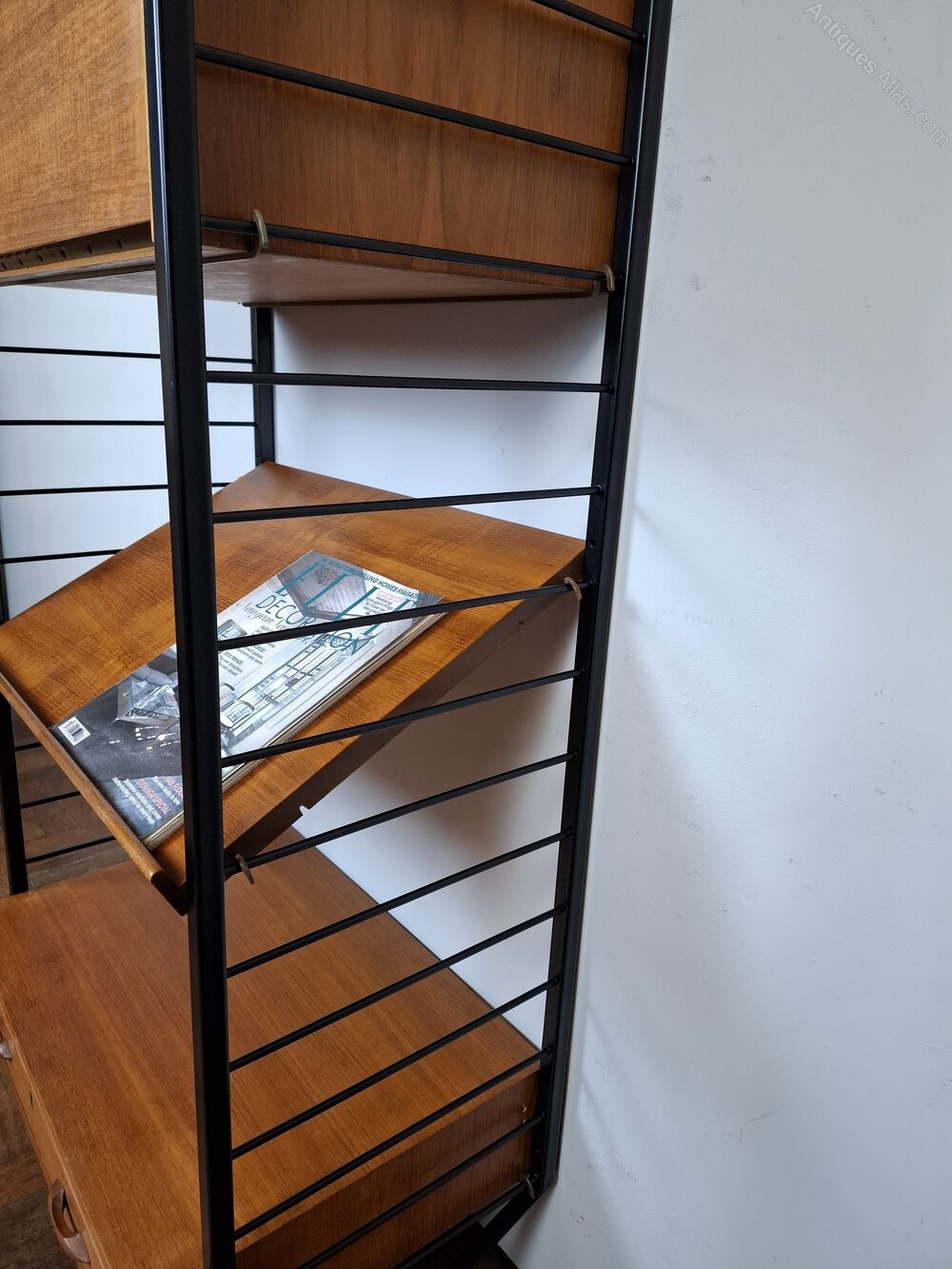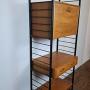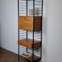 British mid-century "Ladderax" shelving system.Very flexible, teak veneer and black powder coated steel shelving uprights by Staples & Co., London 1960s.This stylish practical product was designed by Robert Heal (of the Heals store family) in the 1960s and manufactured in England.