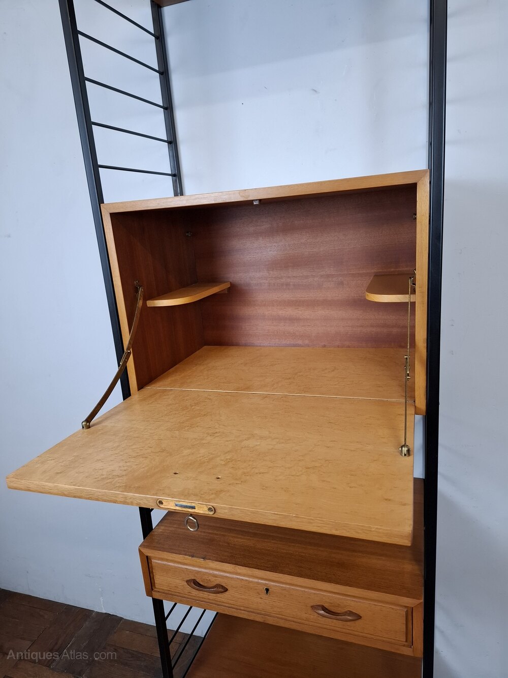 The lockable storage cupboard with key, comes with two original anti-tip hooks , that are discreetly attached to the ladders for extra stability and safety. The interior is veneered in birds-eye maple. .