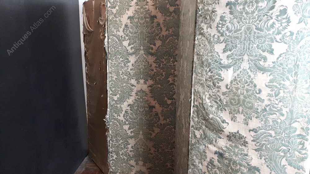 Rare Fortuny 'Dandolo' hand-printed fabric from 1920s attached to hardwood 4 leaf screen of large dimensions. The design is based on Italian 17th century designs.Fabric is cotton and shows wear in some places with some staining thought to be water near to the bottom. Reverse also has the same textile but with damage to some areas. Selvedge has name printed on.