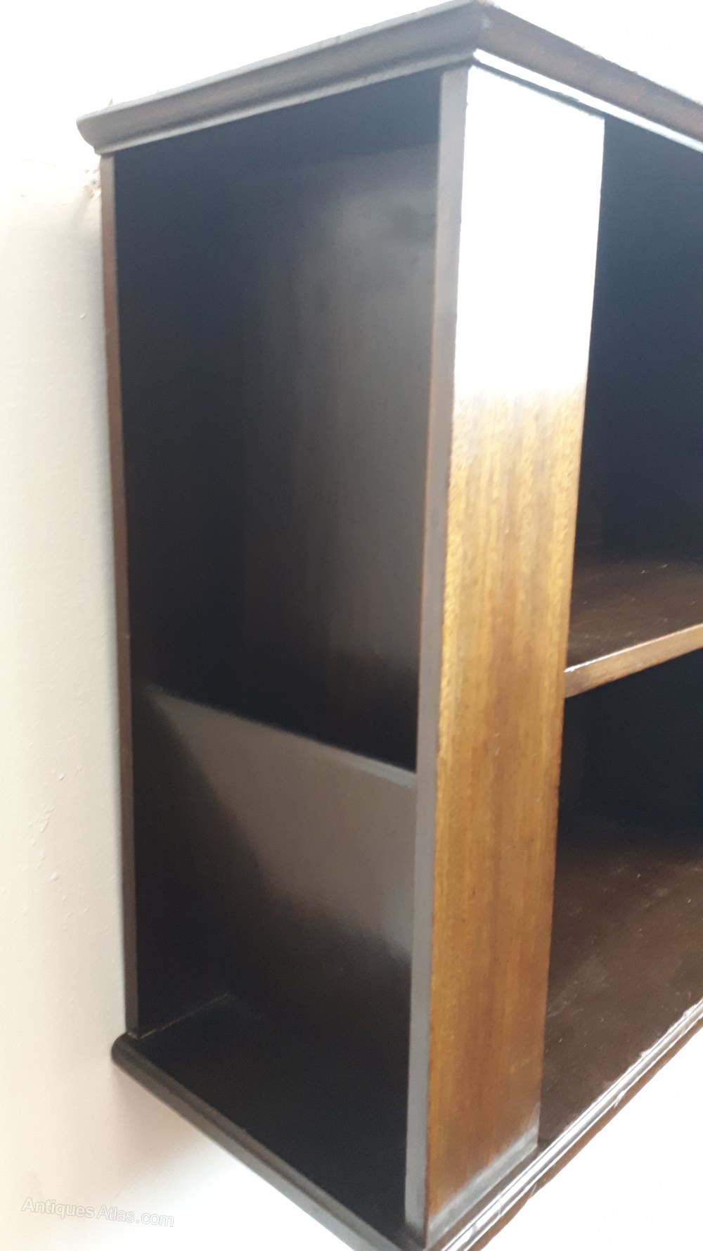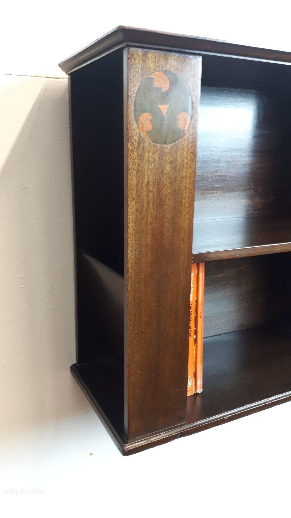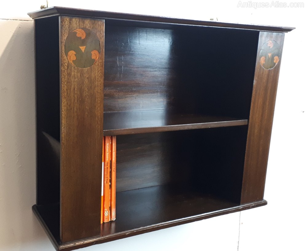 A charming mahogany and beech English wall bookcase with fruitwood marquetry in good condition circa 1900.Both sides have angled pockets for papers etc.Size 21" width