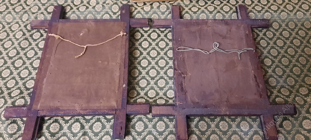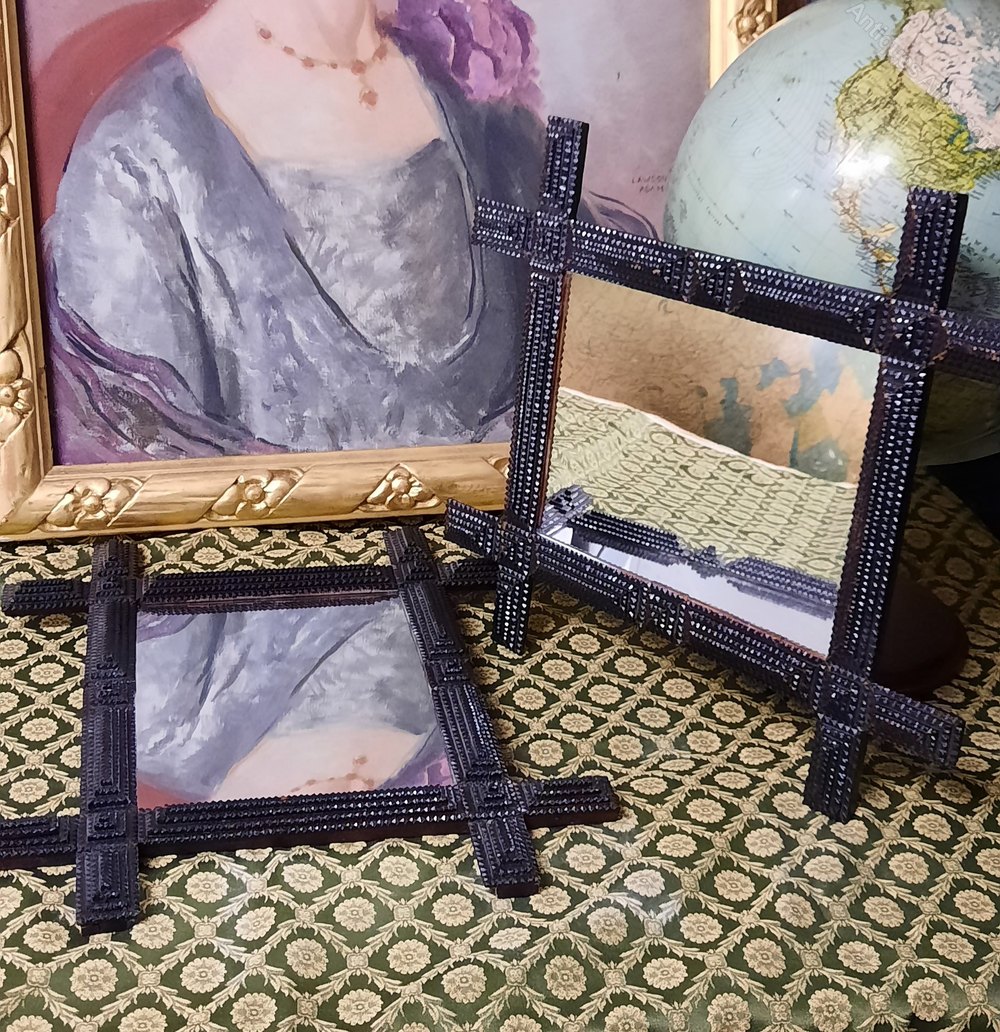 These are probably English in origin, circa late 19th century, having had a picture print first. Replaced old glass in one frame with aged marks to the silvering and the other contains contemporary glass.