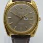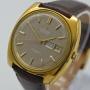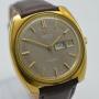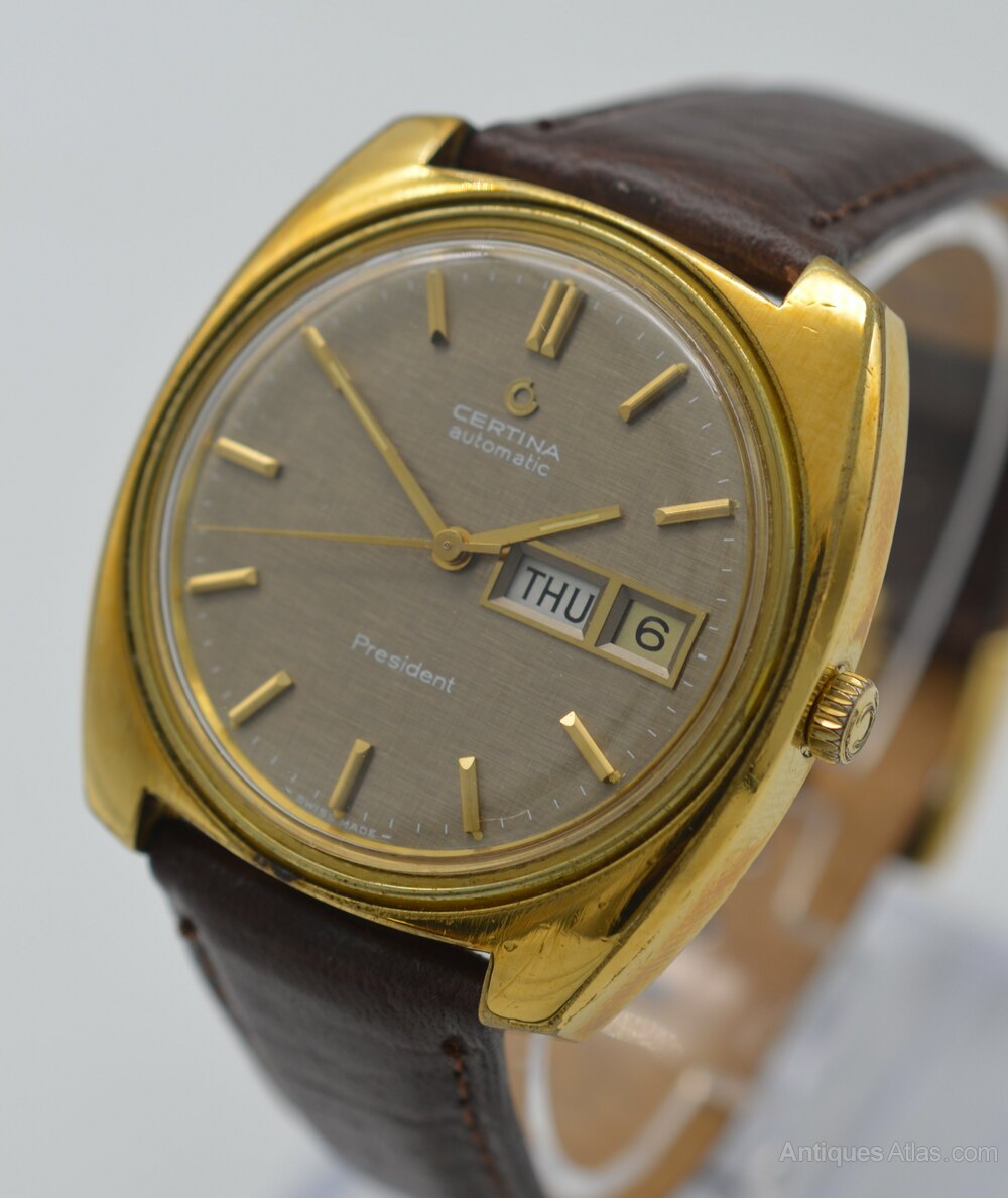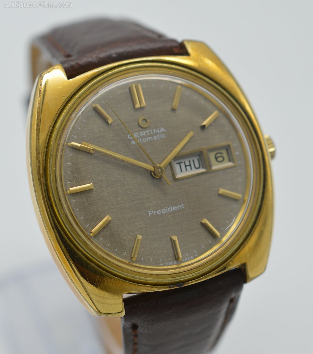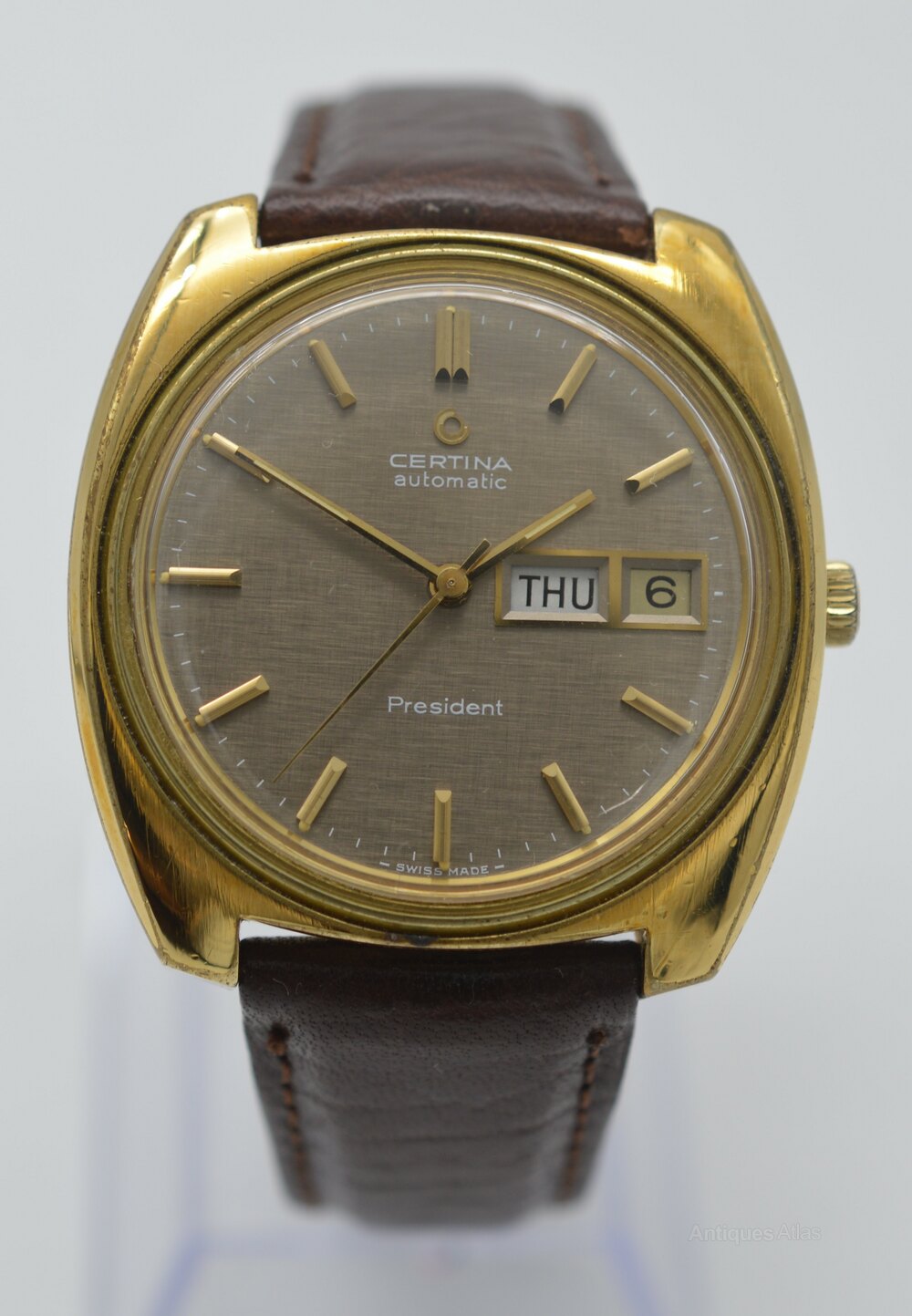 A 1960s Certina President gold filled wristwatch. A highly detailed dial, with a linen effect dial finished in light brown. Applied gilt hour markers, doubled at 12 o'clock. A day-date aperture to 3 o'clock, surrounded by a gilt frame. Applied Certina logo to 12 o'clock, with a white script for the make and model. The hours and minutes are indicated by slim gilt hands.A good quality, gold filled case of an oversized design. The case body has soft, sloping edges to the lugs and edges. A stainless steel screw down case back. Signed to the inner 'Certina Watch Corp'. The watch has retained its original Certina winding crown.