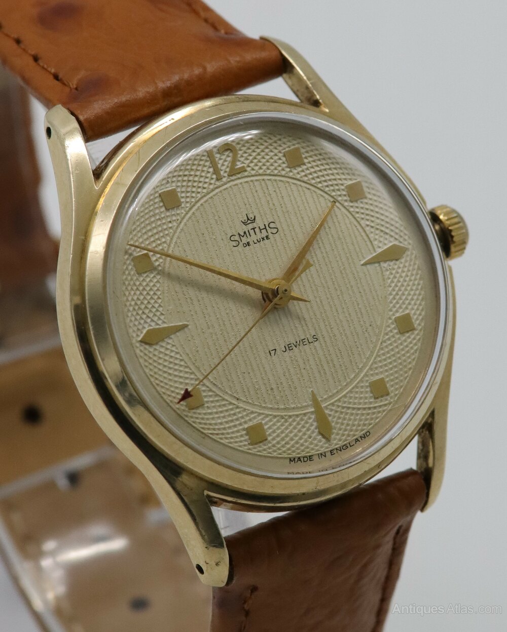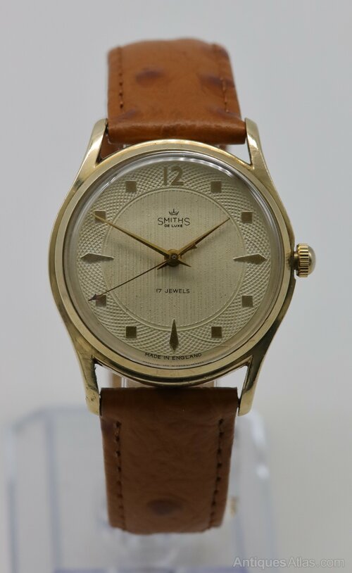 A 1956 Smiths De Luxe 9K gold wristwatch. A matte effect dial, with intricate design. The central dial has textured pinstripes, whilst the surround gives off a concentric effect. Applied gilt hour markers, with square blocks, elongated markers at the quarters and a 12 to the top. Signed Smiths De Luxe and 'made in England' to 6 o'clock. The hours and minutes are indicated by gilt hands, along with the classic Smiths signature of a red tipped seconds hand.A solid 9K gold case with slim lugs, tapering to the ends and champfered to the edges. A fairly deep case body, with a screw down case back showing a long service award for 1956. This particular award bears the mark for Bristol Bus company. Signed to the inner 'Dennison'.