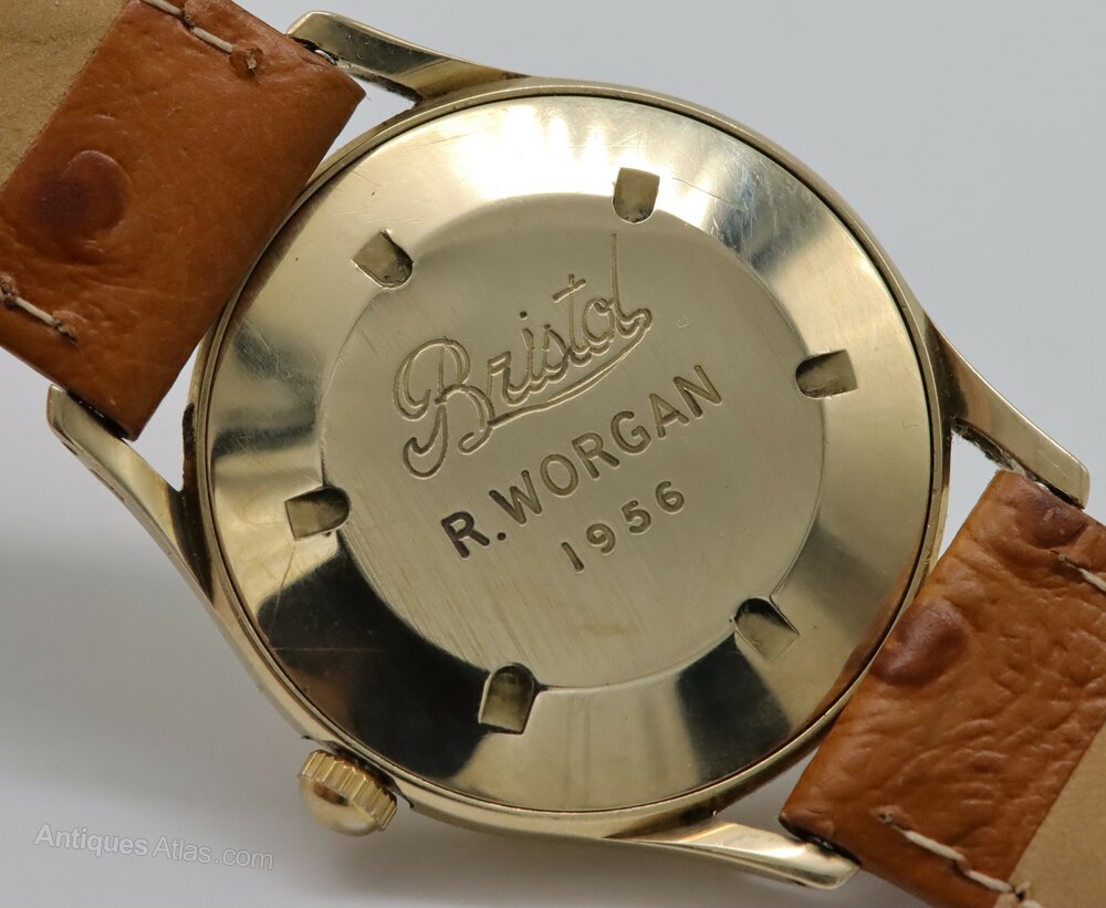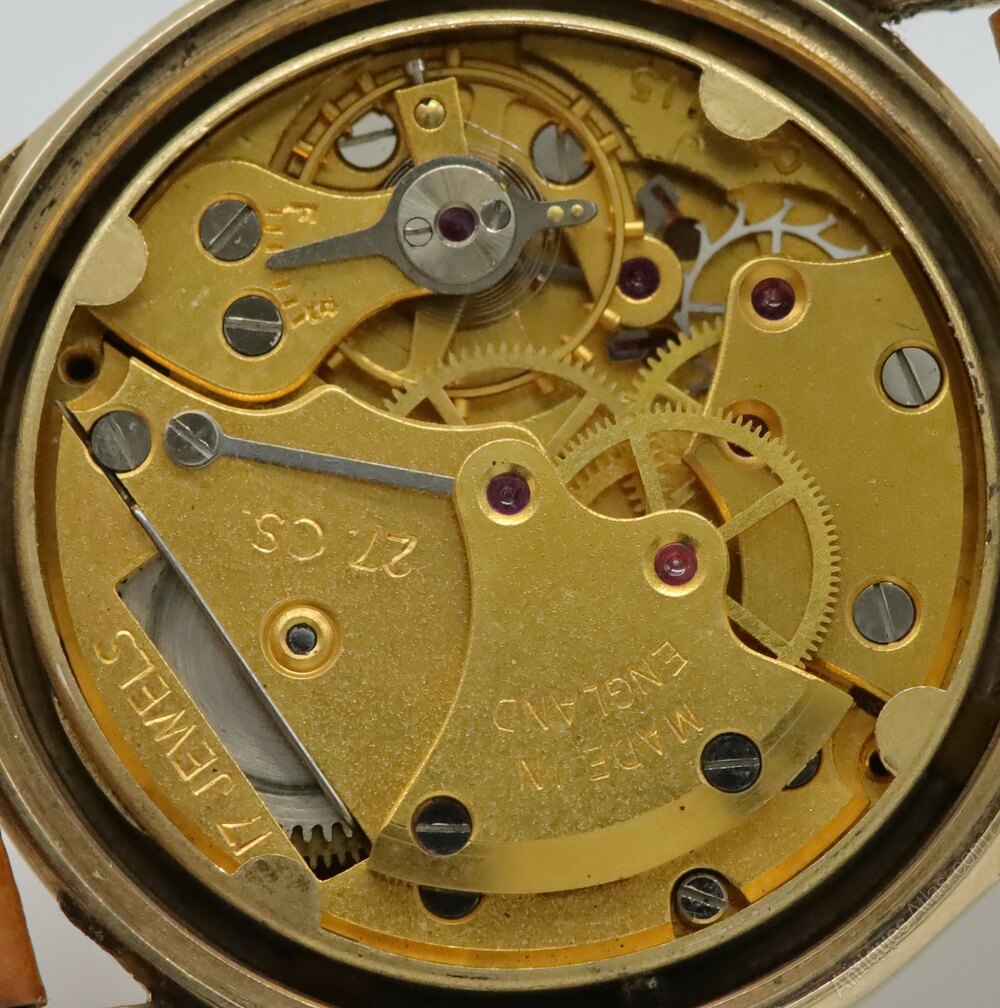 The watch is powered by a 17 jewel Smiths caliber 27.CS. Birmingham gold hallmarks show the production date for this watch as 1956.