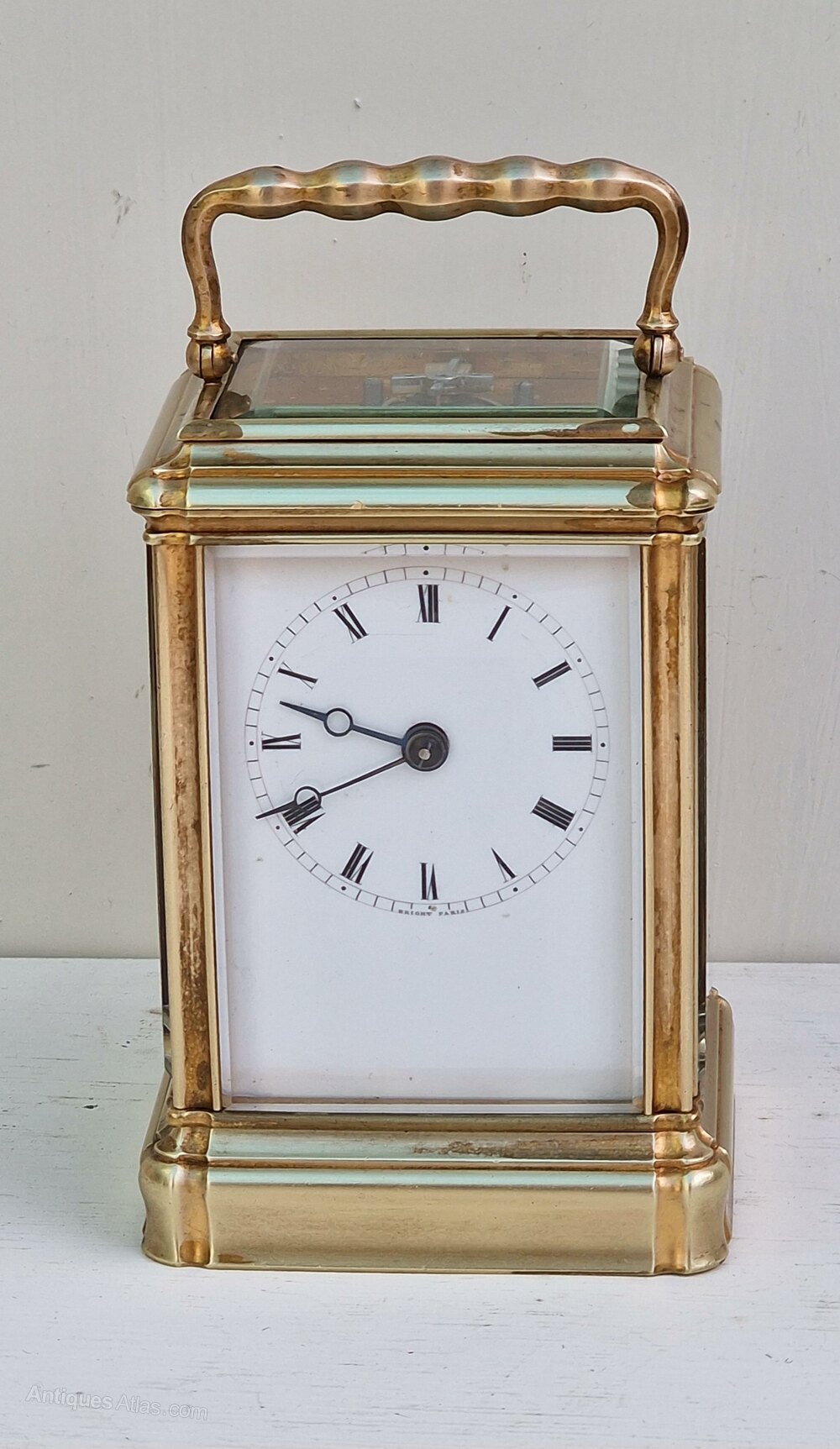 A small proportioned, French striking carriage clock. An enamel dial with Roman numerals and blued steel 'moon' hands. Concave and convex case mouldings to the 'gorge' case. A decorative handle to the top. There is remnants of the old gilding to parts of the case. The mechanism is engraved to the backplate 'BRIGHT PARIS'. Gorge cased clocks are earlier examples and the cases are made to a higher standard and detail. Circa 1860.An 8-day duration mechanism striking the hours and 1/2 hours on a gong. The original escapement visible through the large top glass.