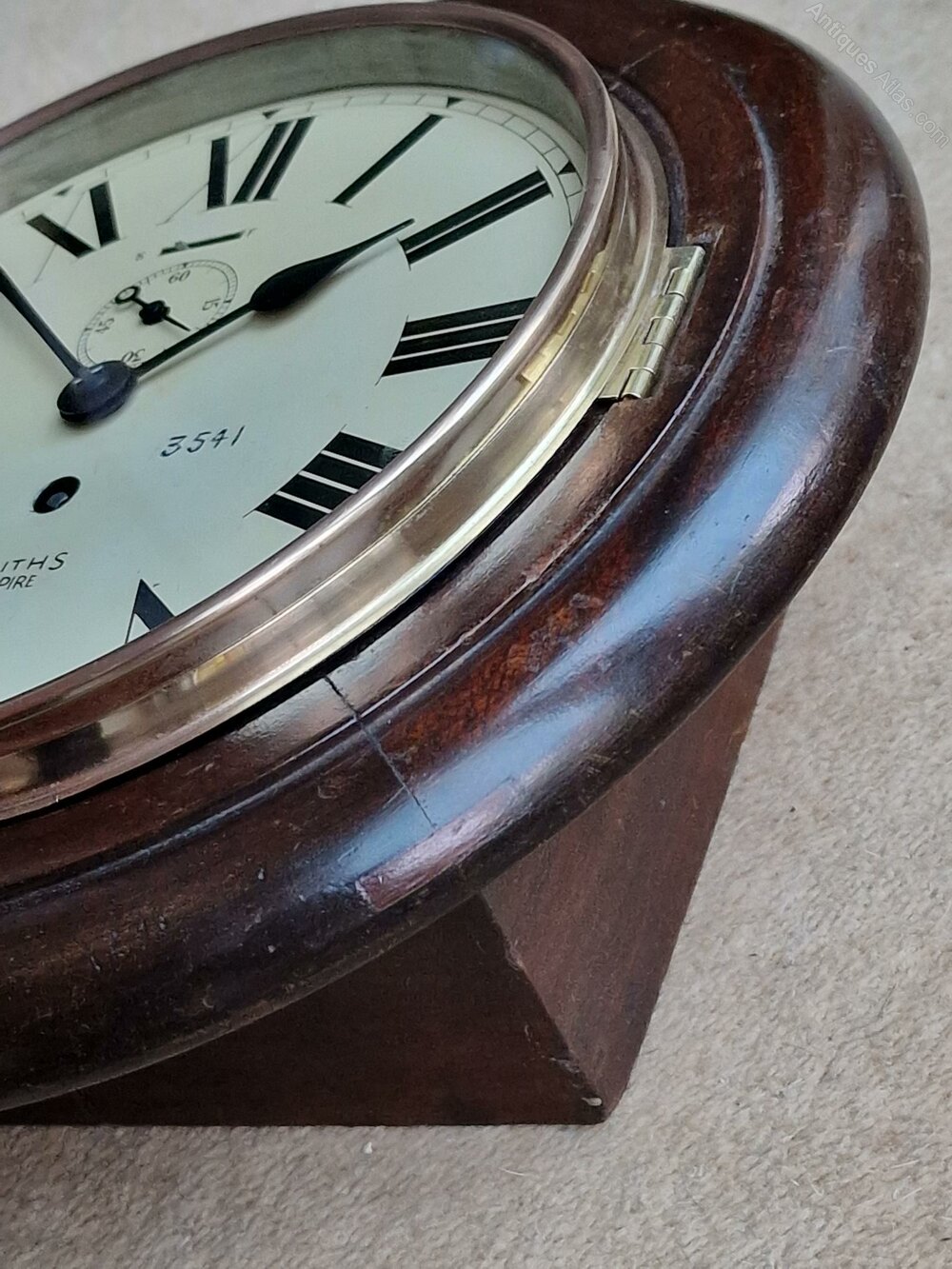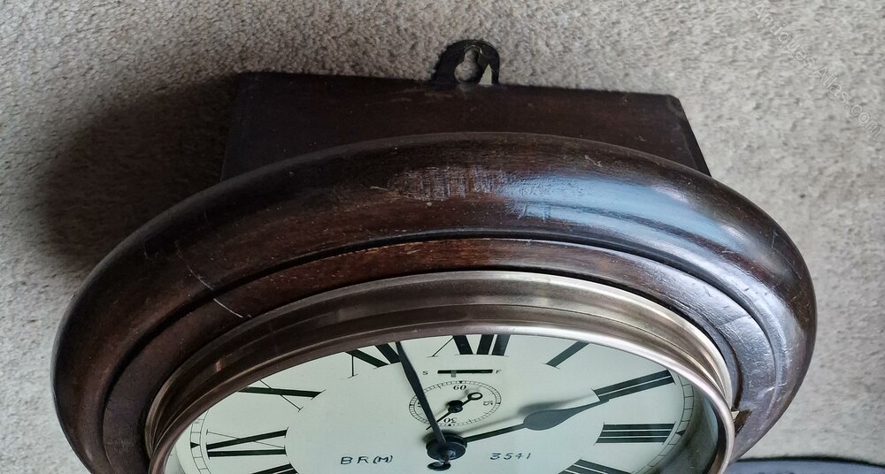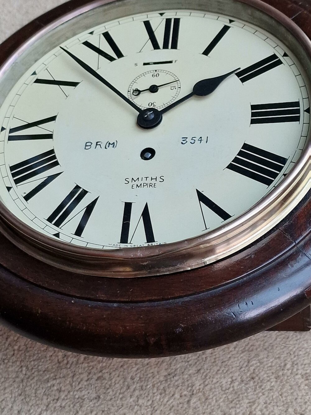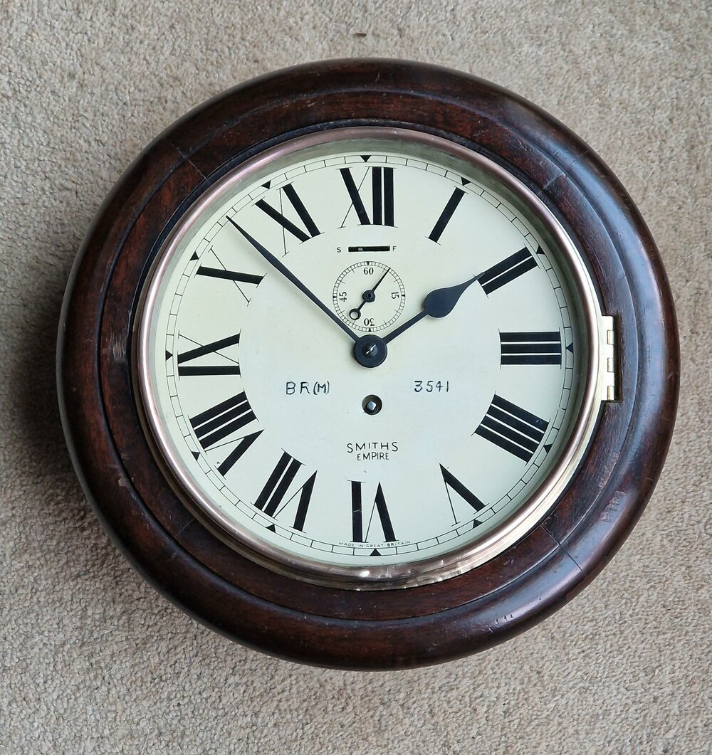 A 1950's railways dial wall clock. A smaller, 8" painted dial signed 'BR(M) 3541, SMITHS EMPIRE' with blued steel hands. A walnut case with a brass bezel surround. An 8-day duration Smiths timepiece mechanism. Circa 1950.Smiths supplied the railways with 'station' clocks. This example is from British Railways Midlands region. There are indistinct 24 hour markers on the inside edge of the dial as often seen on railway use examples.